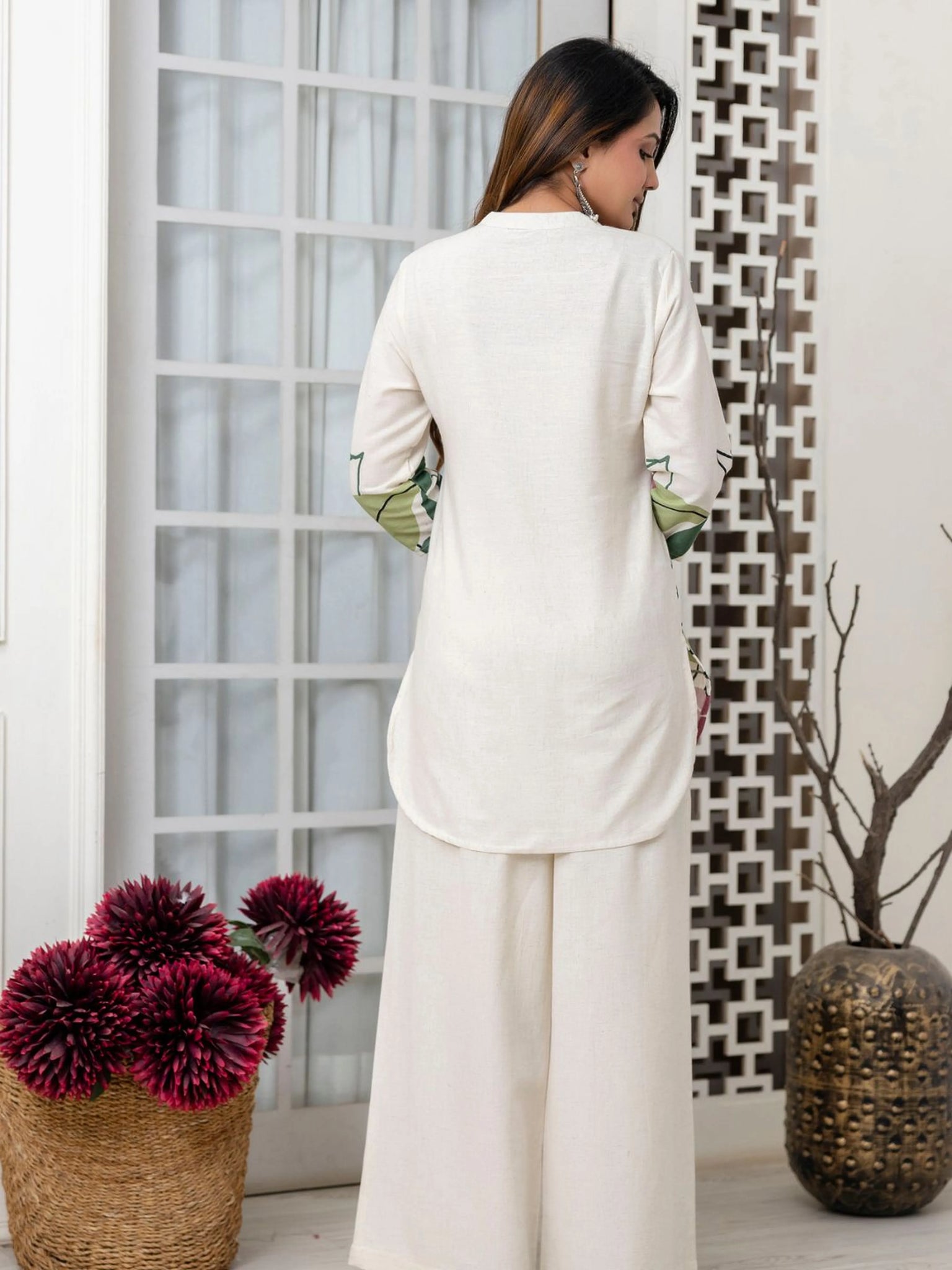 Verdant Petal Studio: Cream Botanical Leaf Kurta & Wide-Leg Co-ord Set in Cotton Flex