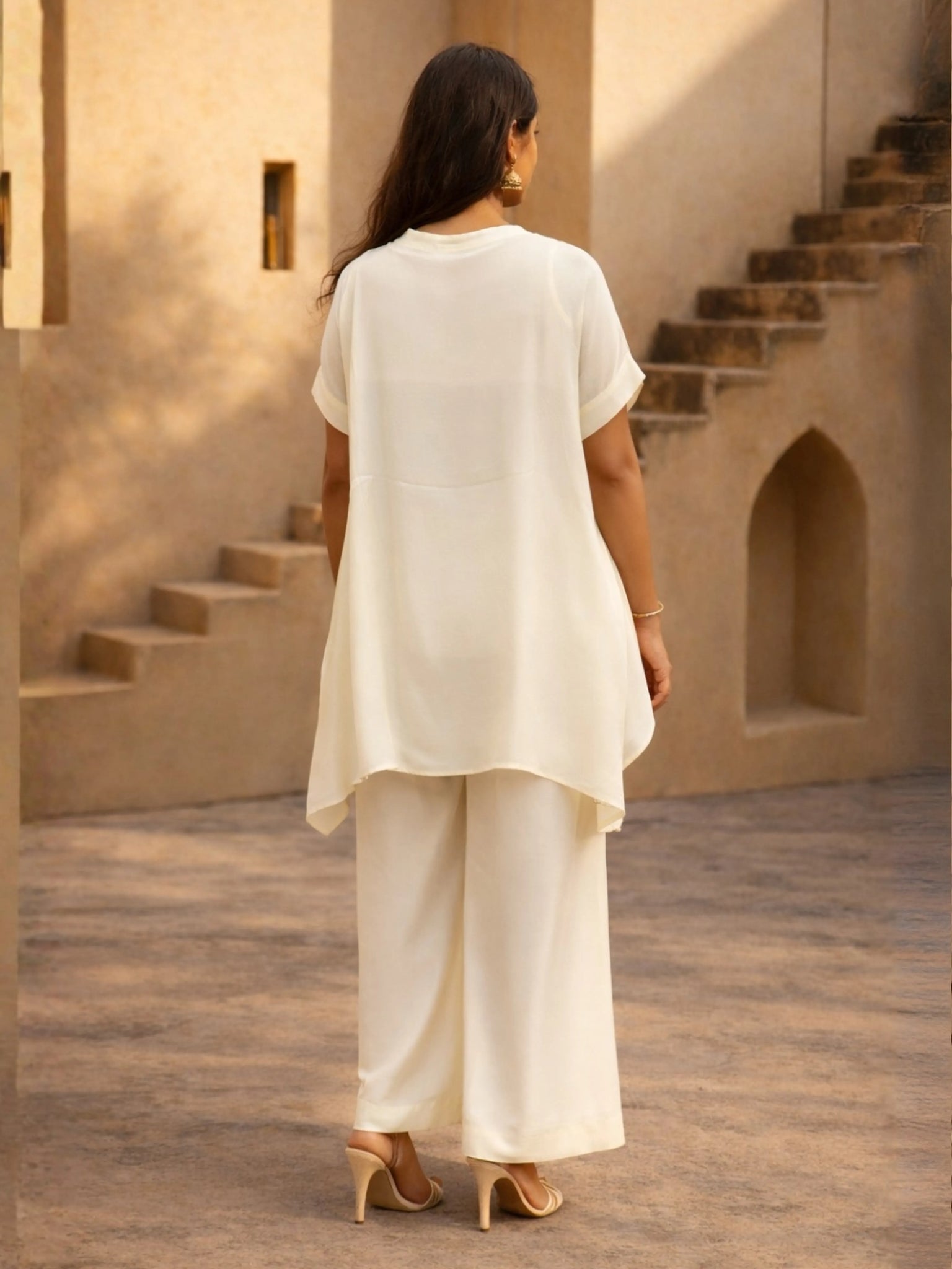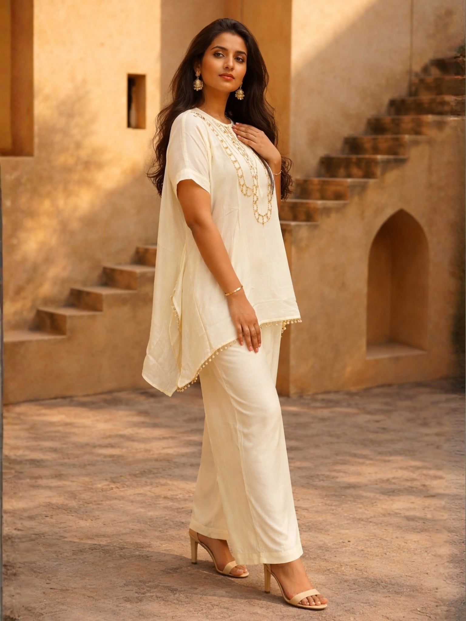 Gracefully minimal with a touch of artisanal sparkle, this cream white co-ord set is designed for women who appreciate refined elegance in fluid silhouettes. Crafted in soft, breathable crepe, the ensemble blends comfort with statement detailing—making it a timeless choice for elevated daywear and intimate festive occasions.
