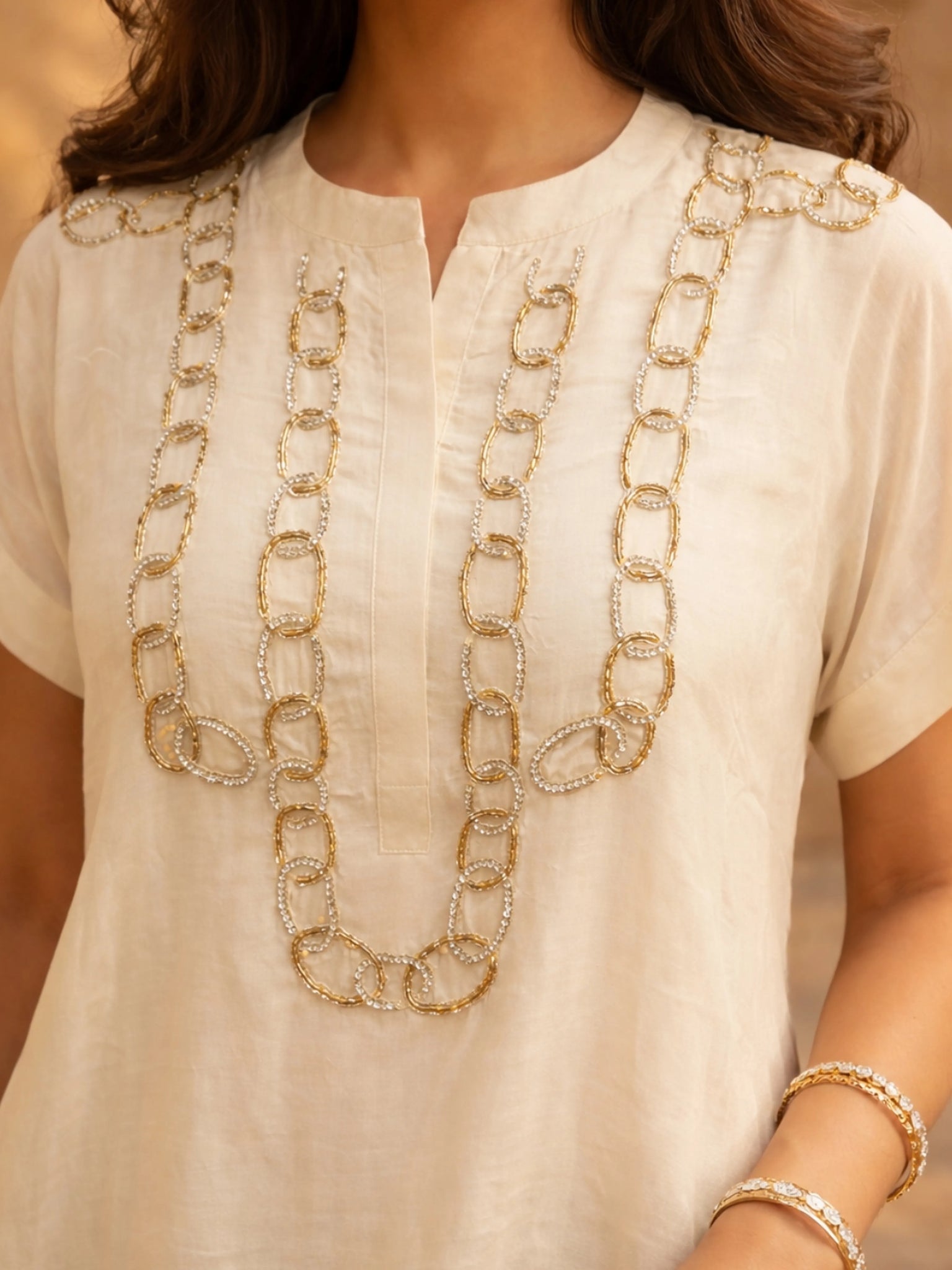 • Neckline: Mandarin collar with rhinestone & bead embroidered chain-link pattern