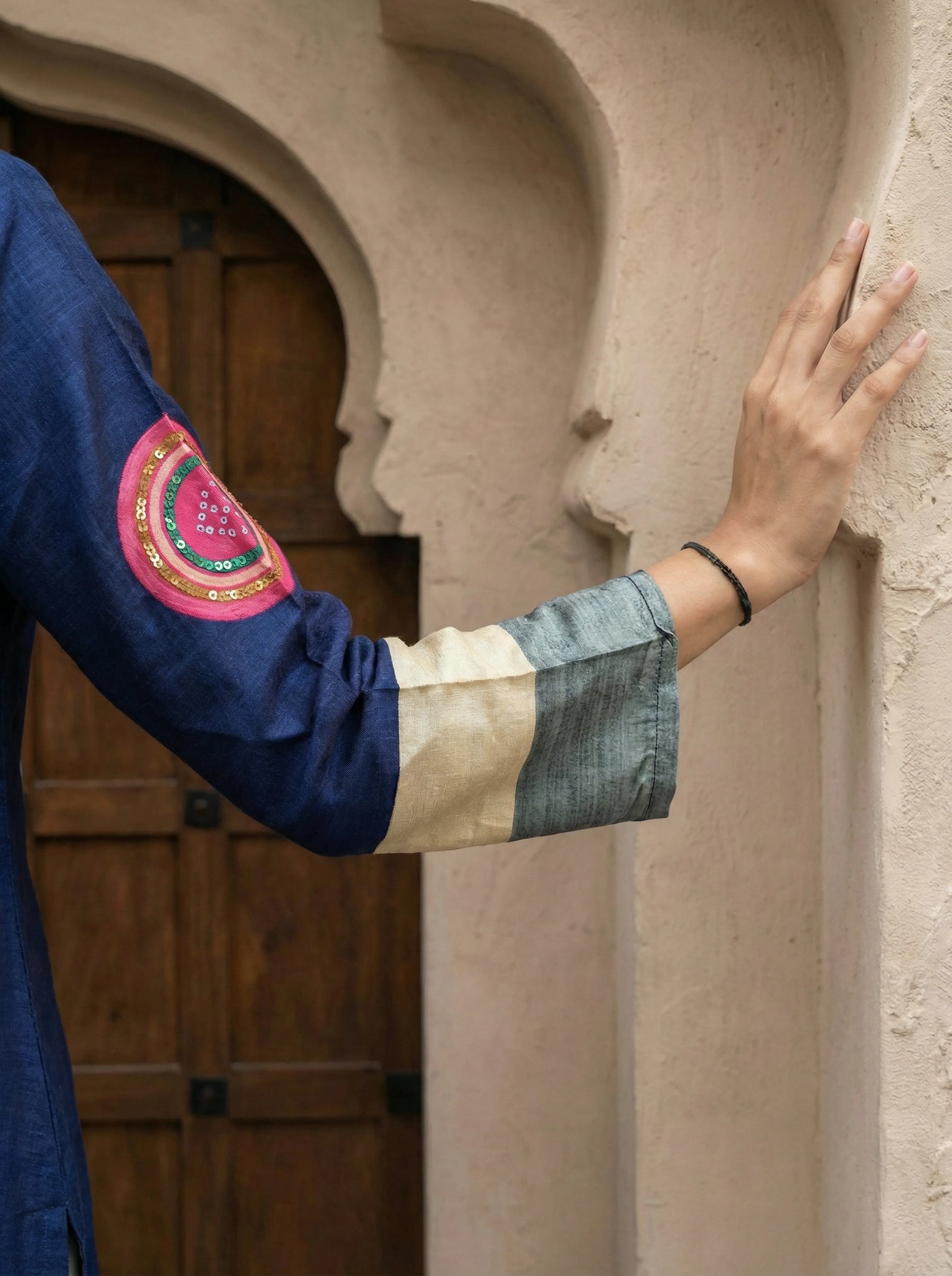 Designed with 3/4th sleeves, the kurta ensures versatile wearability while maintaining a polished look. The sleeves feature coordinated color detailing that seamlessly ties into the overall design language. The silhouette flows into a high-low hemline, allowing ease of movement while adding a modern, asymmetric edge to the ensemble.