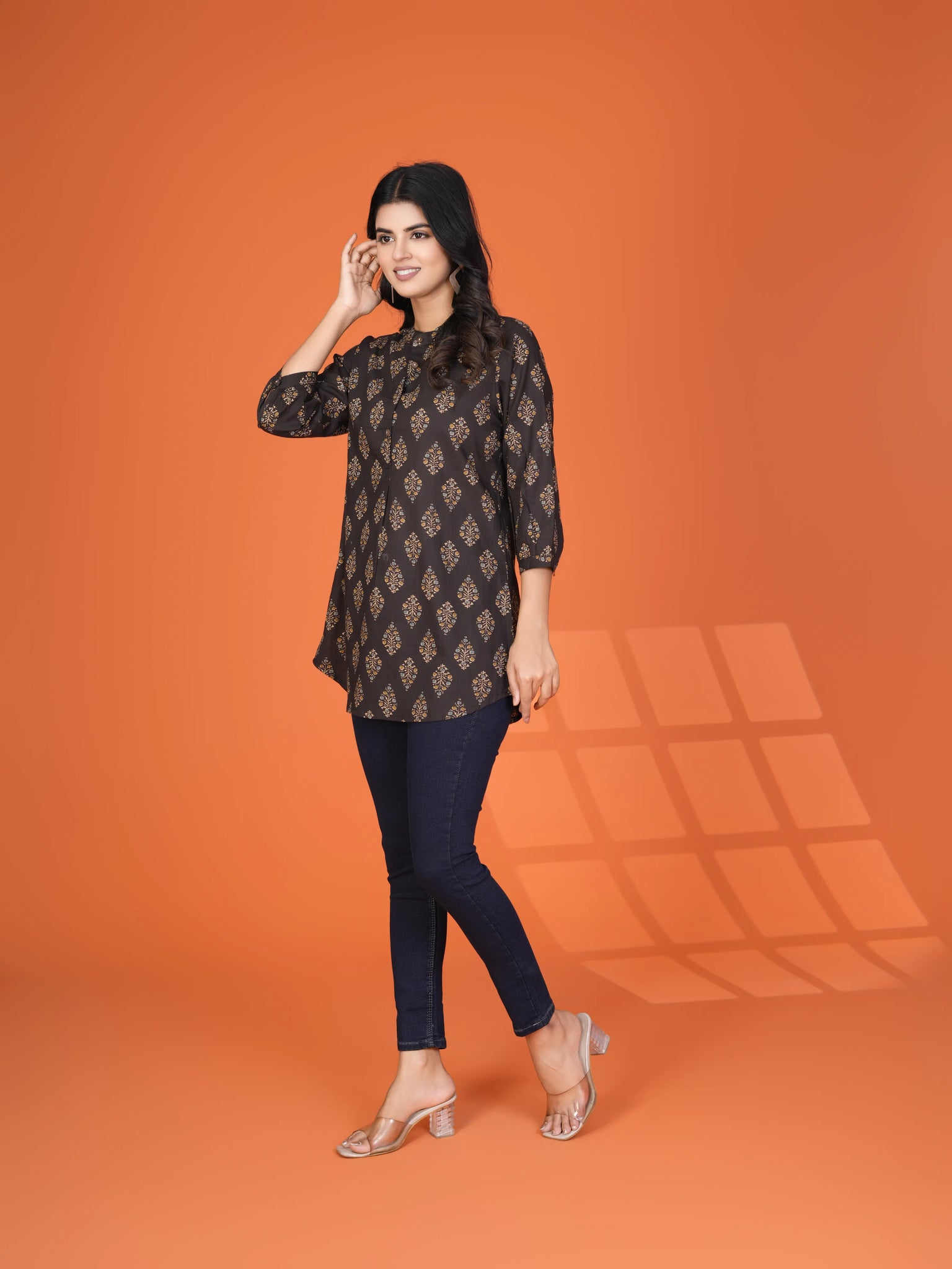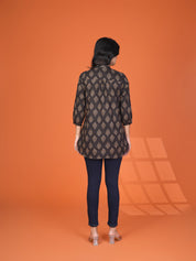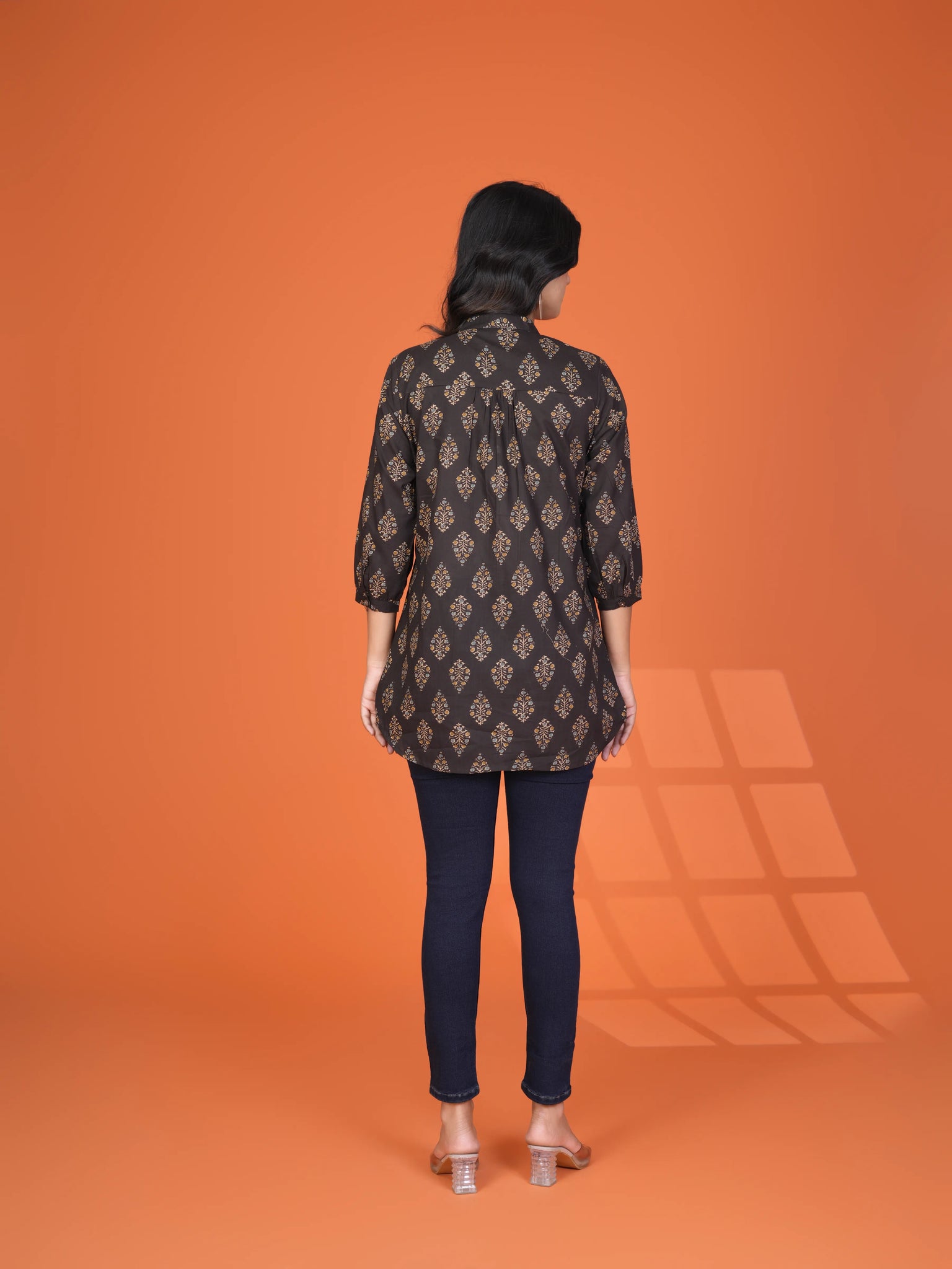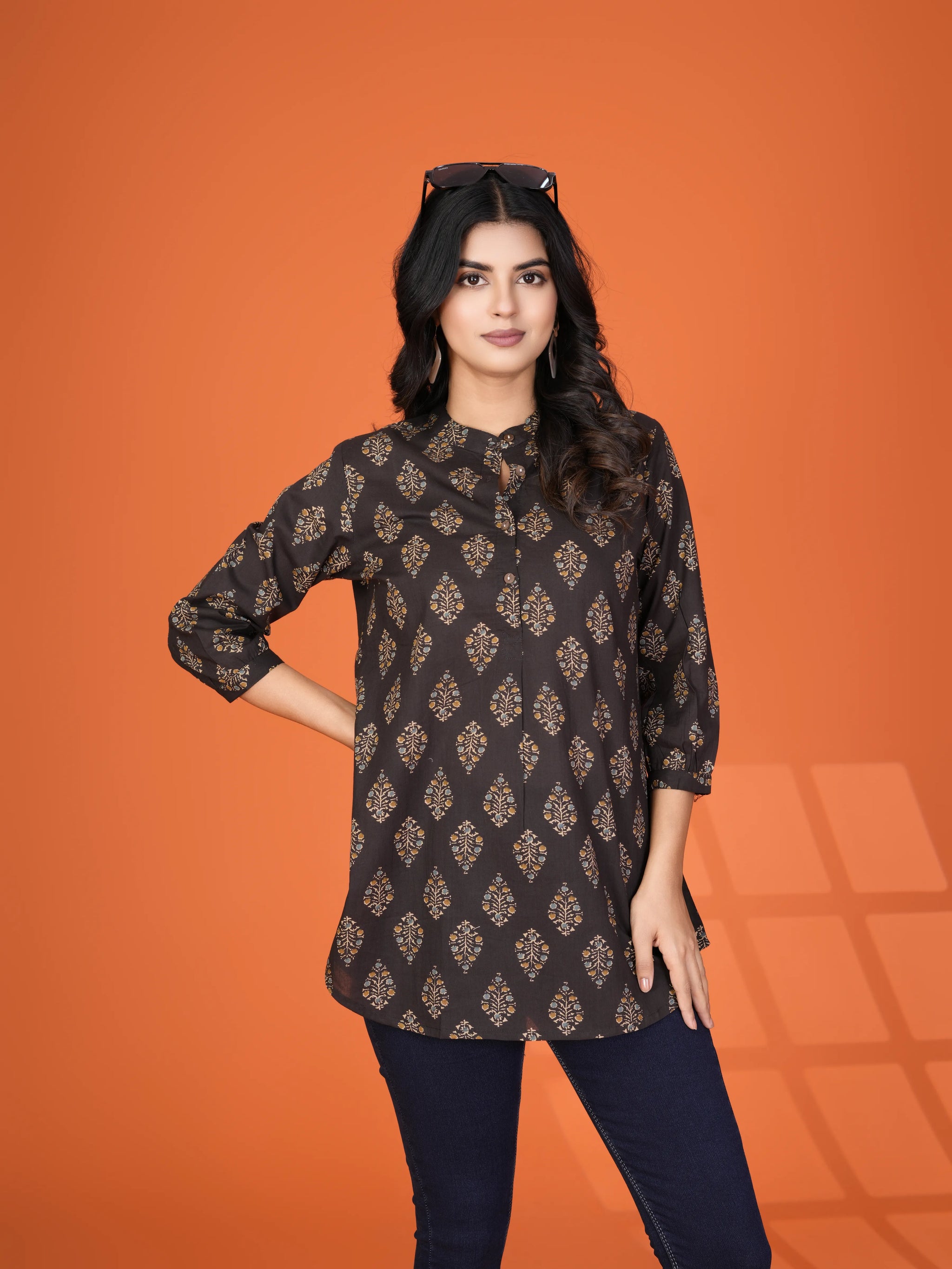 Earthen Bloom: Dark Brown Handblock Print Short Kurti in Cotton Cambric