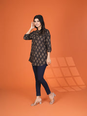The design features a smart mandarin collar, wooden button-down front, and 3/4th sleeves with gathered detail for ease of movement. The print placement offers symmetry and structure, making it a staple for both minimal ethnic dressing and fusion styles.