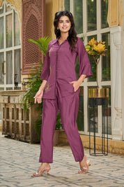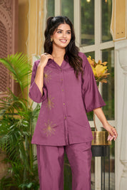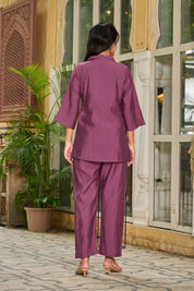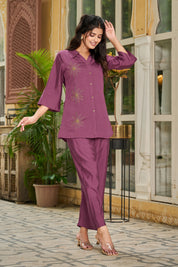 Command elegance in Grape Glimmer, a luxurious co-ord set crafted in silky smooth Roman fabric. Drenched in a rich dark purple hue, this set is delicately elevated with hand-detailed golden beaded floral motifs that shimmer with understated grace.