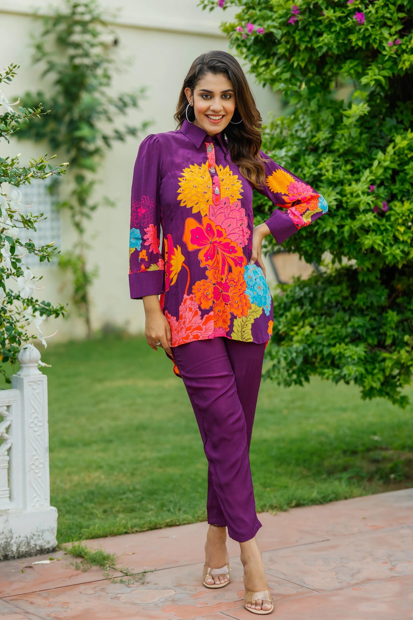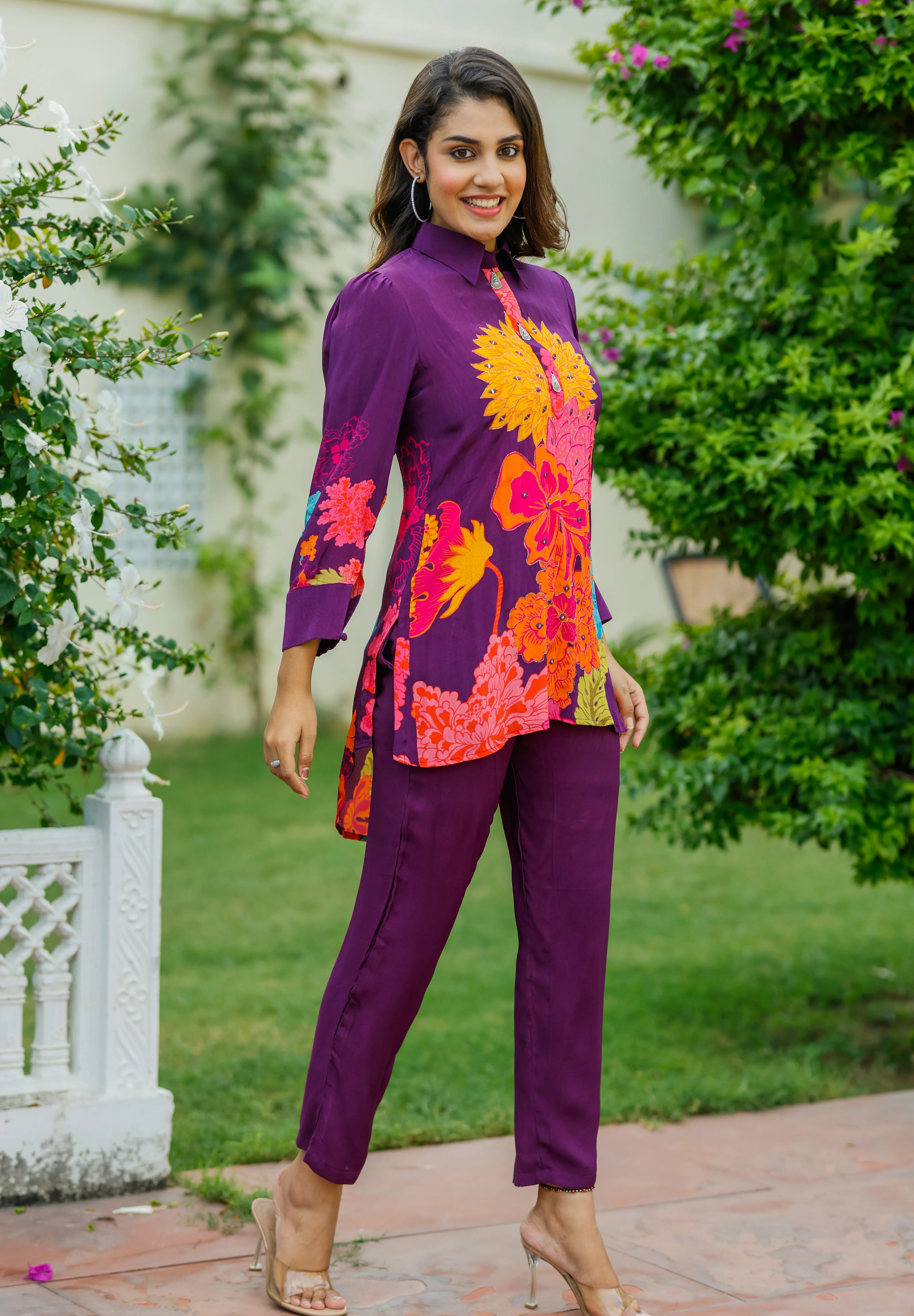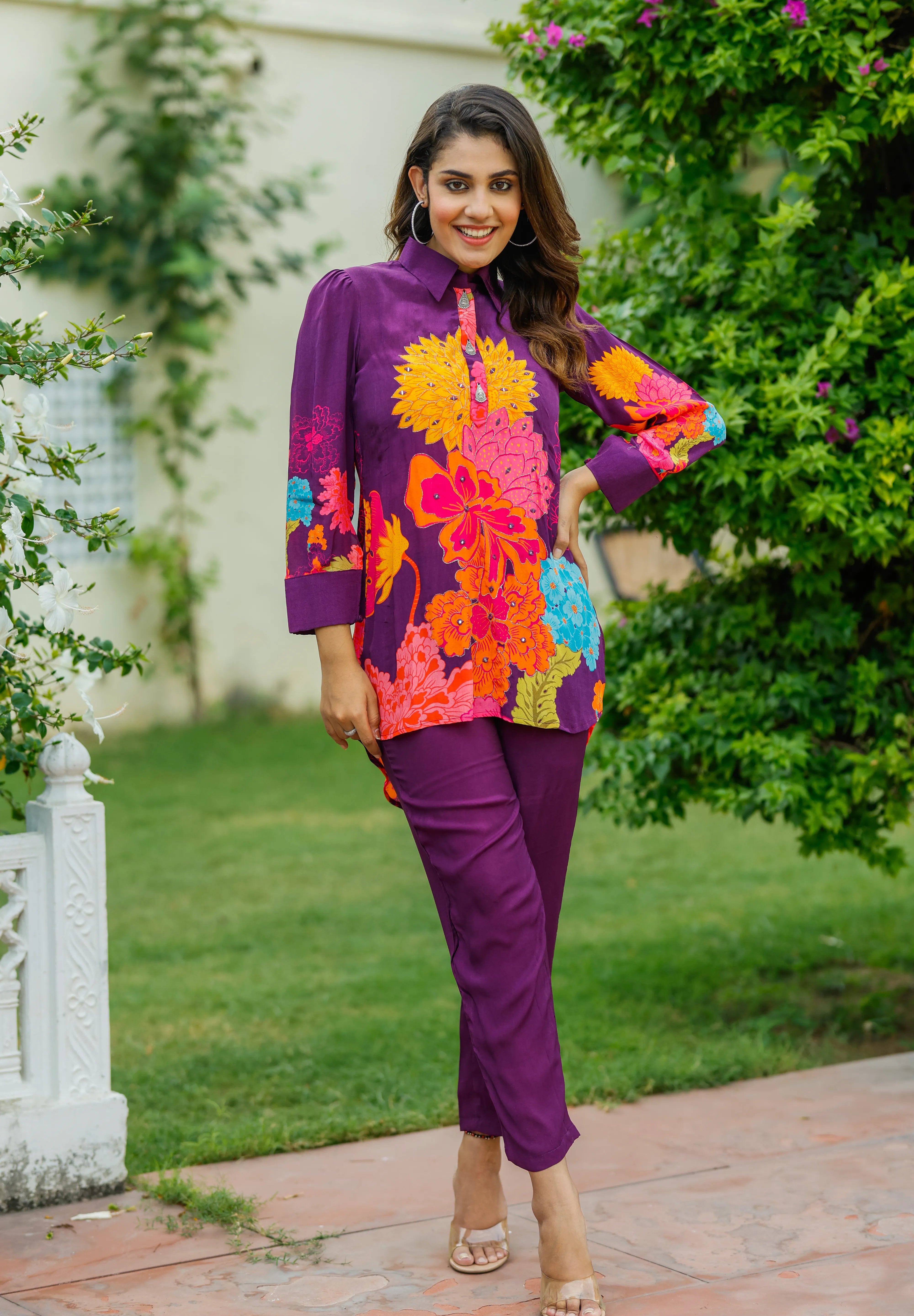Perfect for making a statement, this Dark Purple Floral Crepe Abstract Mirror Work Co-Ord Set will surely turn heads wherever you go.