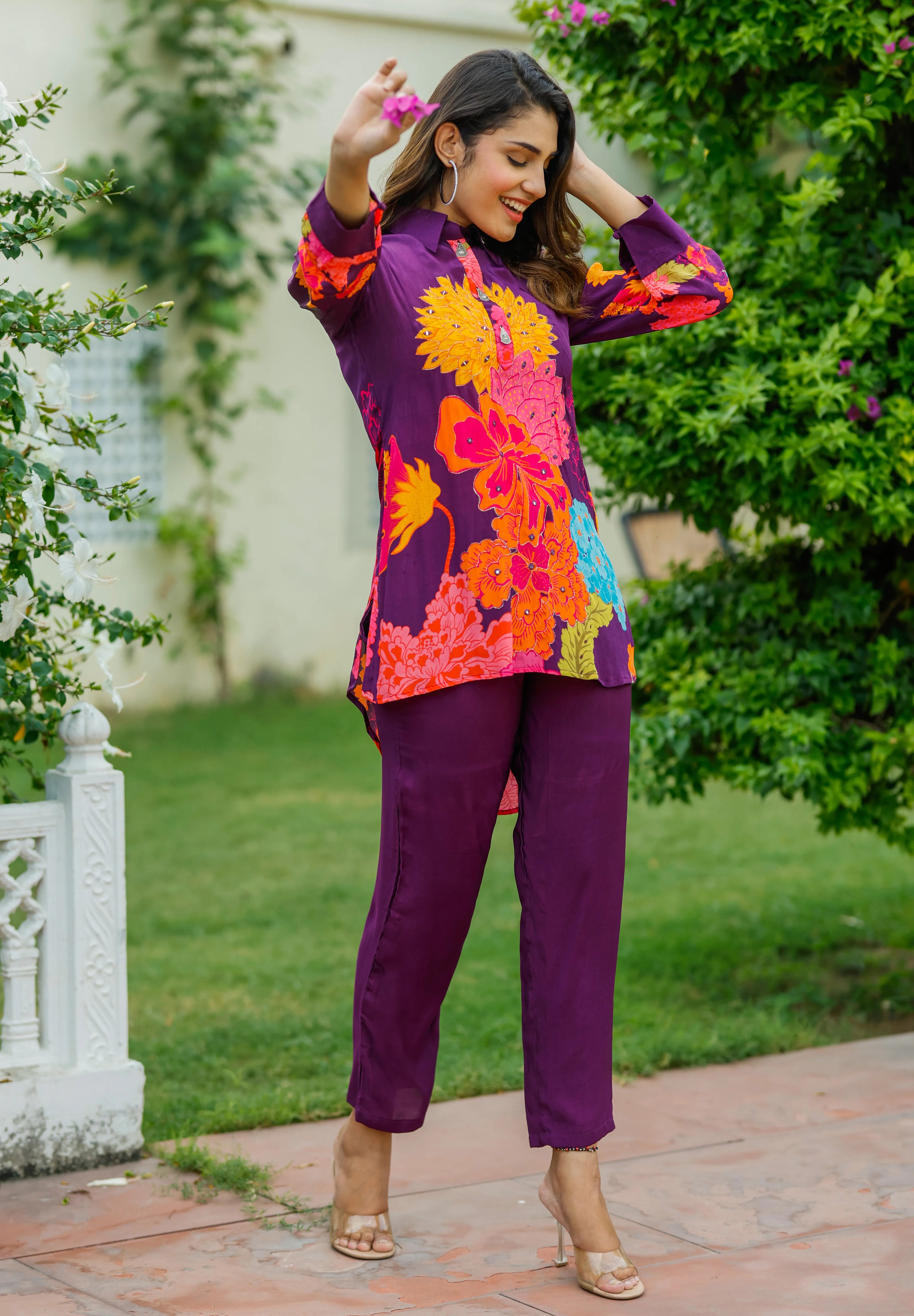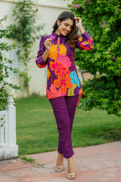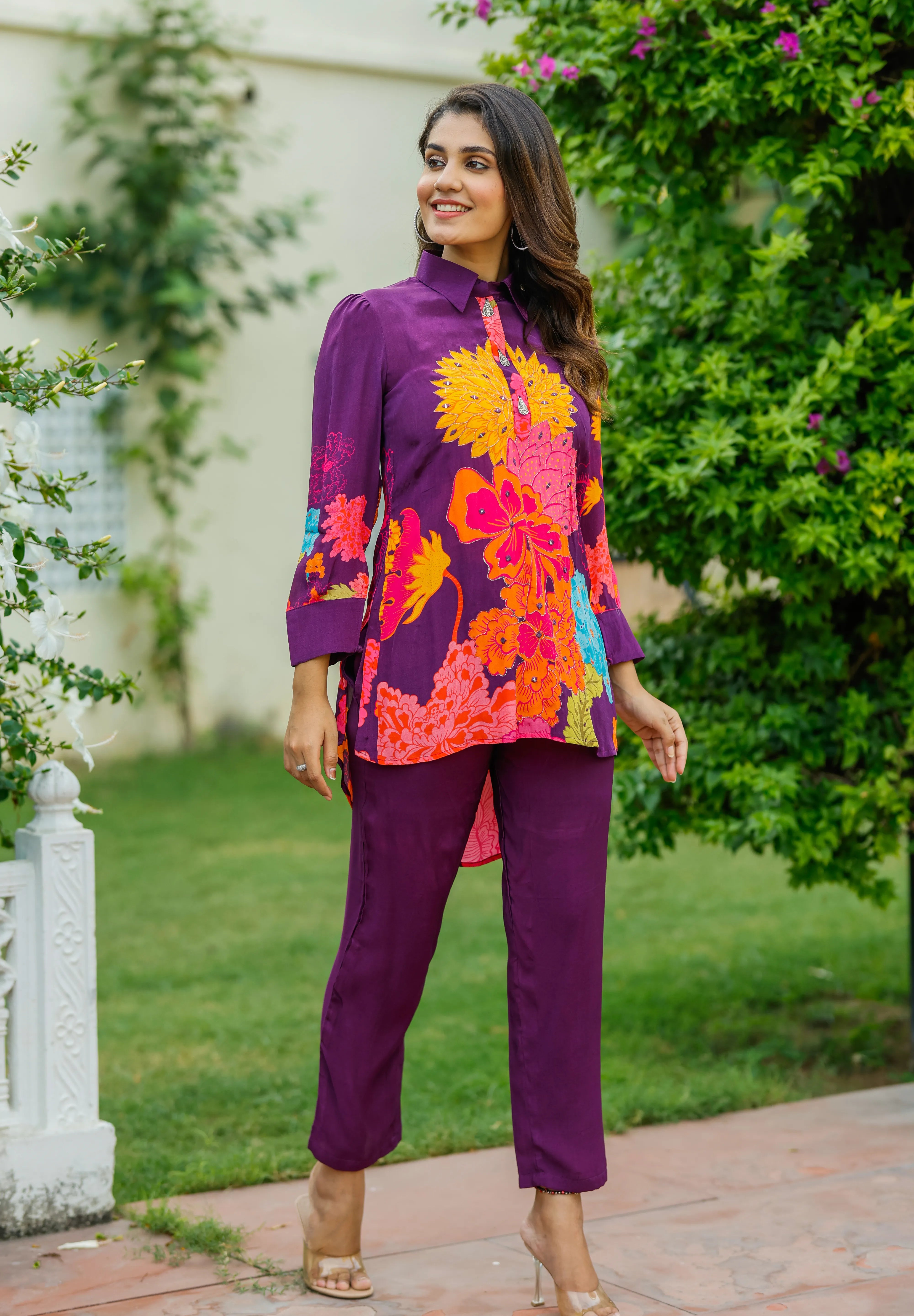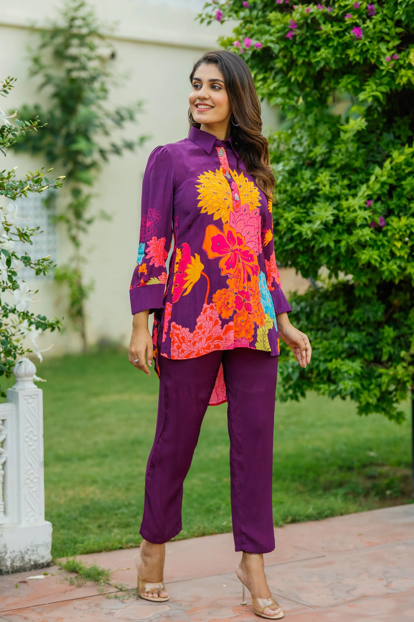Perfect for making a statement, this Dark Purple Floral Crepe Abstract Mirror Work Co-Ord Set will surely turn heads wherever you go.