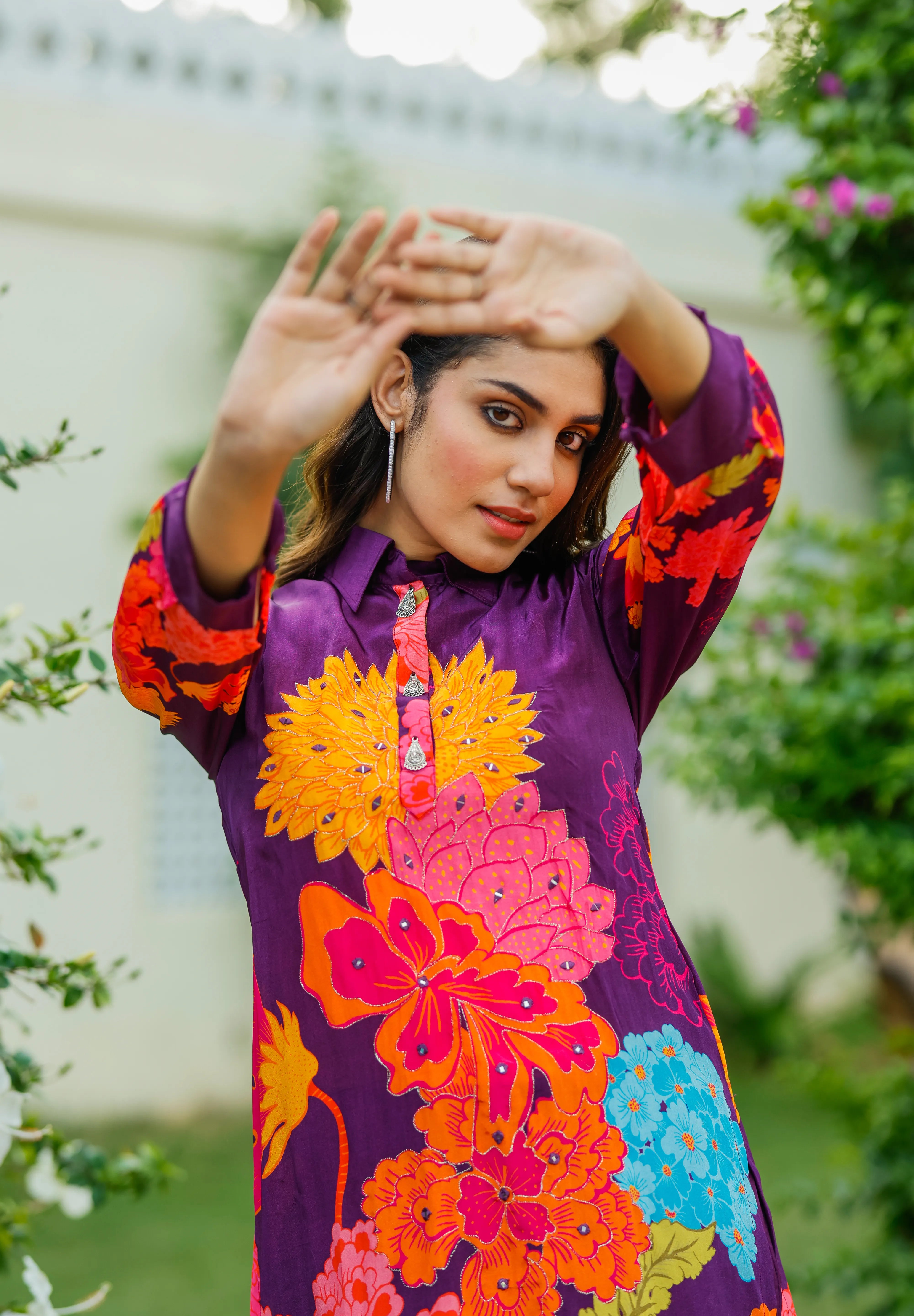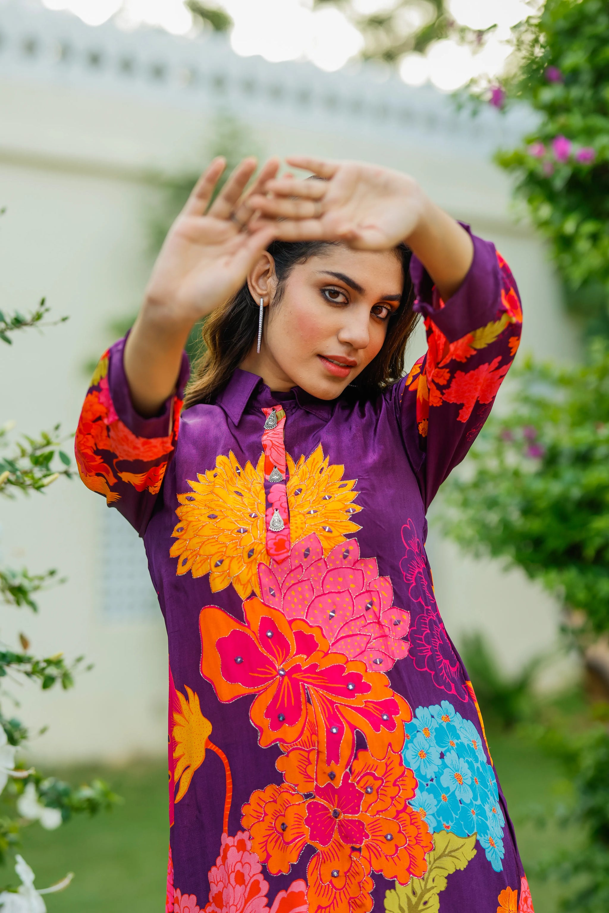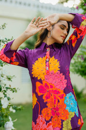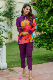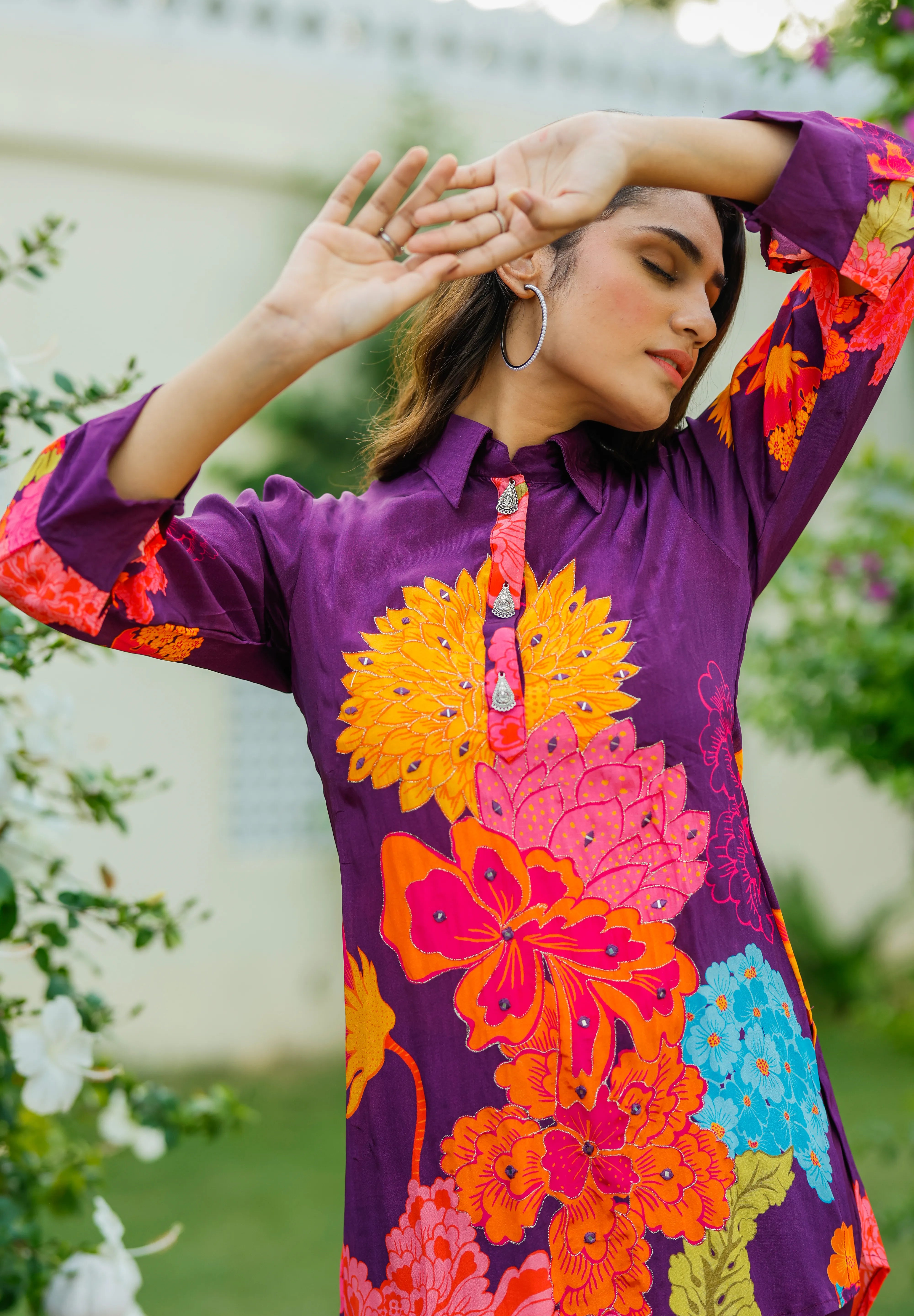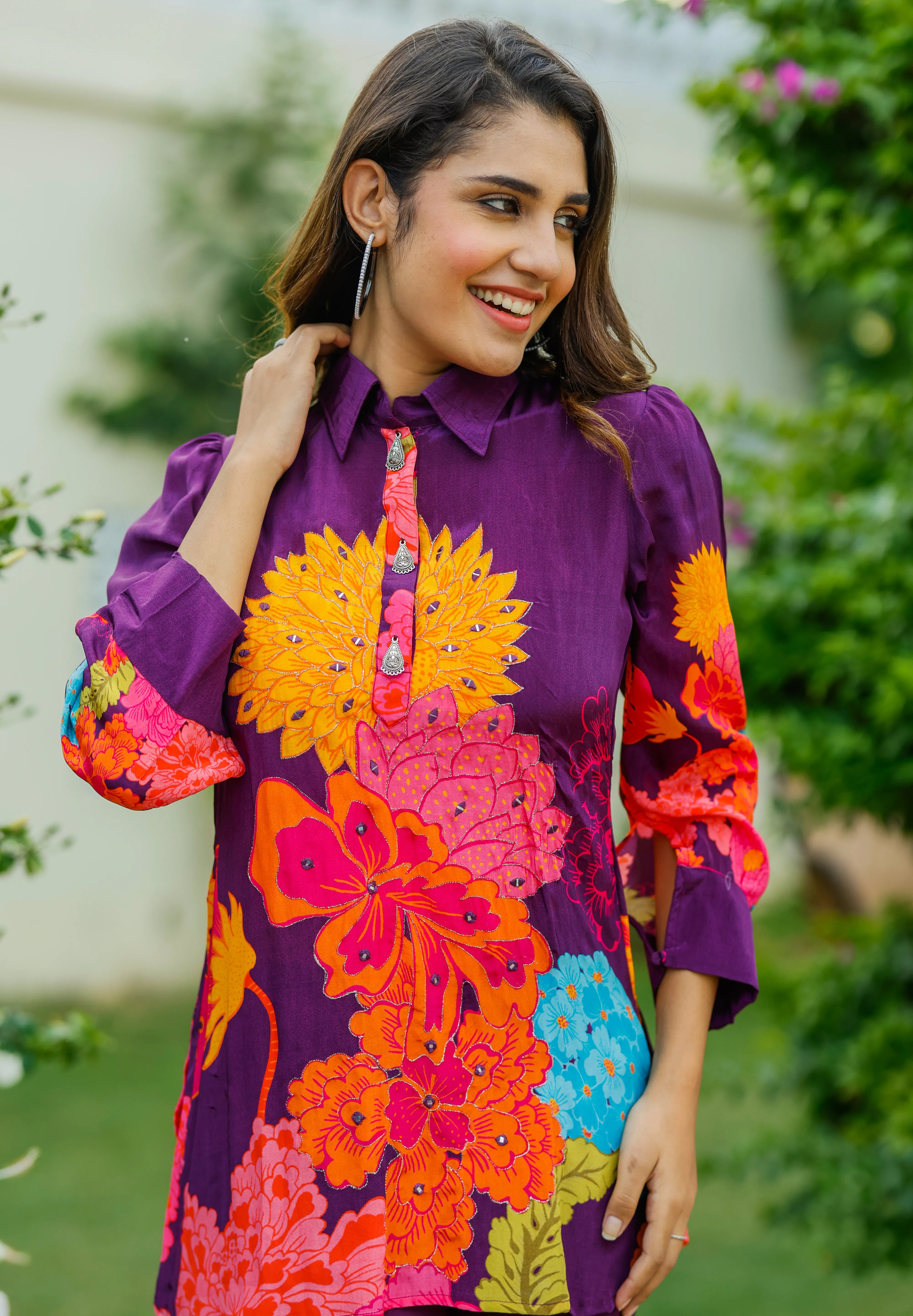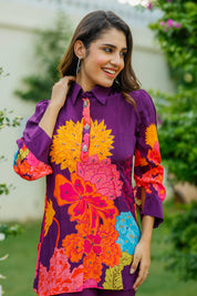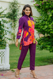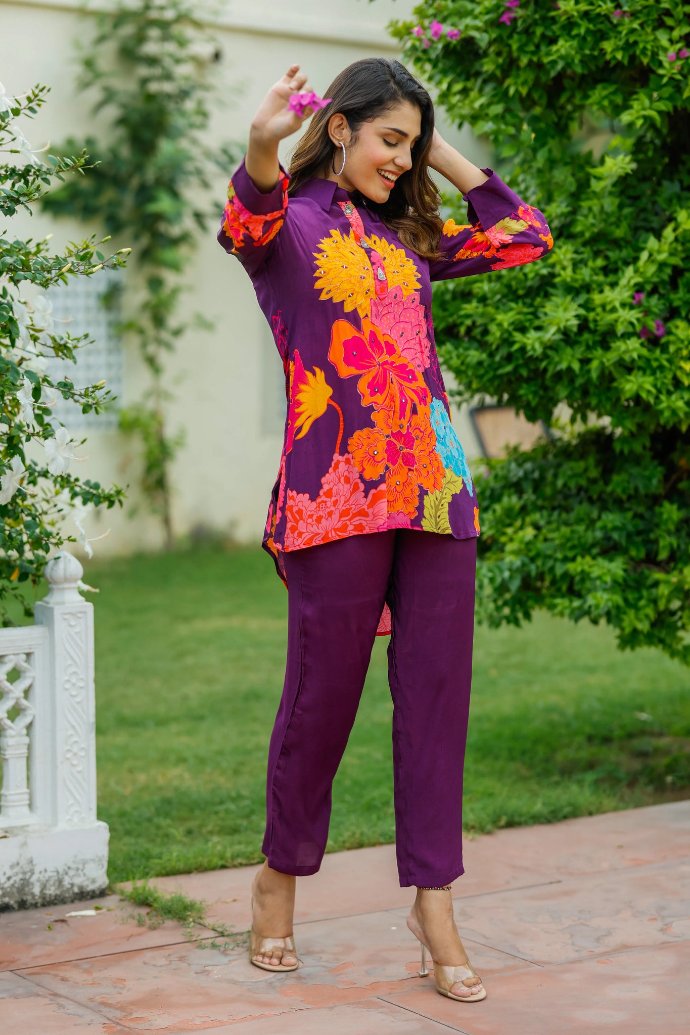 Dark Purple Floral Crepe Abstract Mirror Work Co-Ord Set