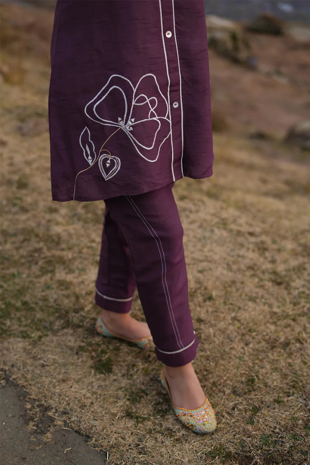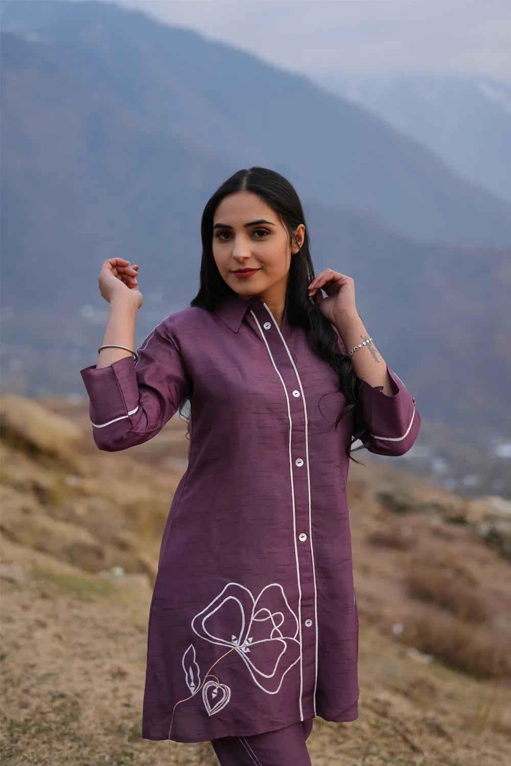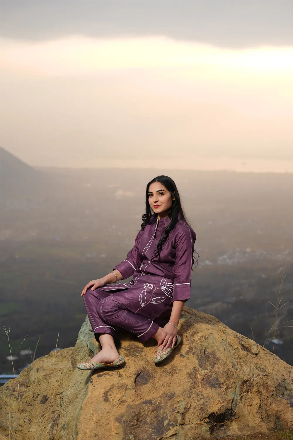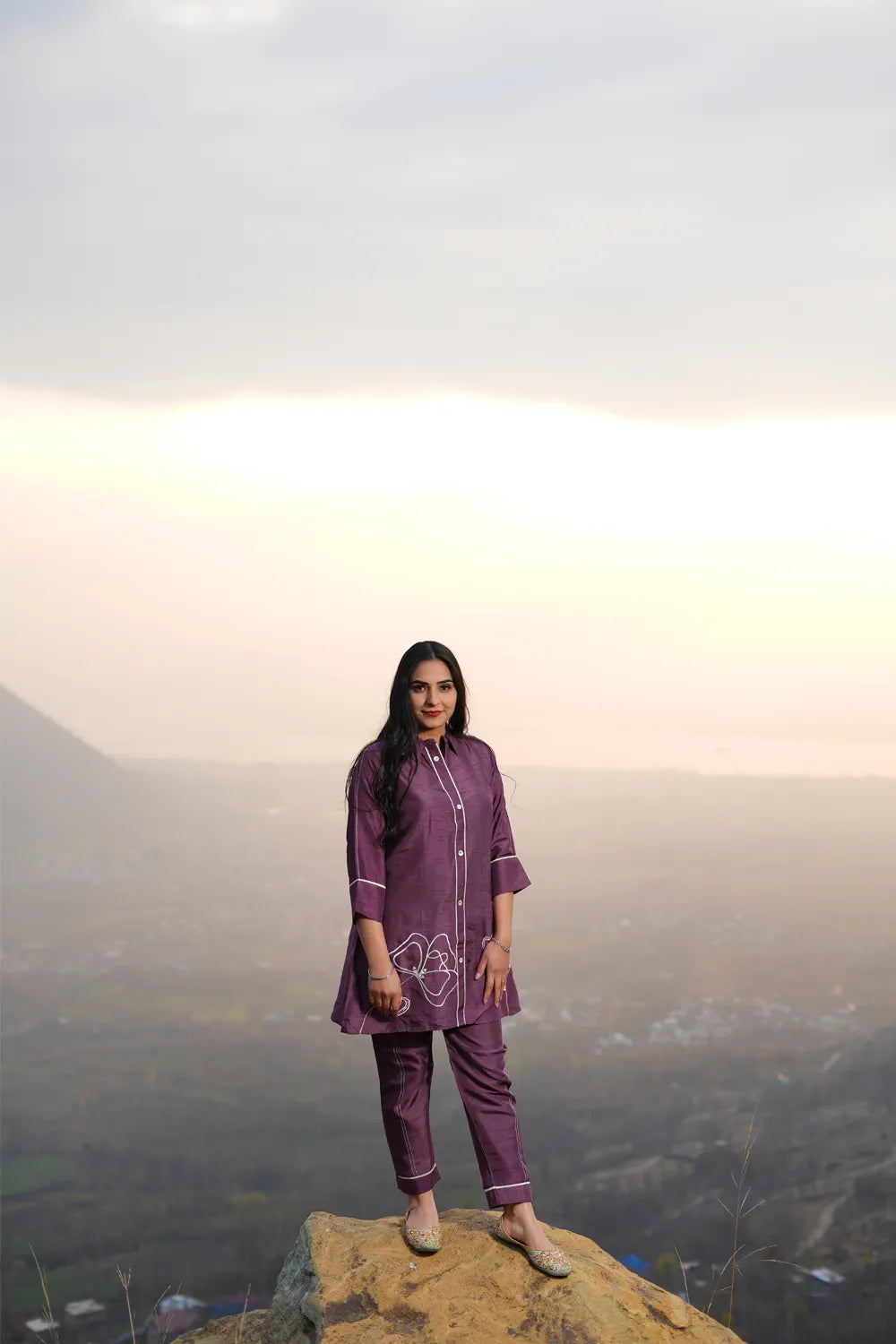 Step into elegance with the Purple Dola Silk Thread Work Co-Ord Set from Divija. This stunning set, crafted from premium Dola Silk, is designed to showcase intricate threadwork details, bringing a sophisticated and luxurious feel to your wardrobe.
