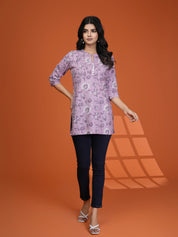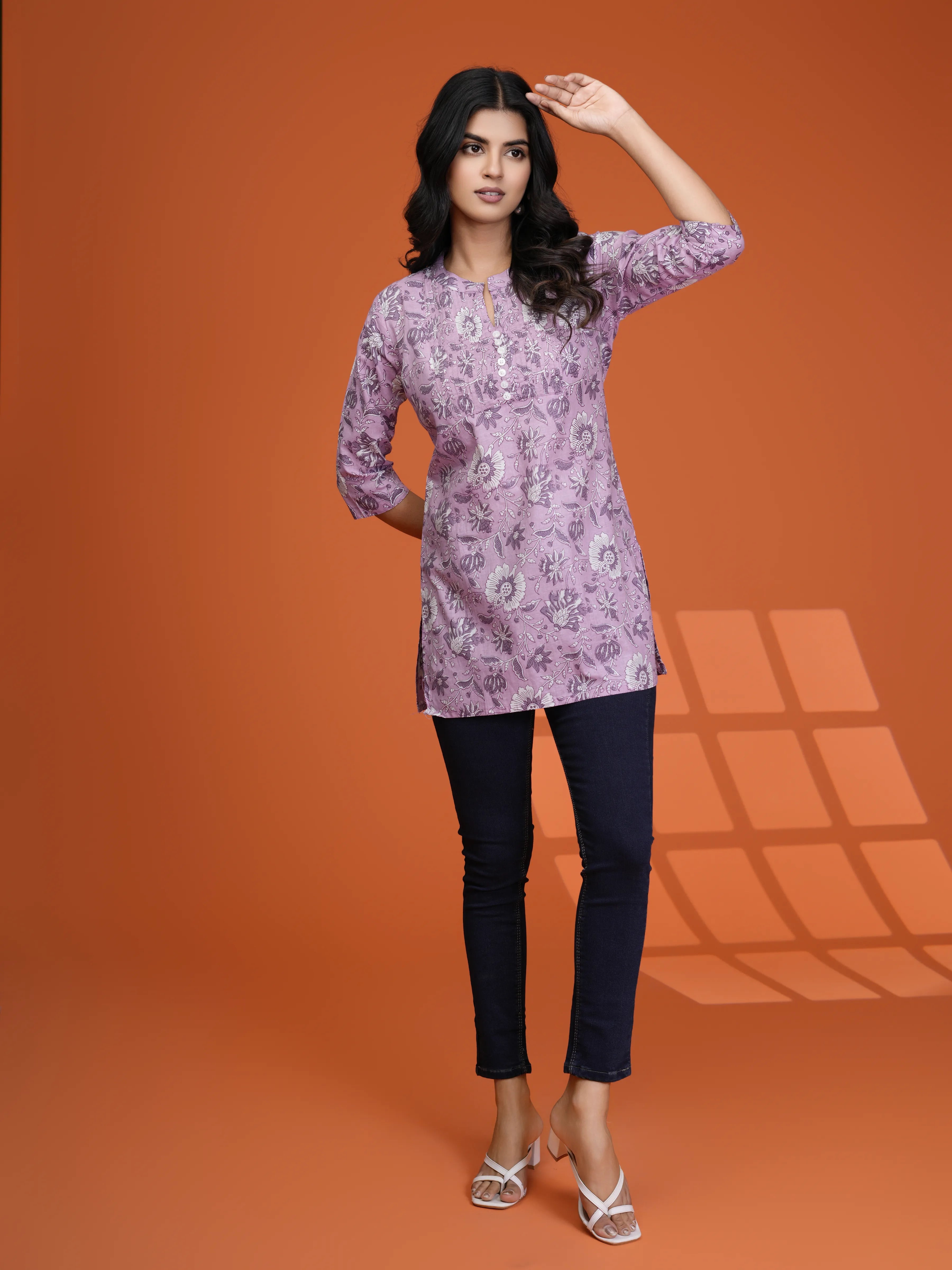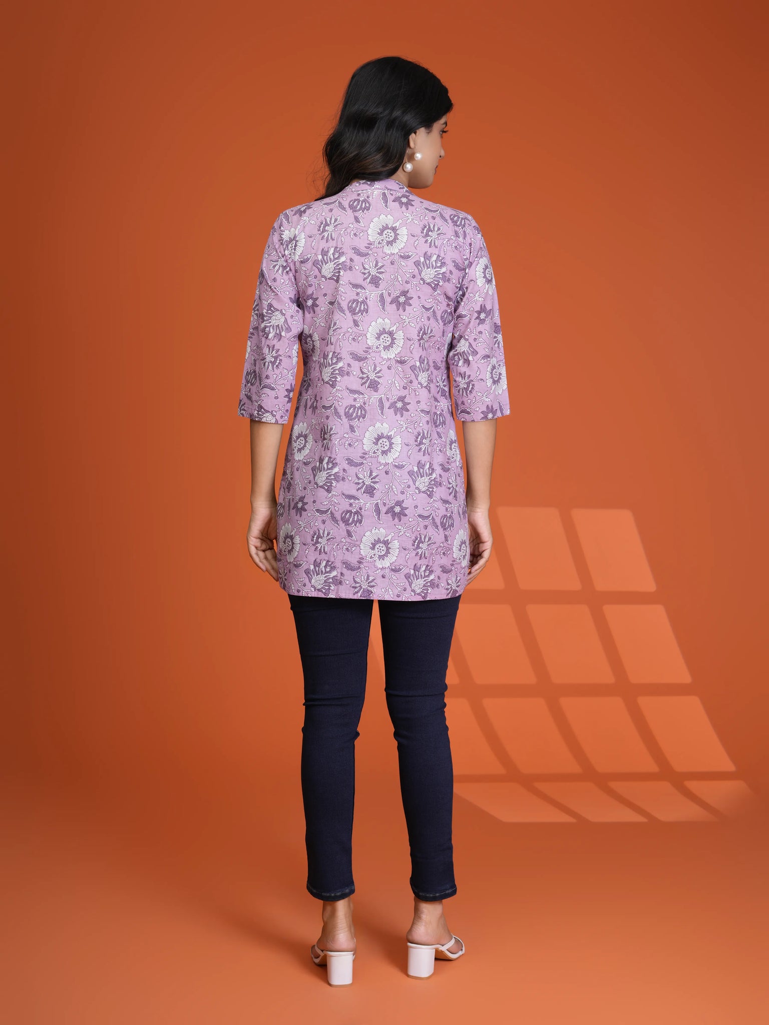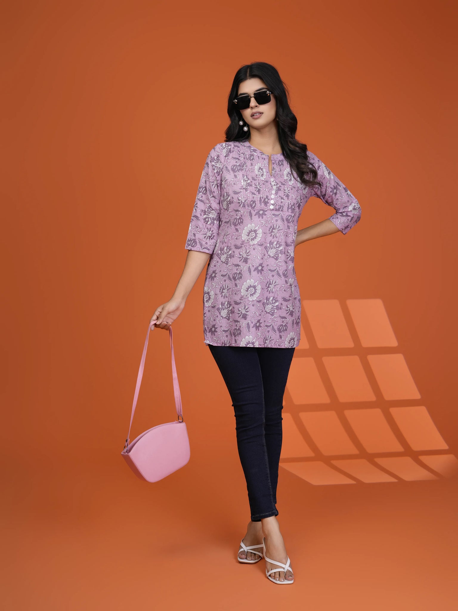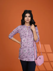 Add a soft pop of charm to your everyday wardrobe with our Lavender Bloom short kurti. Drenched in a dreamy dusty lavender hue and adorned with delicate all-over floral prints, this piece is the epitome of casual grace.