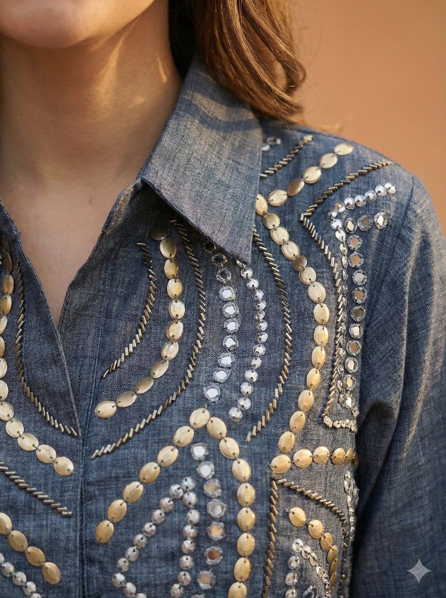 The top features a sharp shirt collar, lending a structured and contemporary edge to the silhouette. The front is beautifully adorned with intricate sequin and bead embroidery, arranged in geometric-inspired patterns that create a striking yet balanced visual composition. The embellishments add subtle shimmer and texture, elevating the piece while maintaining a refined aesthetic.
