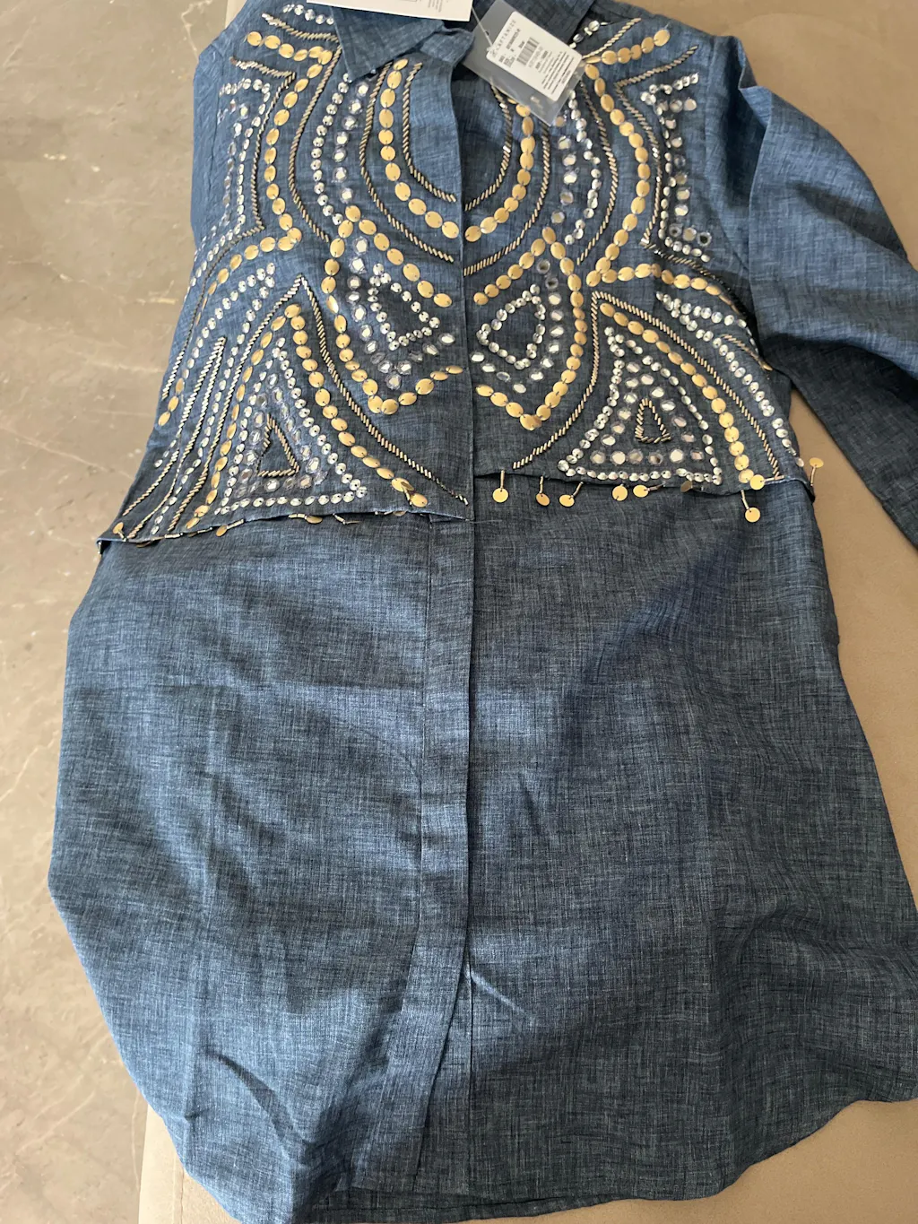 The top features a sharp shirt collar, lending a structured and contemporary edge to the silhouette. The front is beautifully adorned with intricate sequin and bead embroidery, arranged in geometric-inspired patterns that create a striking yet balanced visual composition. The embellishments add subtle shimmer and texture, elevating the piece while maintaining a refined aesthetic.