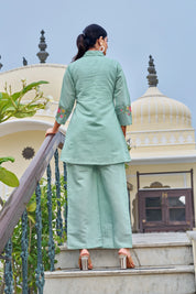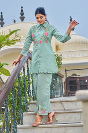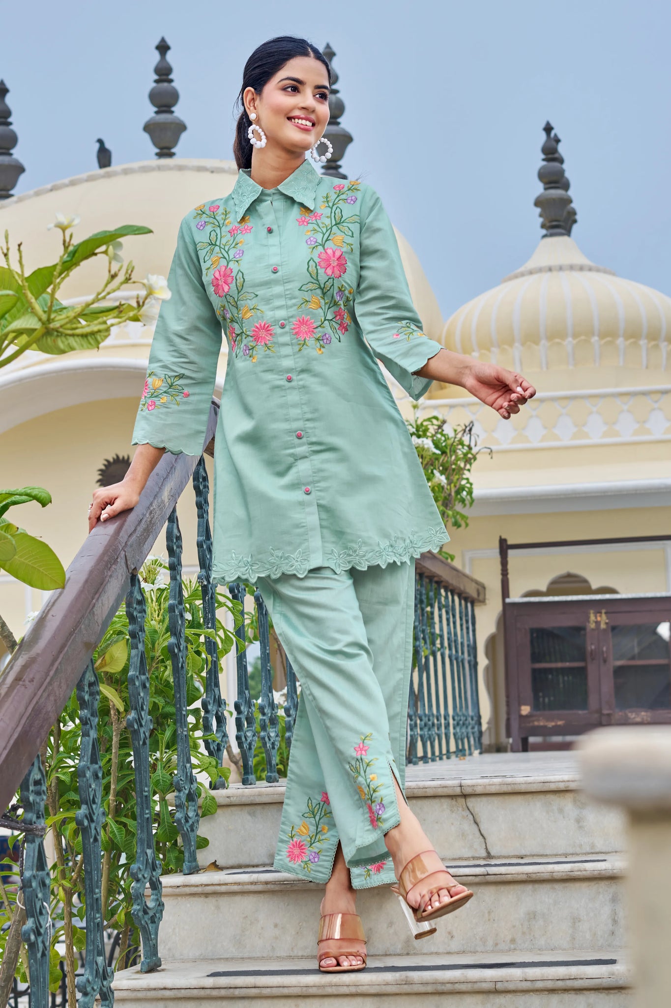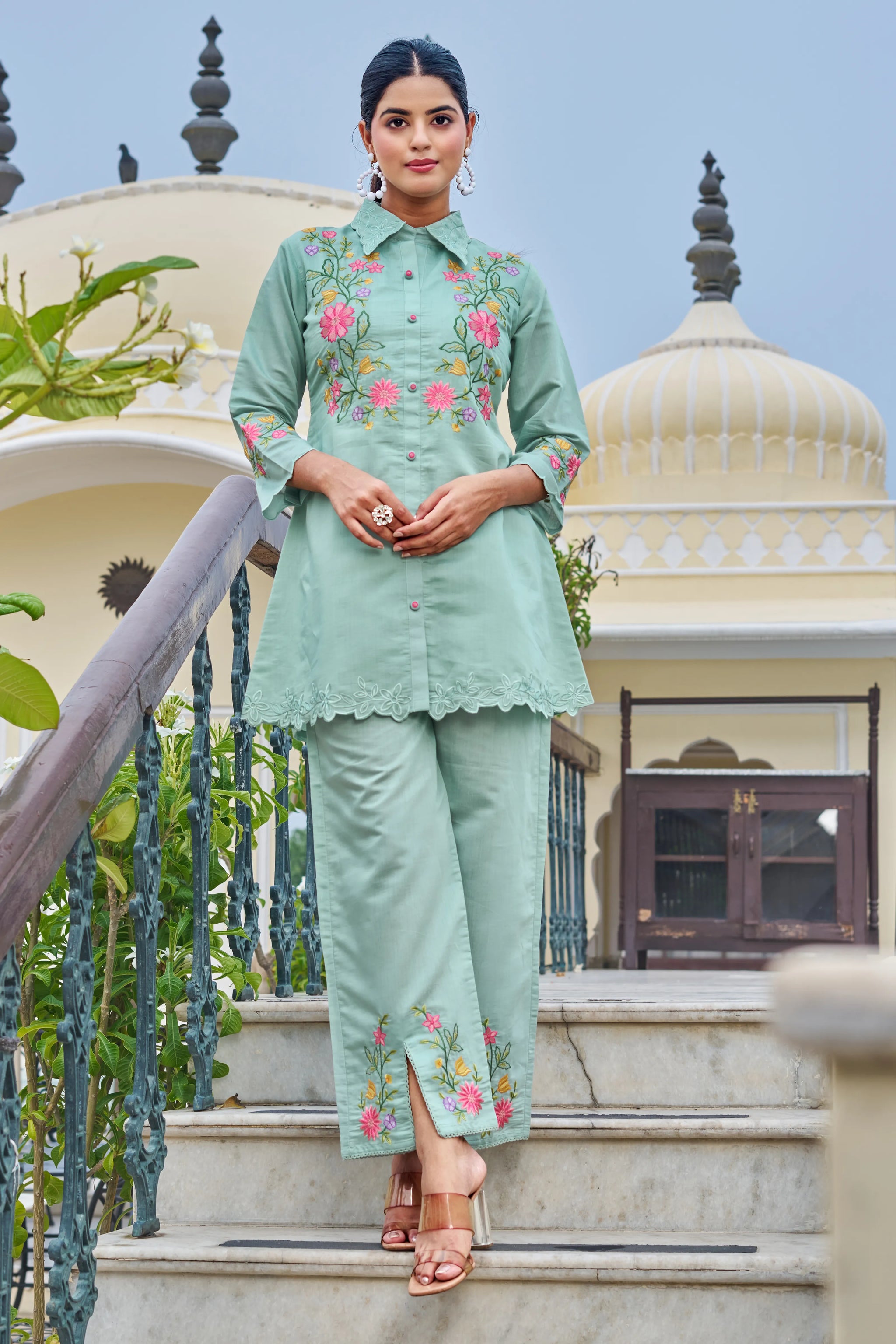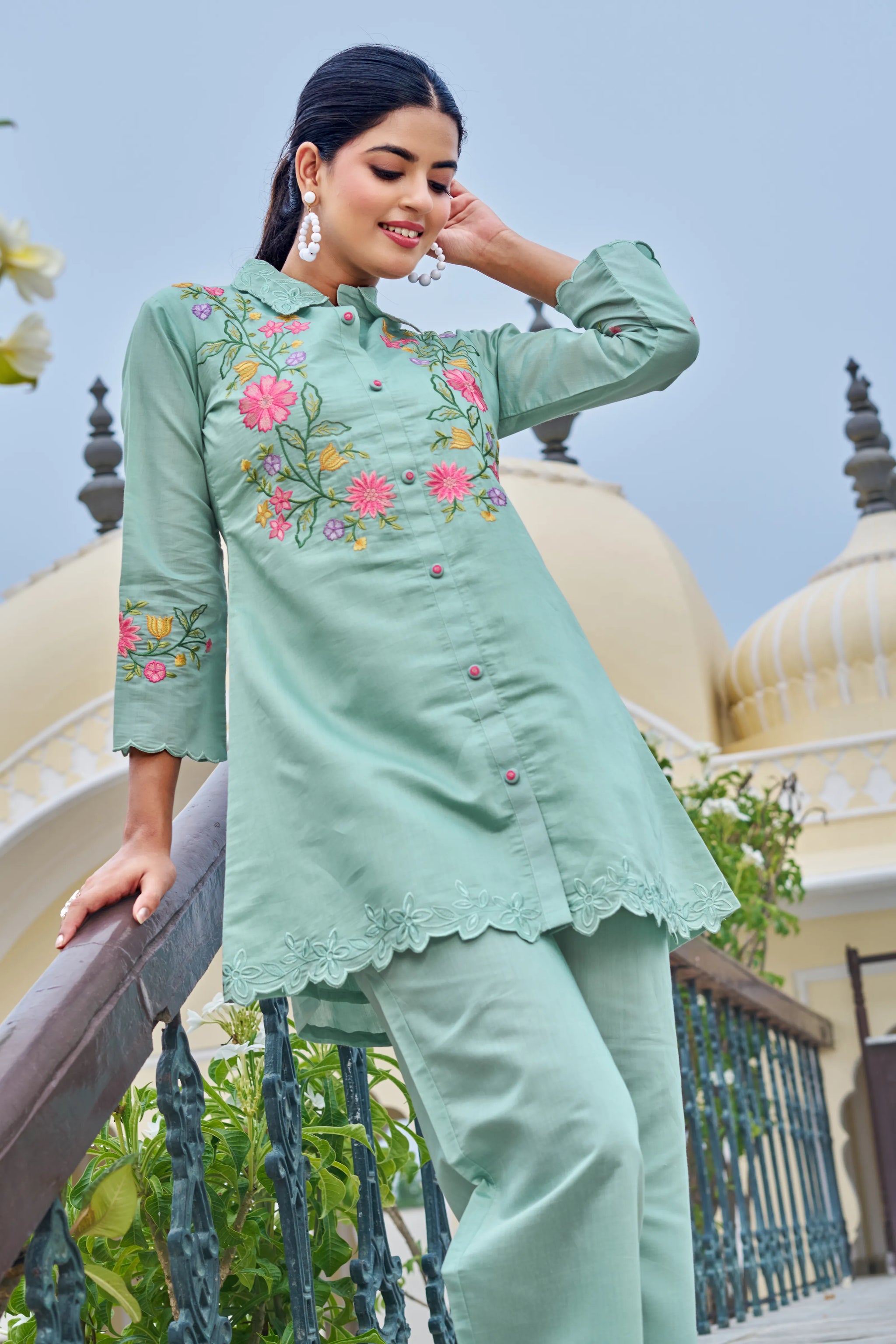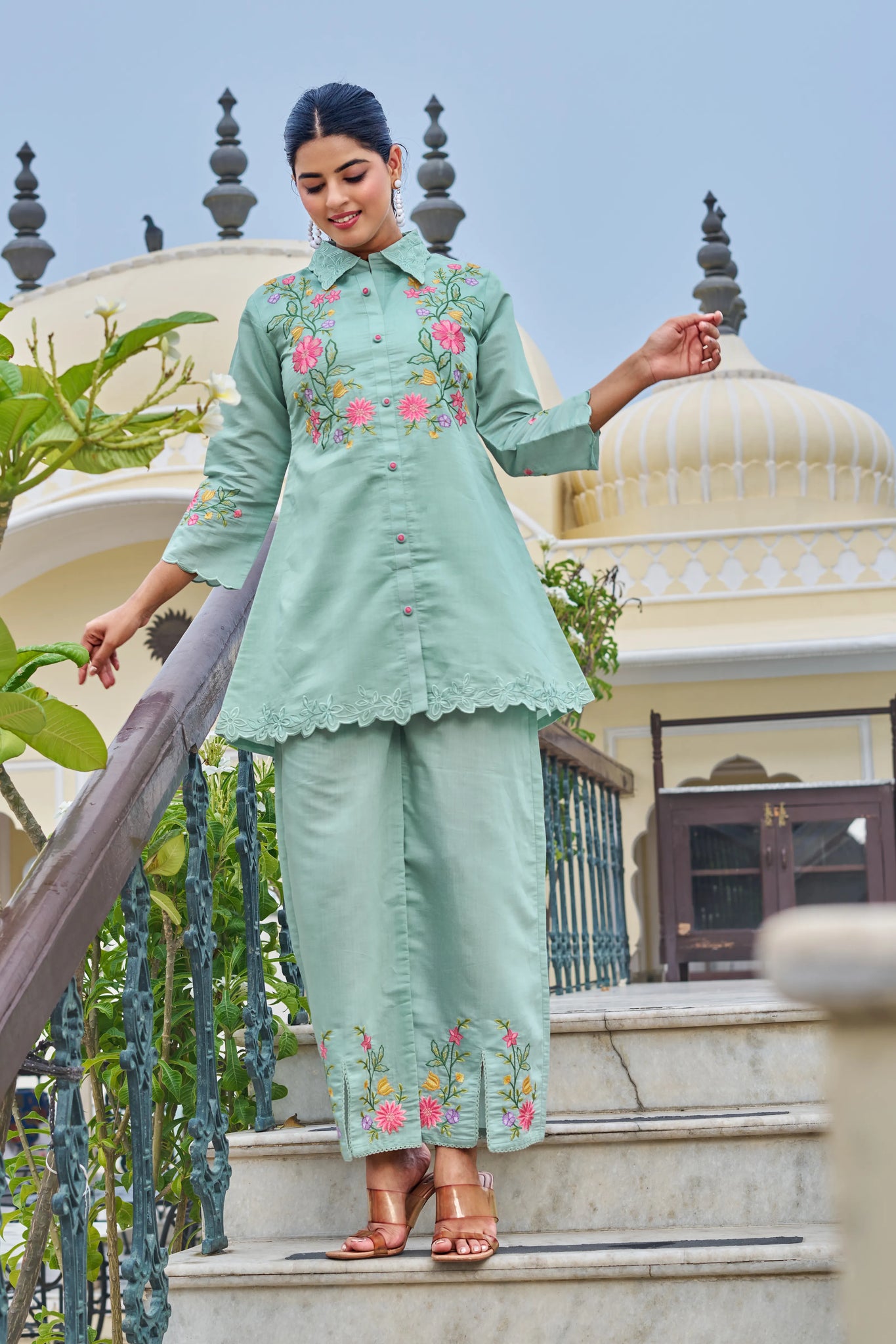 Mint Bloom: Embroidered Roman Silk Co-ord Set
