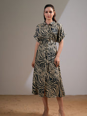 Forest Green & Beige Abstract Stripe Russian Silk Midi Dress