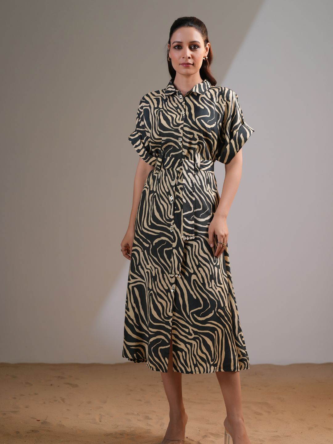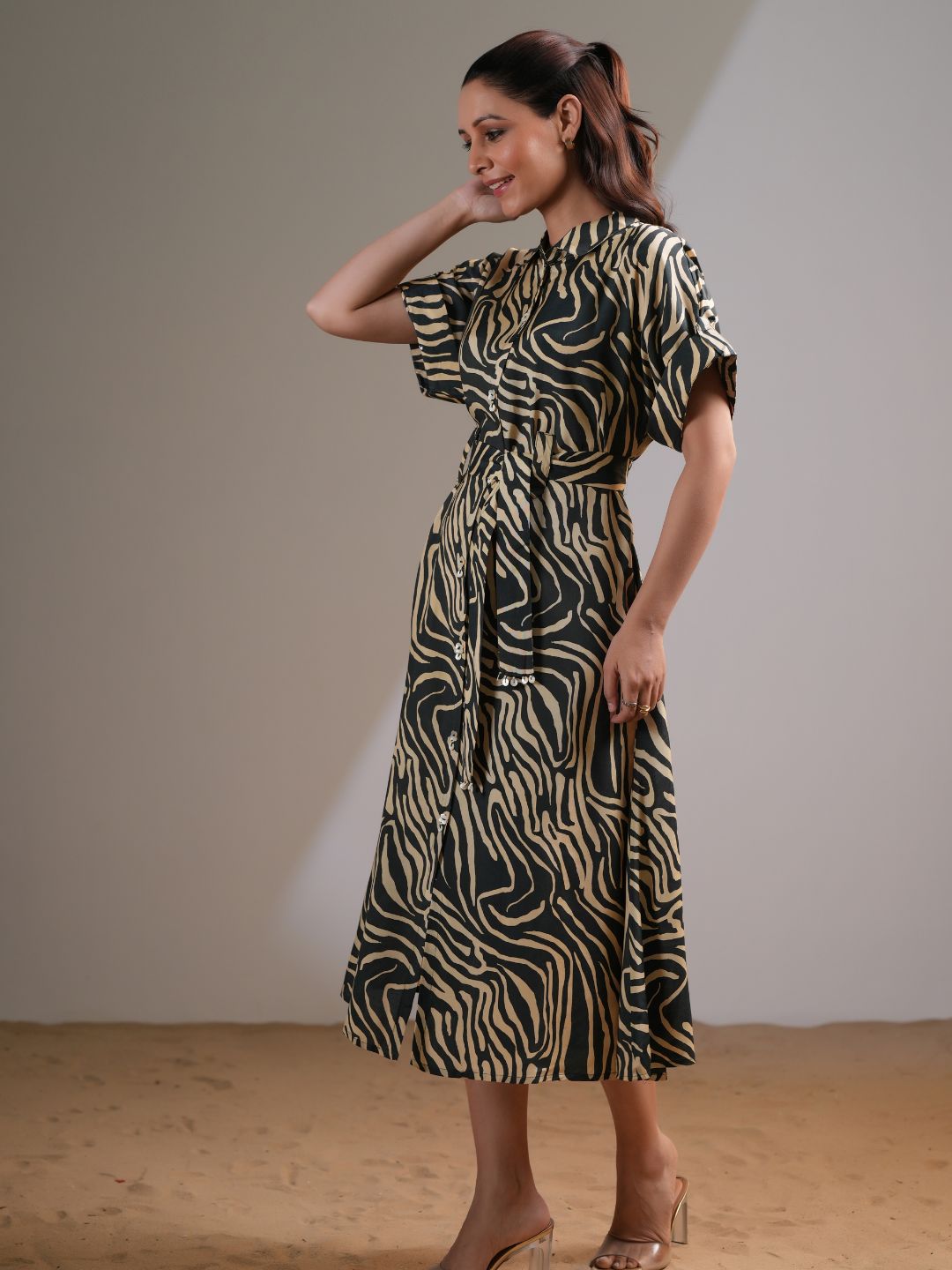 Designed with a classic shirt collar and shell button placket, this dress features a chic tie-front detail that enhances the waistline for a flattering fit. The short sleeves add a breezy touch, making it a versatile pick for any season. Pair it with heels for a polished look or sandals for effortless charm.