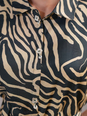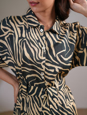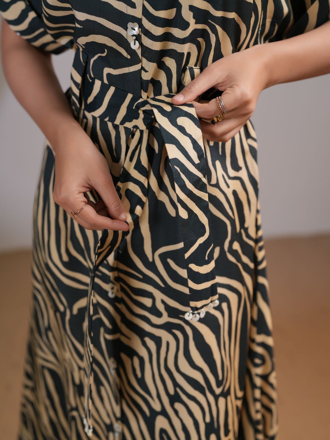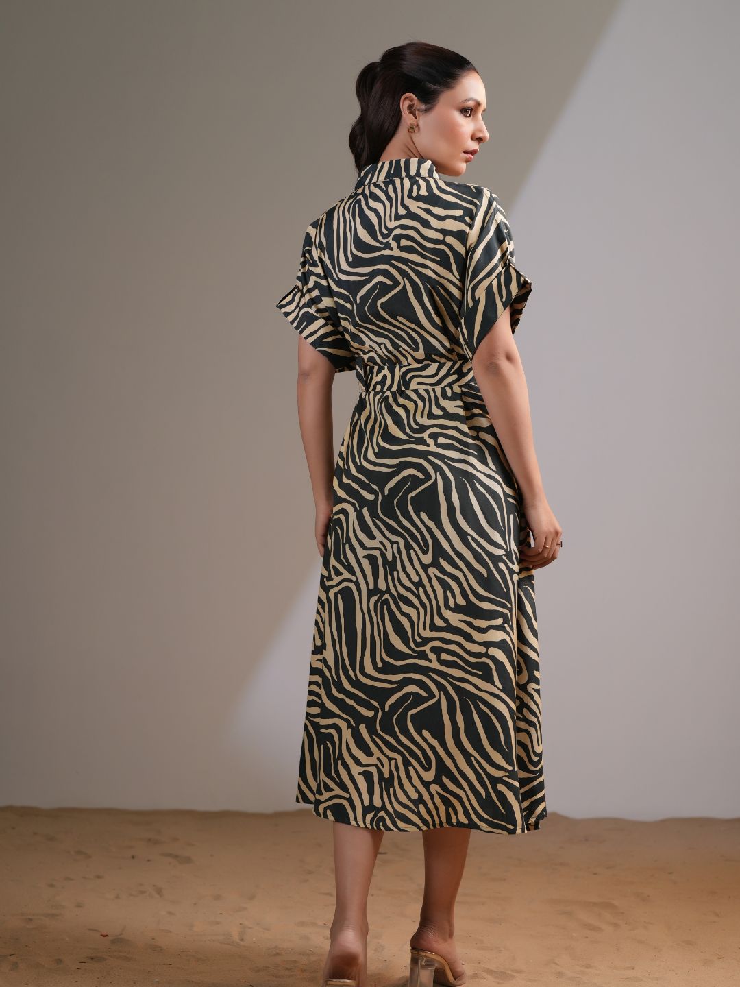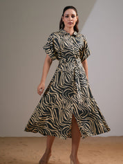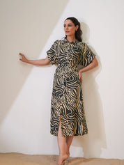 Elevate your wardrobe with this Forest Green & Beige Abstract Stripe Printed Midi Dress, a perfect blend of sophistication and ease. Crafted in luxurious Russian silk, this dress offers a smooth, flowy silhouette with a refined sheen, making it ideal for day-to-evening wear.