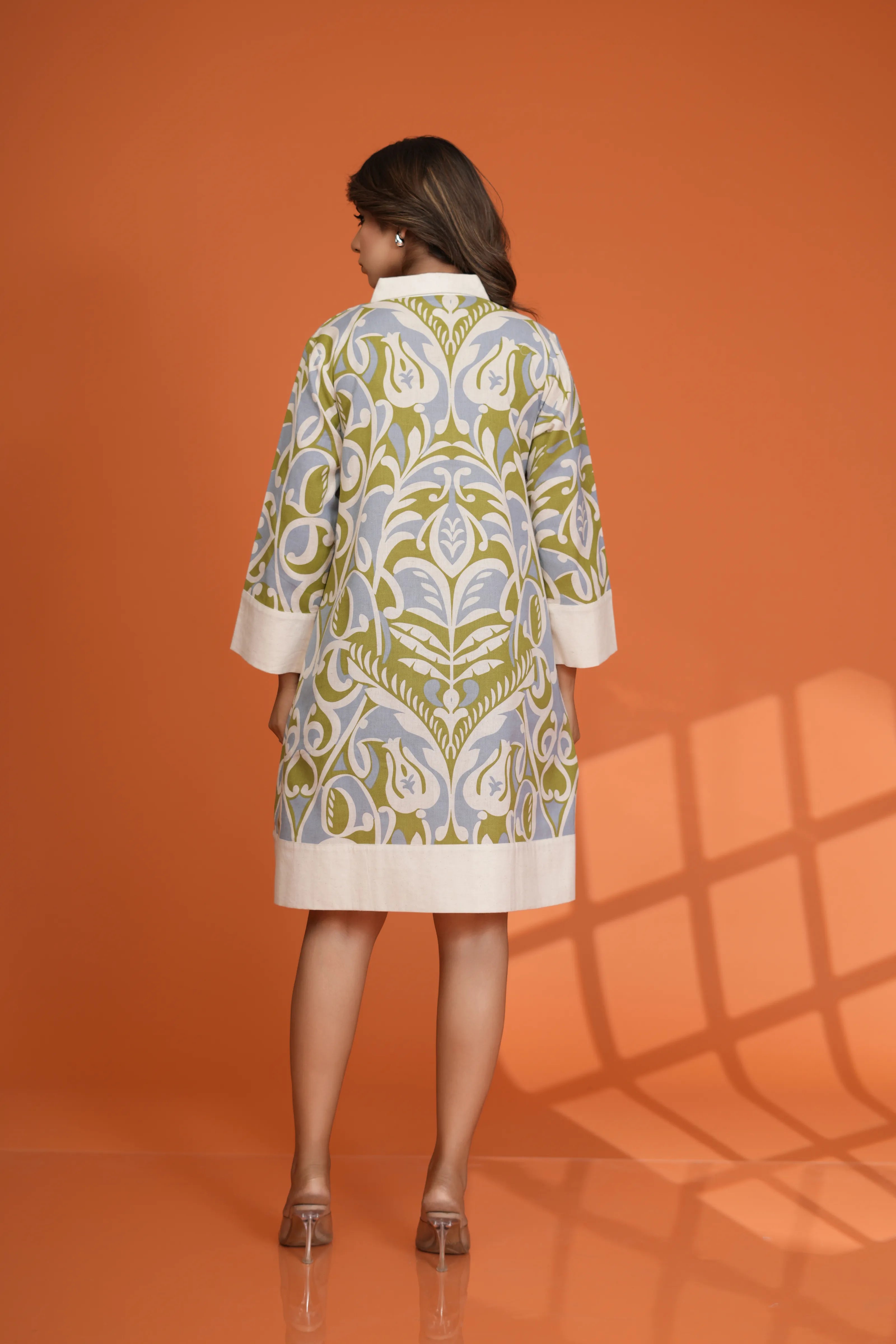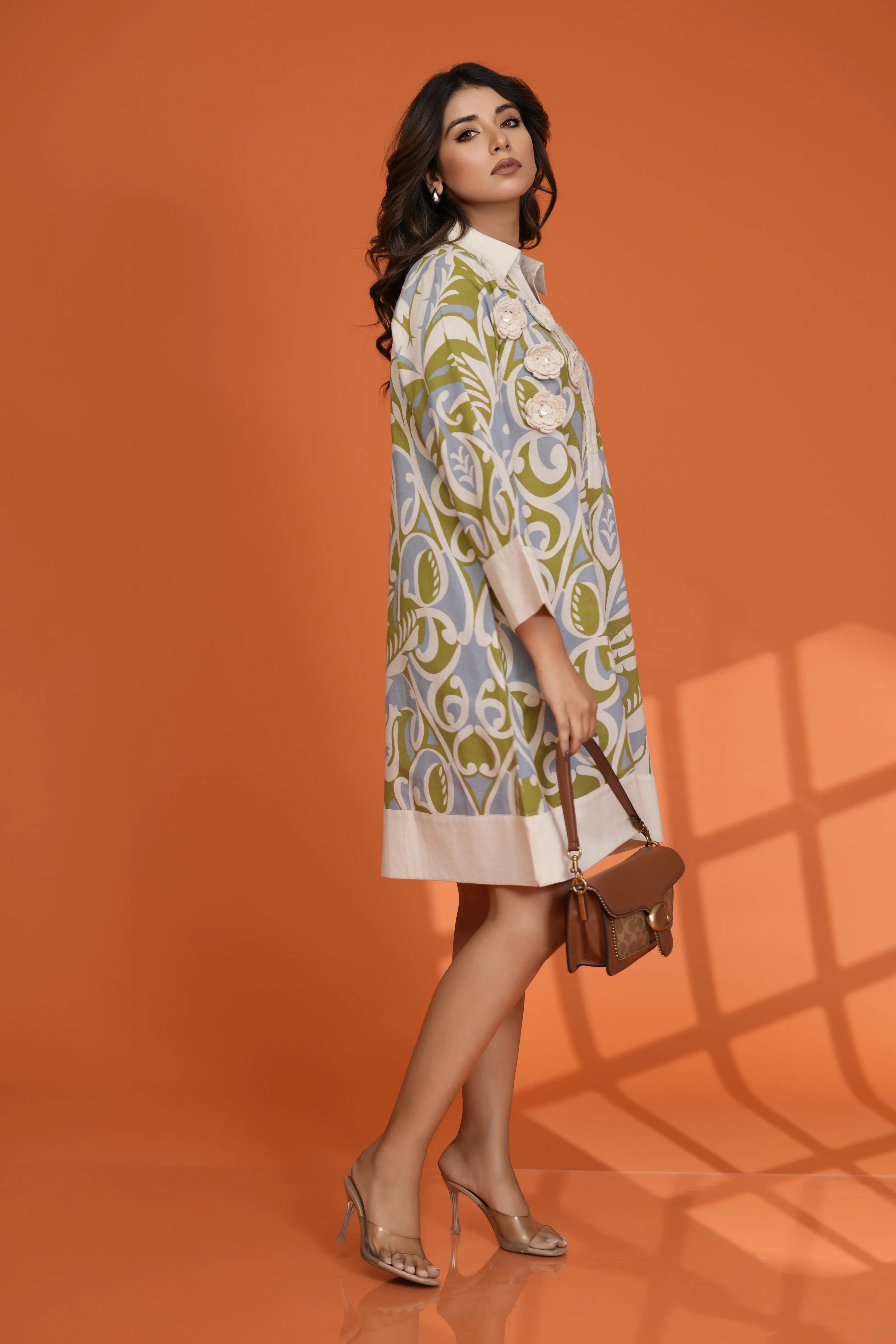Designed in a relaxed shirt silhouette, it features a sharp collared neckline and partial shell button placket that brings elegance to its bold print. The abstract motif—rendered in soft green, beige, and powder blue—adds dimension and personality, while the wide contrast cuffs and hem elevate the finish.