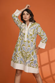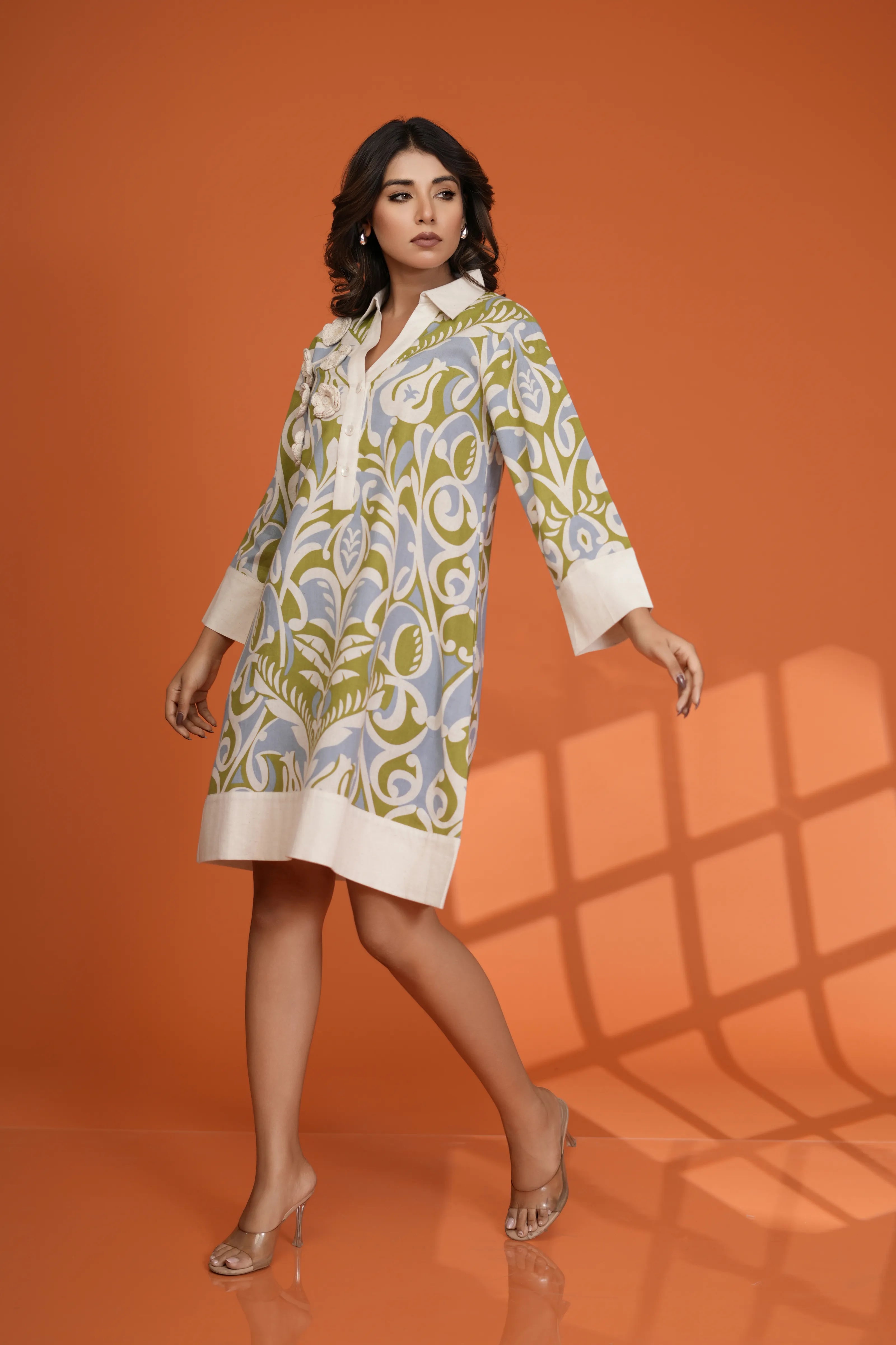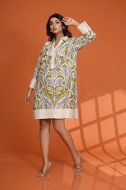 Step into playful sophistication with this green-beige abstract print shirt dress, where art-inspired patterns meet contemporary tailoring. Crafted in breathable cotton flex, the dress flows effortlessly while offering the structure needed for all-day polish.
