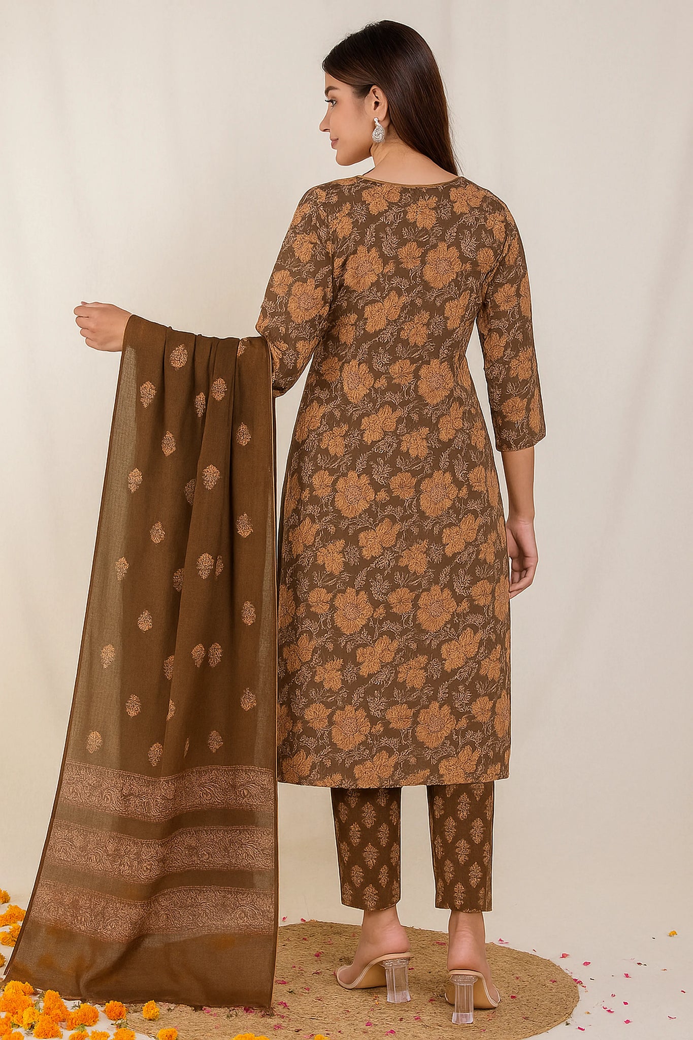 Zahra Earth Bloom: Green & Brown Printed Cotton Ethnic Set with Embroidered Neck & Dupatta