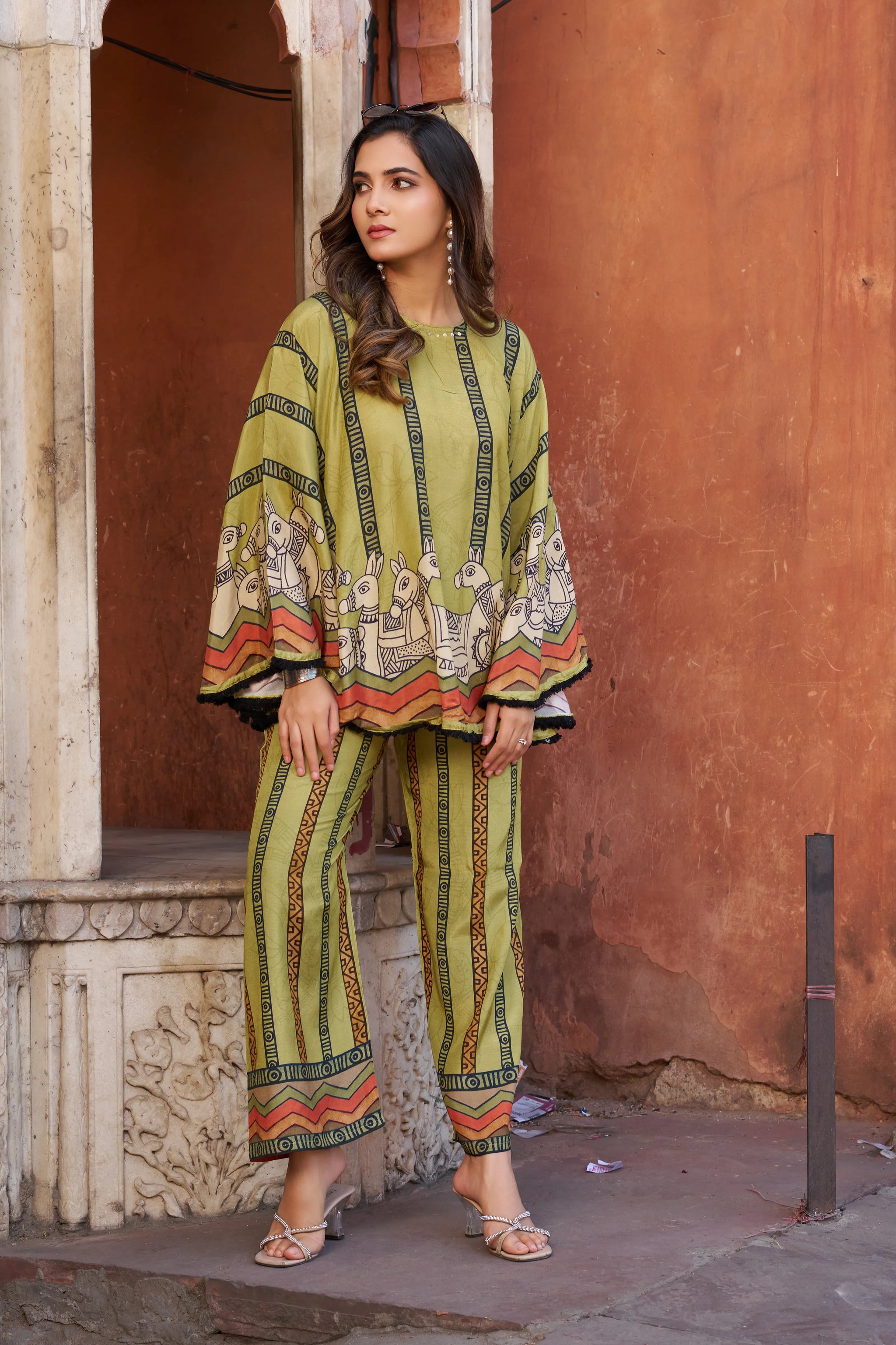 Green Horse Motif Printed Co-ord Set in Viscose Silk