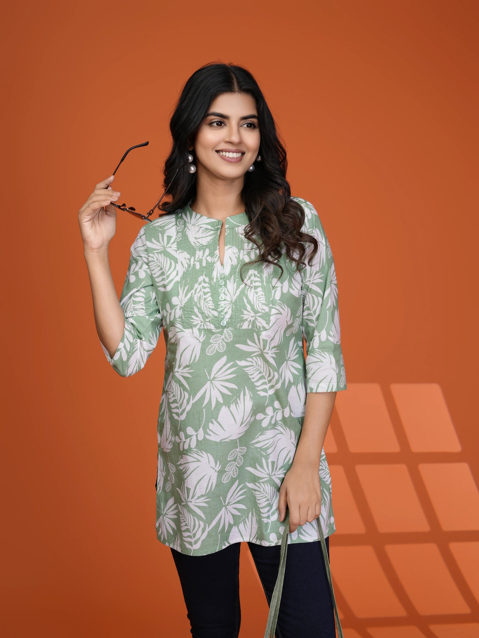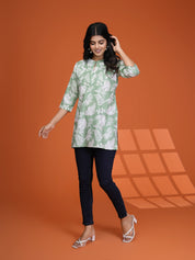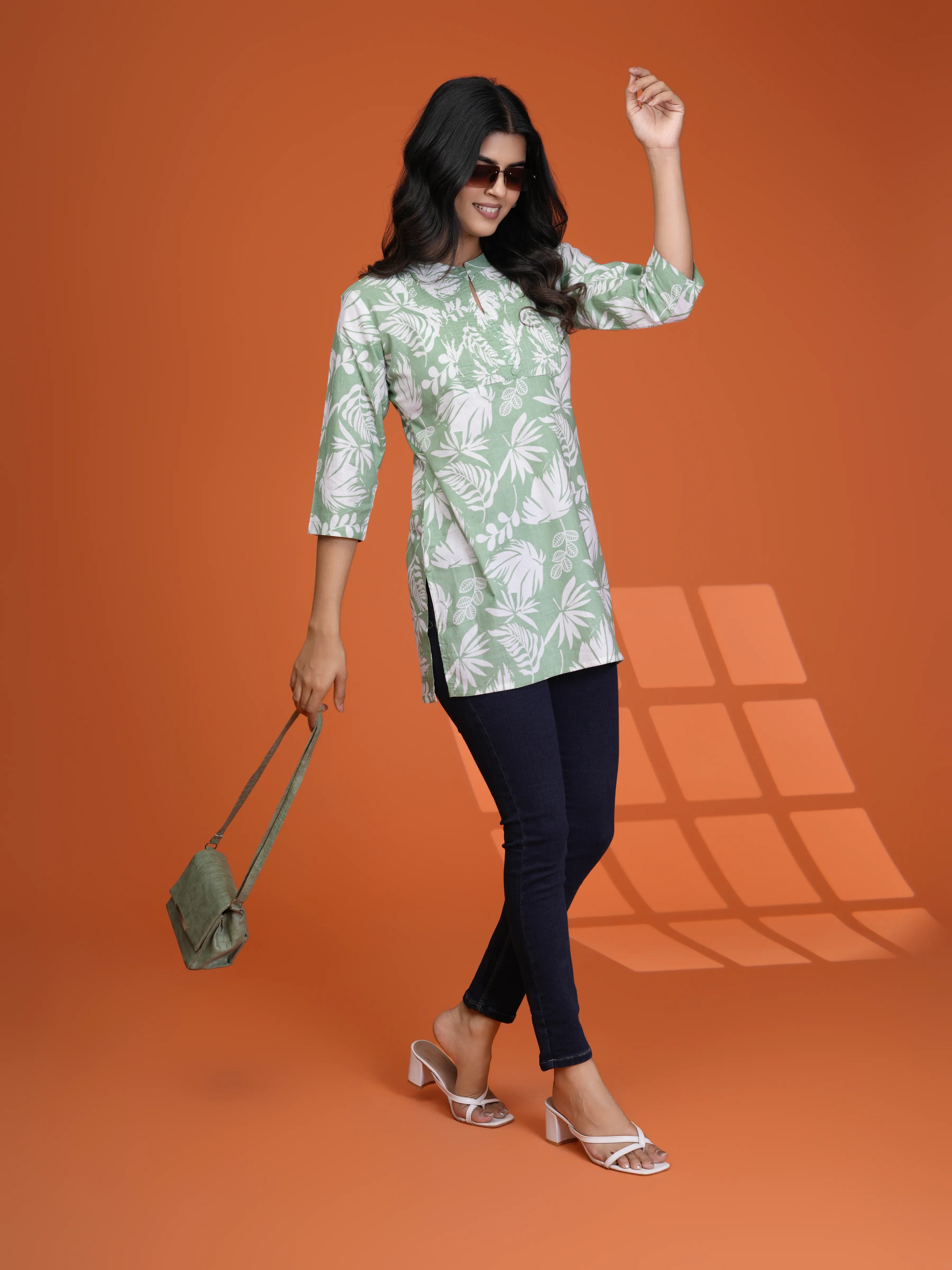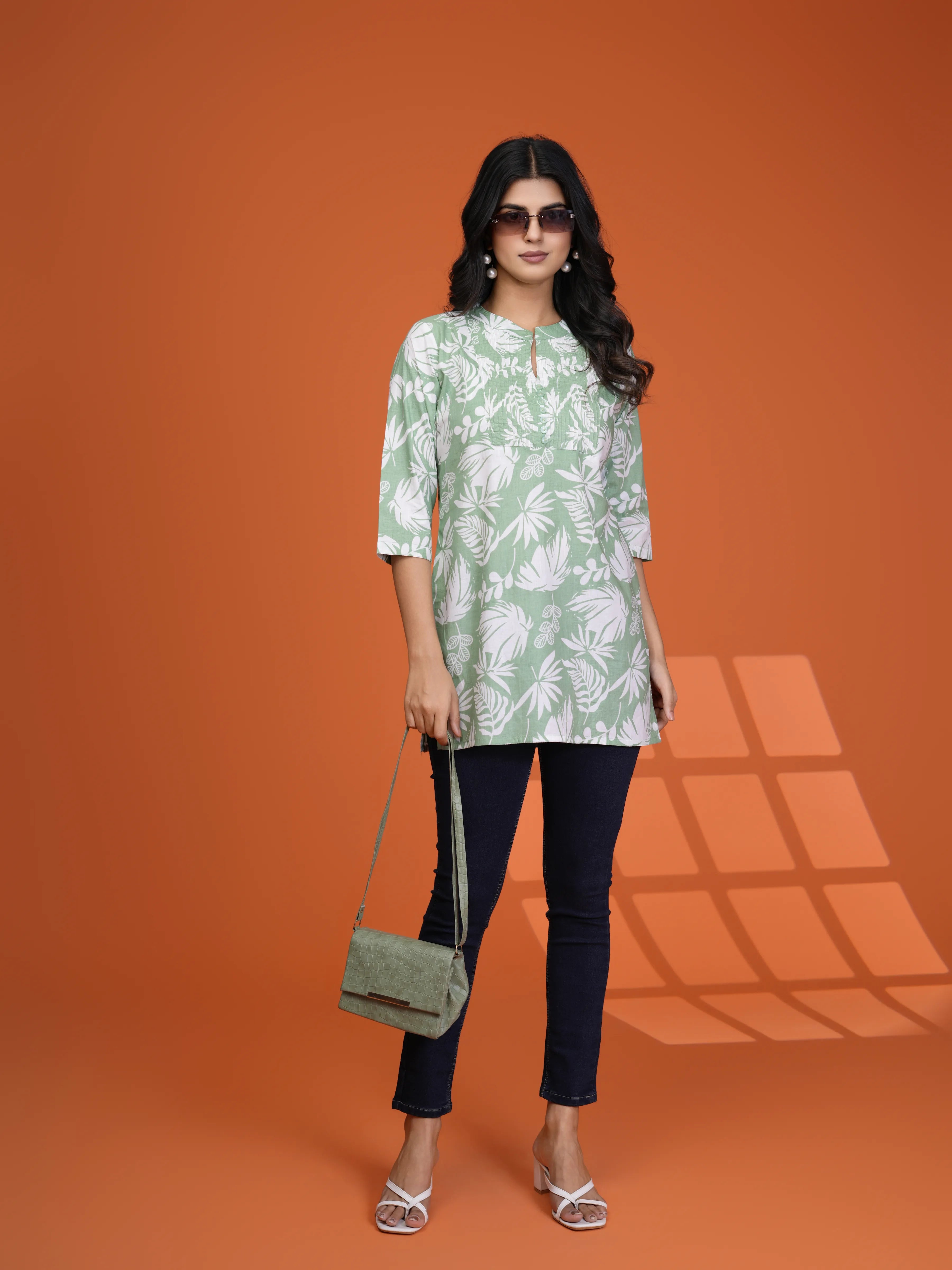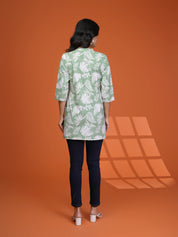 Breathe easy and stay effortlessly stylish in our Tropical Ease short kurti. Set on a refreshing sage green base with white tropical leaf motifs, this kurti is your go-to for warm, breezy days.