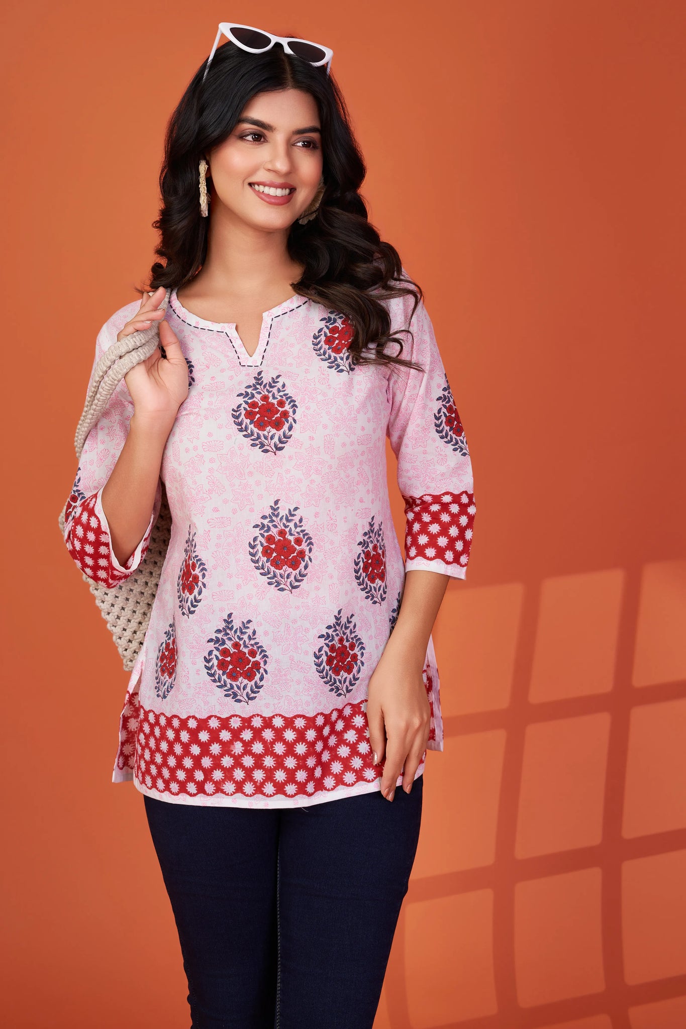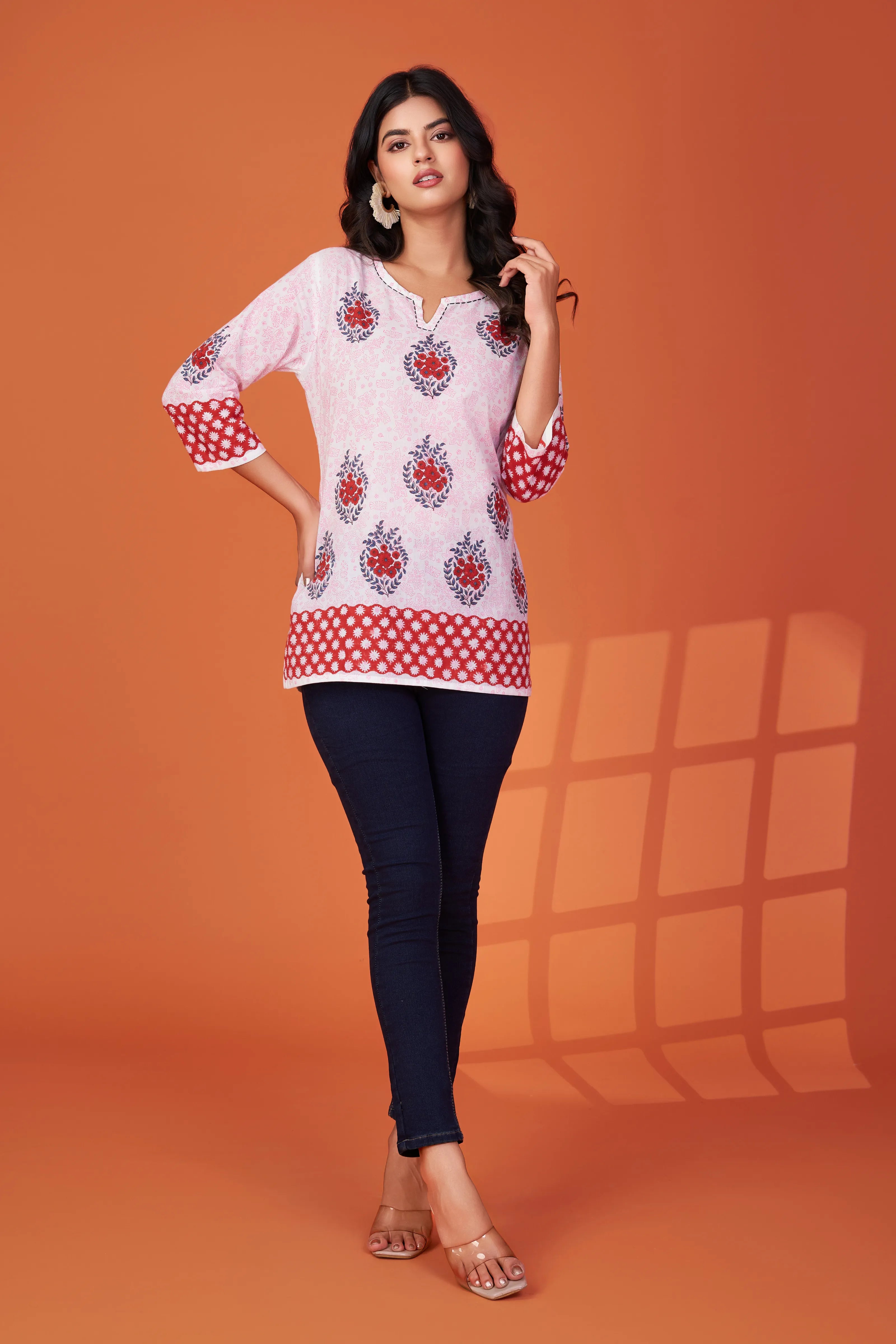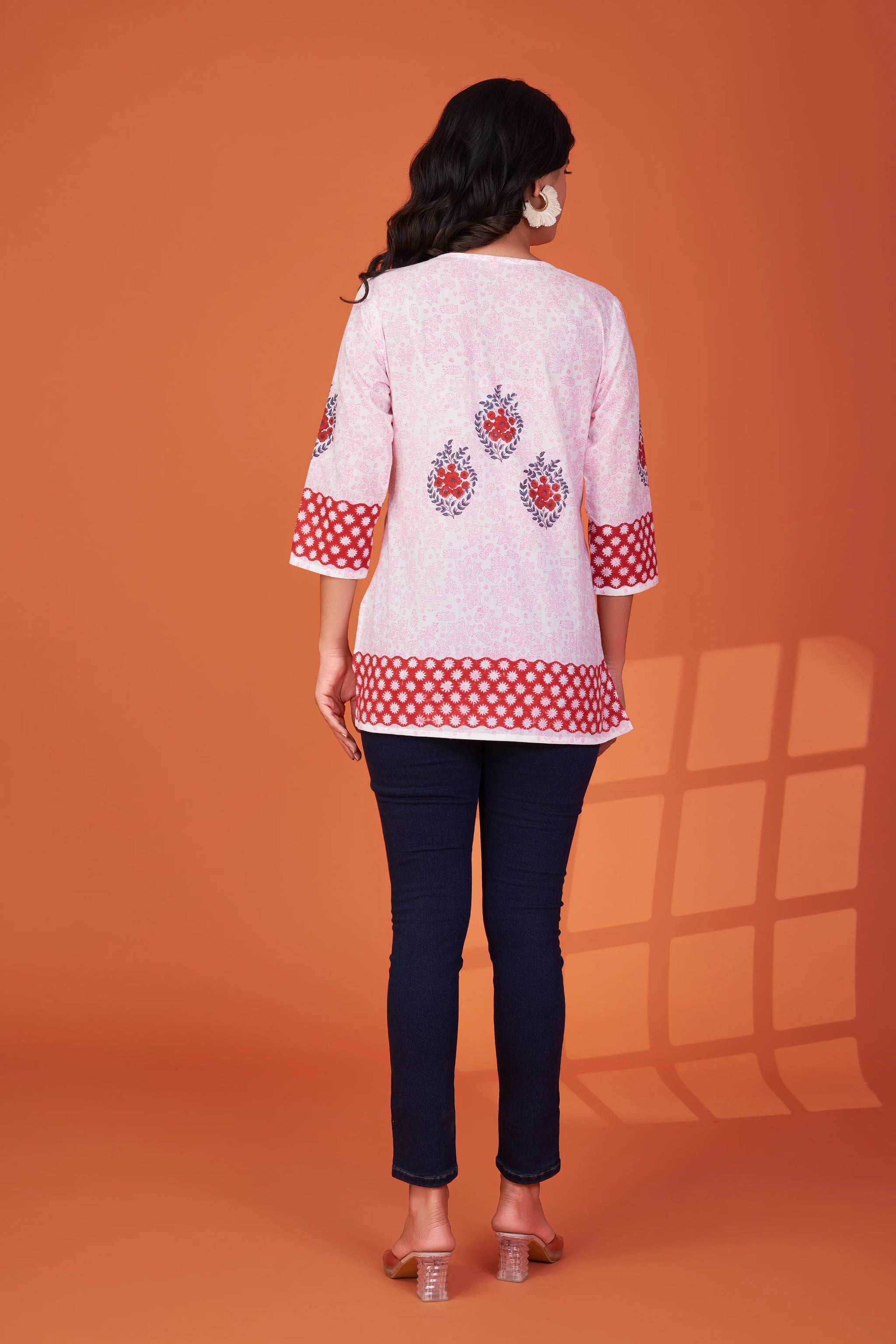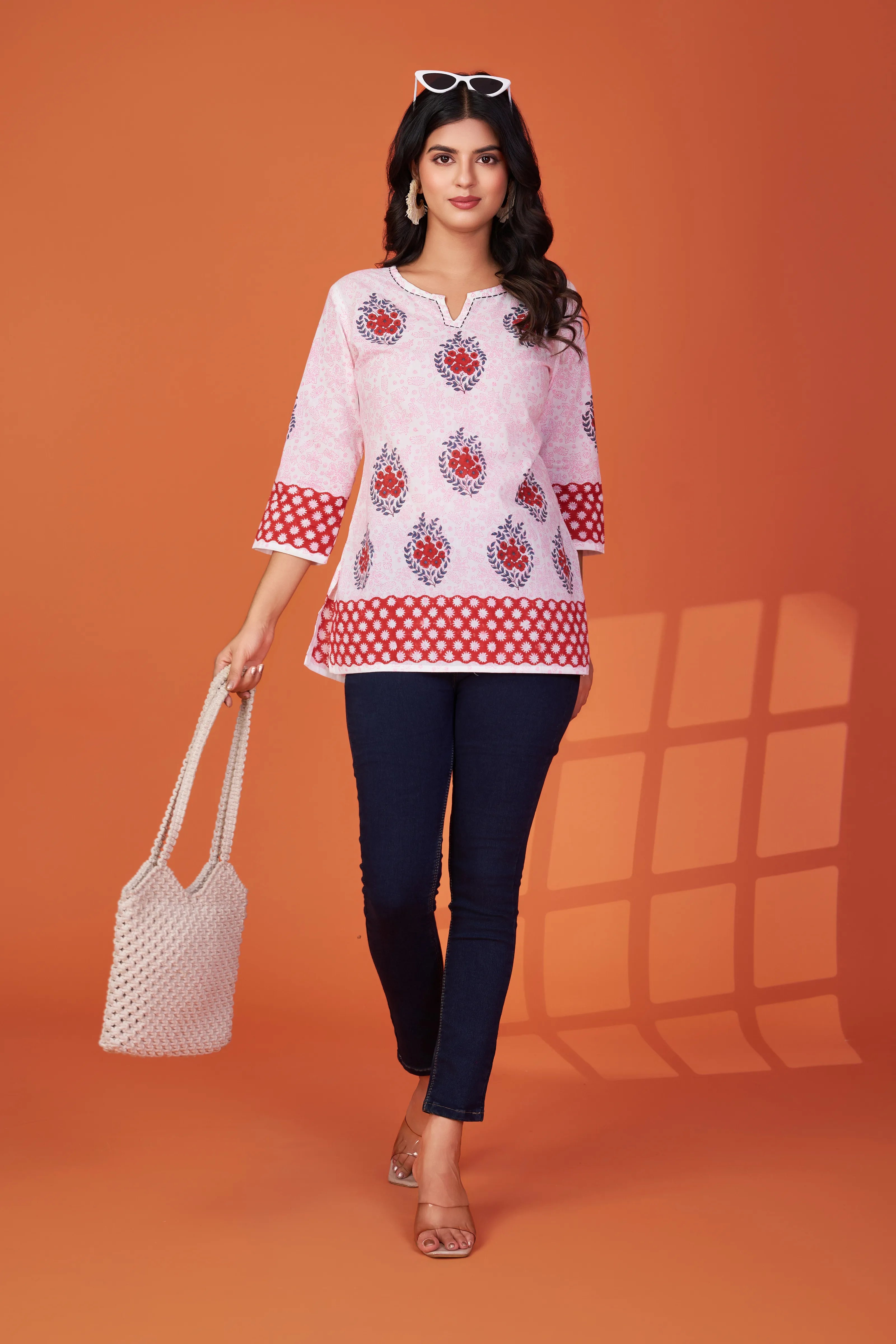 Fresh, feminine, and full of charm — our Bloom Story short kurti brings a burst of handcrafted beauty to your everyday wardrobe. With hand block floral motifs in a mix of reds and blues, this piece radiates subtle vibrance on a soft white base.