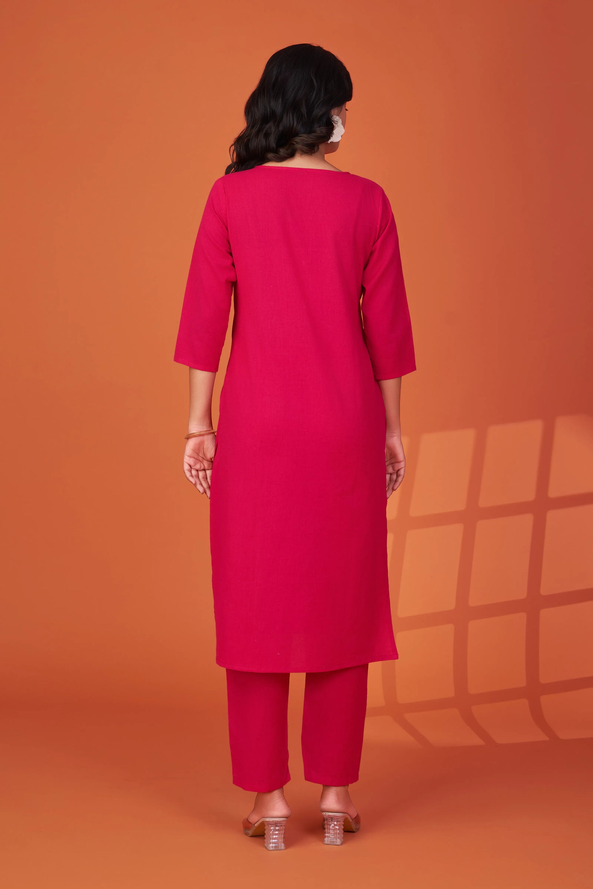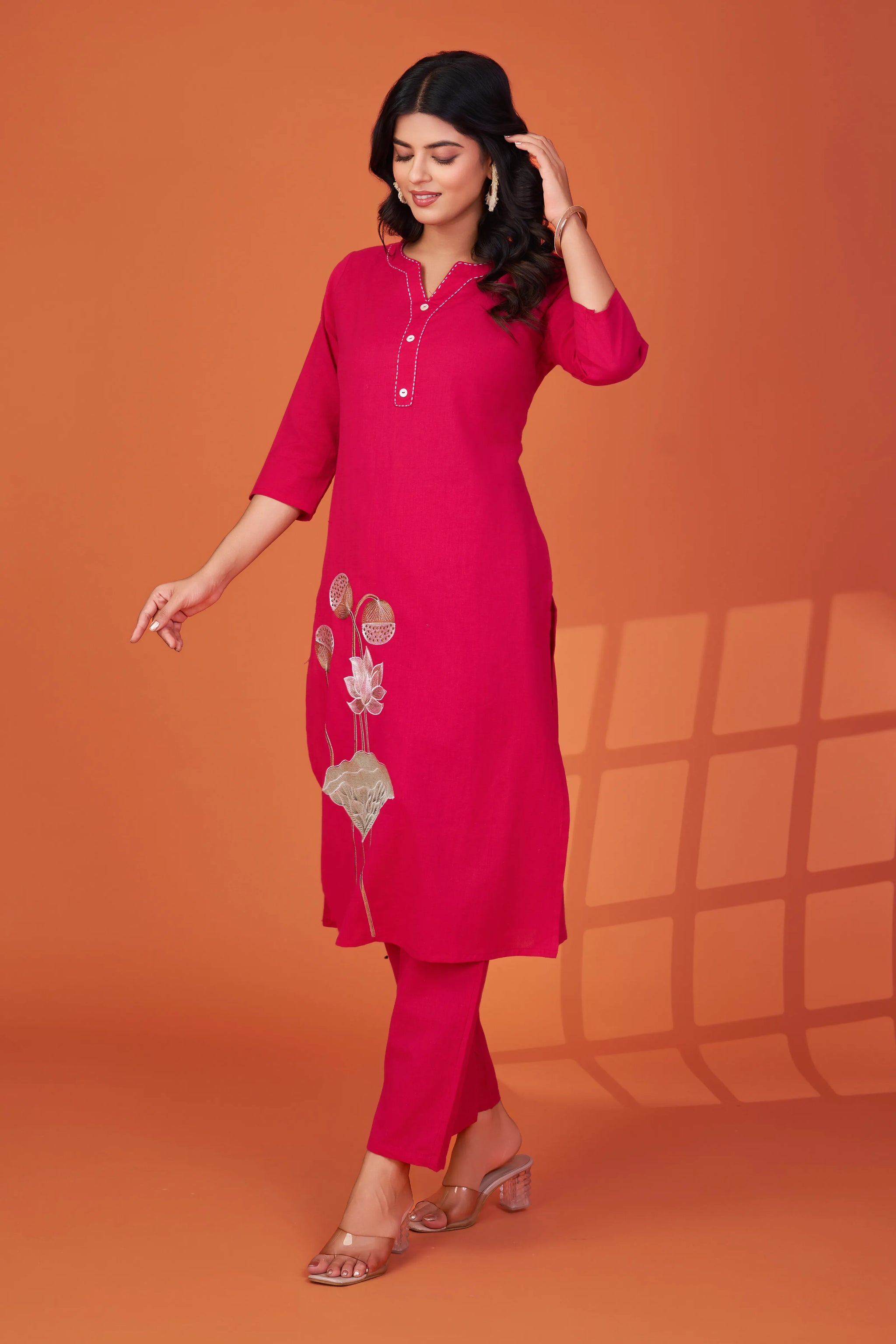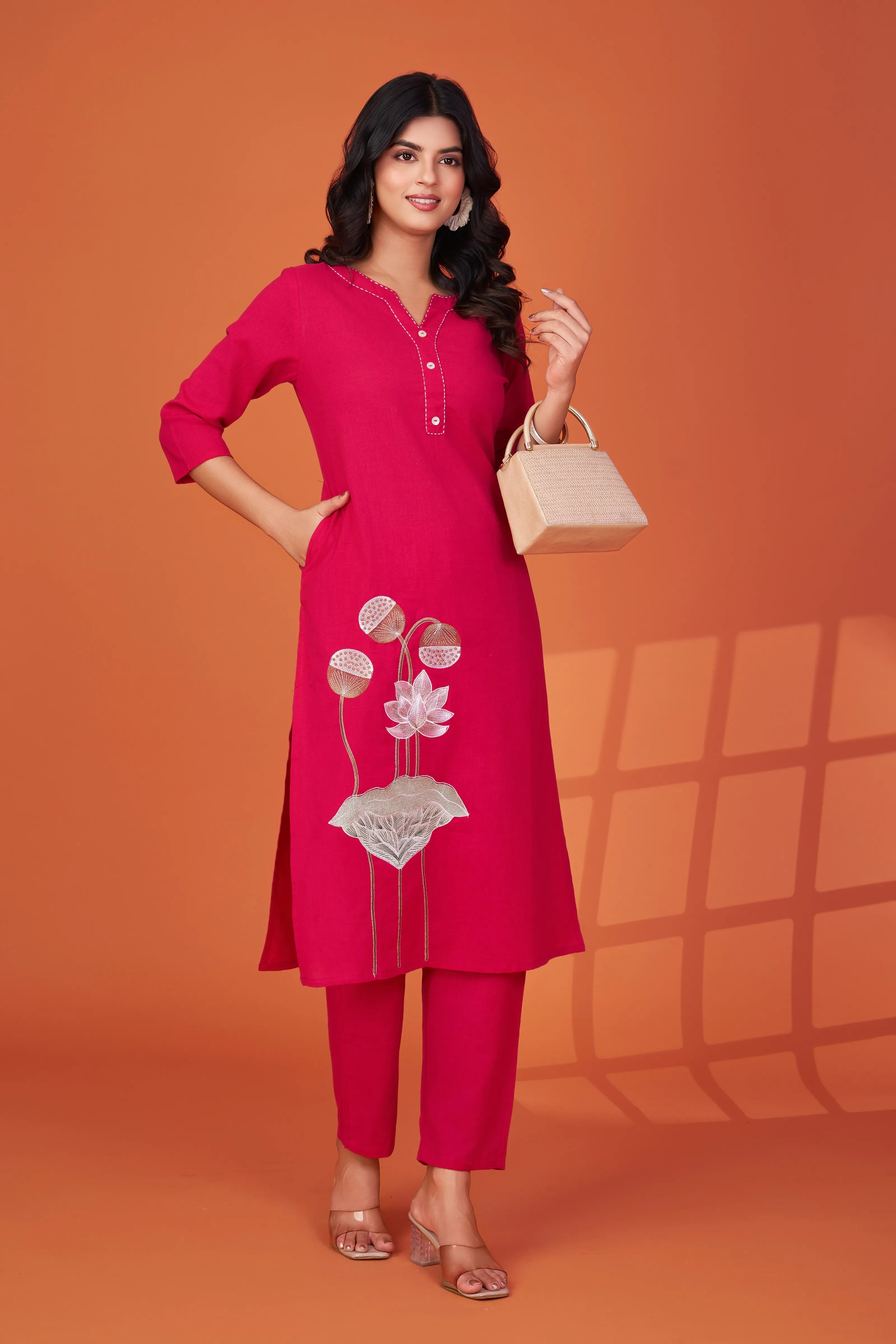 Hot Pink Floral Embroidered Kurta Pant Set in Cotton Flex