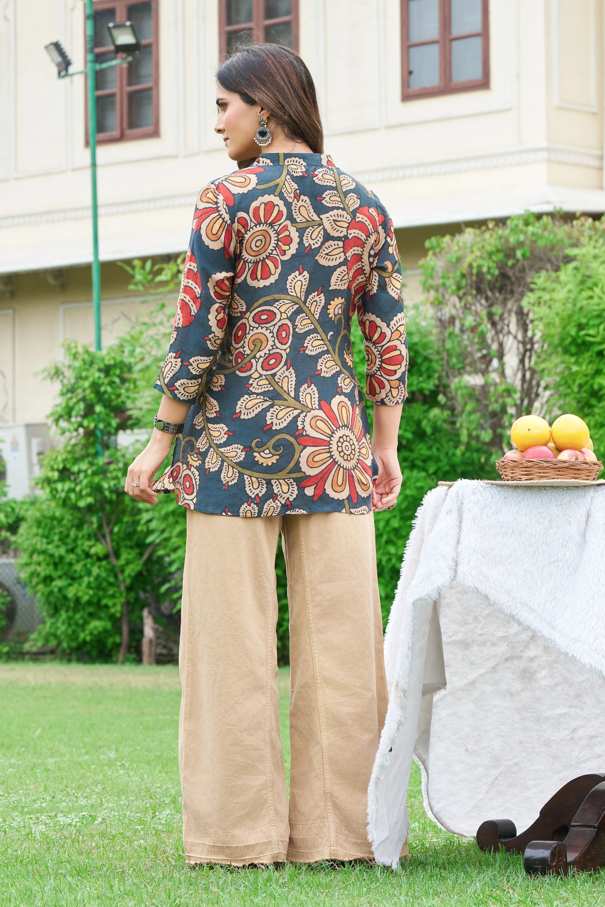 A fresh spin on traditional Ajrakh—this indigo-hued kurti celebrates heritage craftsmanship with a bold floral interpretation. The short-length silhouette in breathable muslin makes it perfect for transitional dressing, while the mandarin collar and buttoned detail keep the look crisp and contemporary.