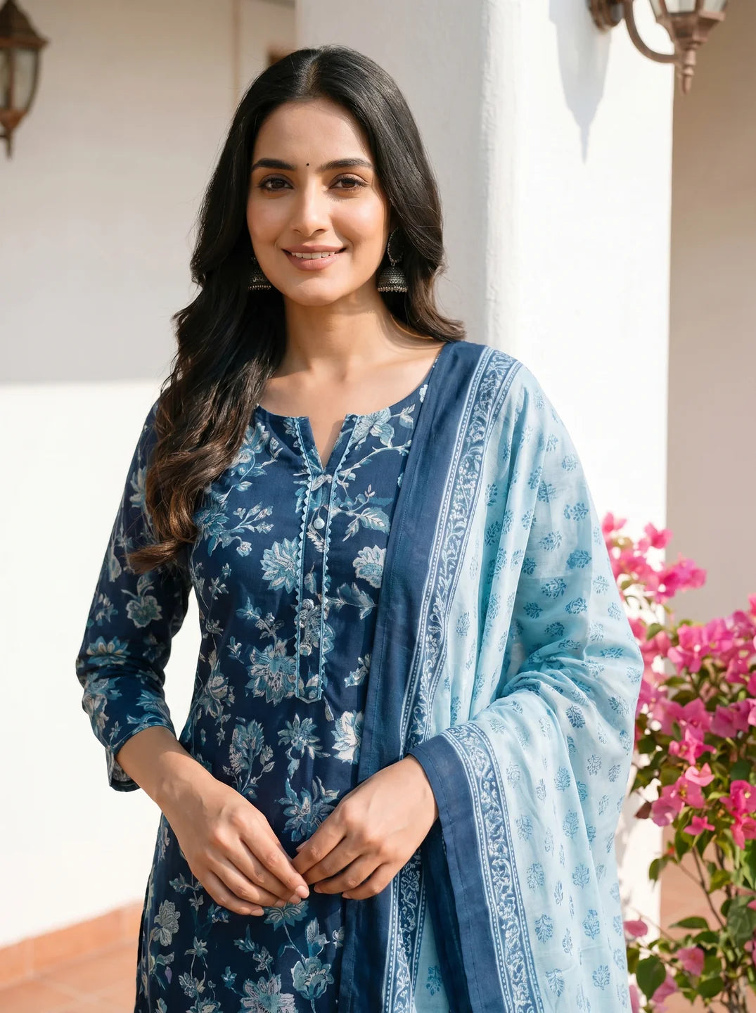 Indigo Floral Jaal Embroidered Cotton Kurta Set with Dupatta