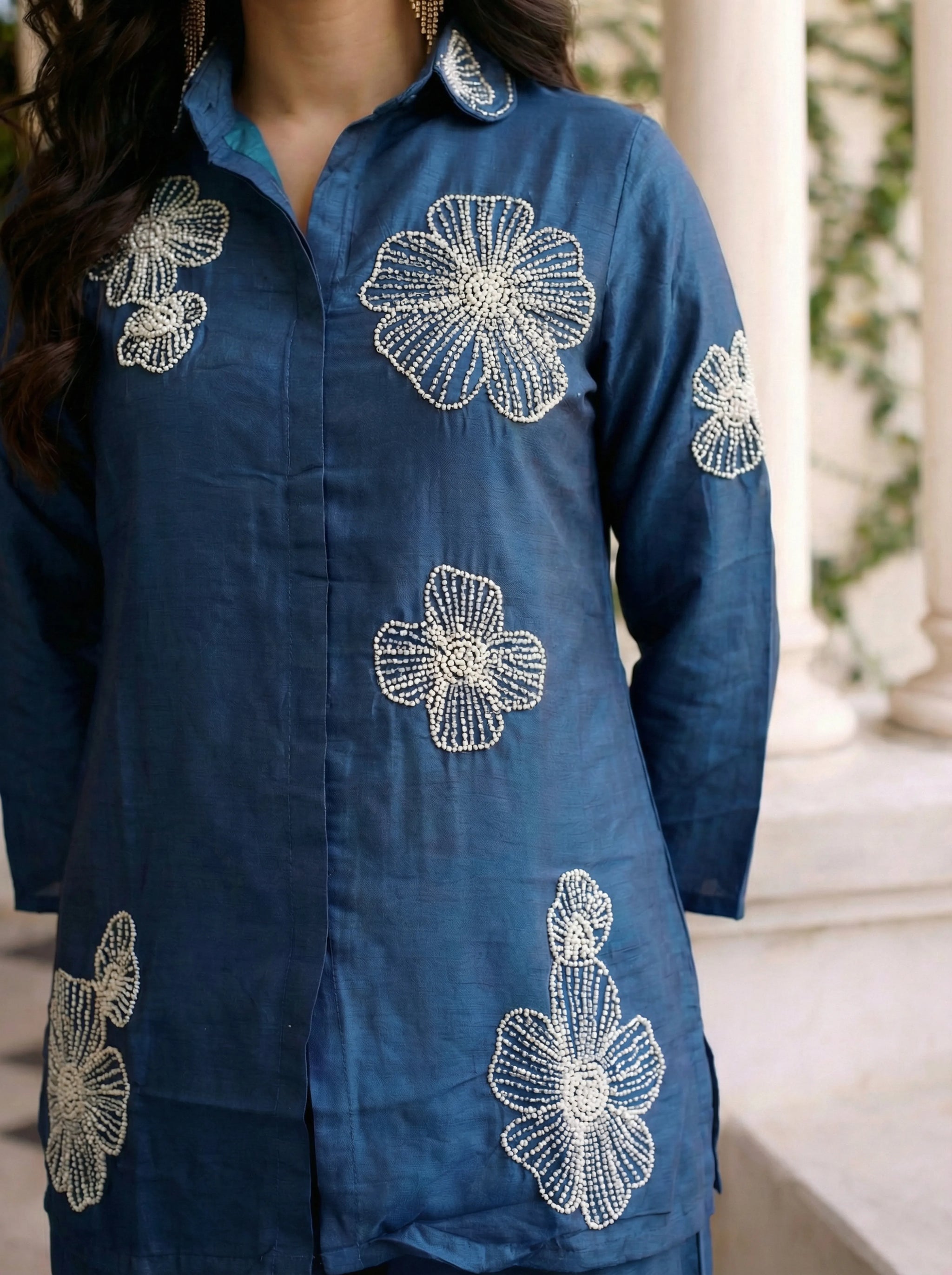 Indigo Bloom: Indigo Hand-Beaded Floral Motif Co-ord Set with Palazzo Pants