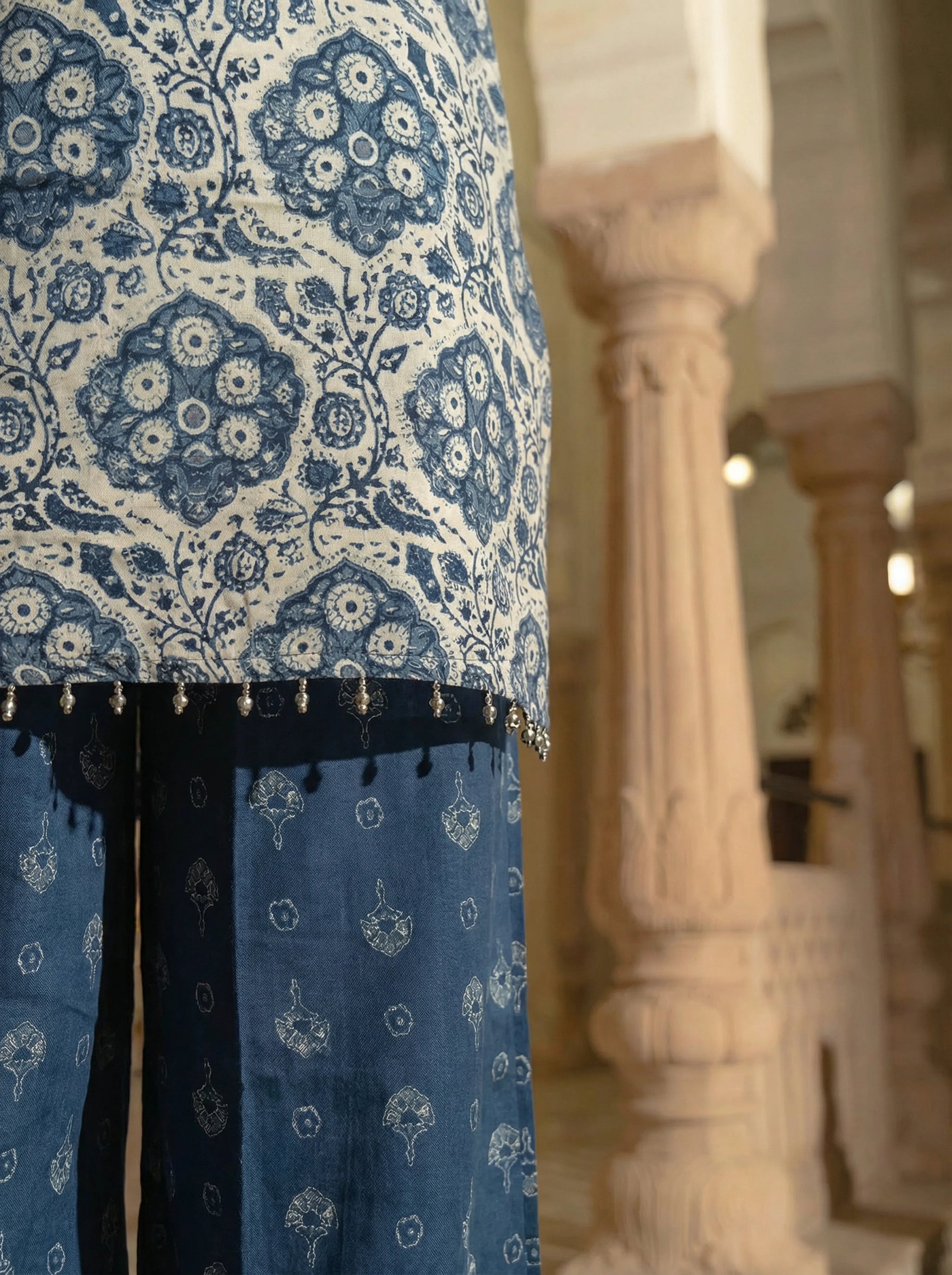 The kurta features a mandarin collar with a subtle V notch, delicately framed with bead embroidery that enhances the neckline with understated shimmer. A bold metal embellishment at the center, finished with bead tassels, adds a signature focal detail that feels both artisanal and modern. The full sleeves maintain balance and elegance, while umbrella panels attached at the sides with strip prints create graceful flare and movement. The kurta is adorned with big motif prints all over, giving the piece a bold yet refined visual rhythm.