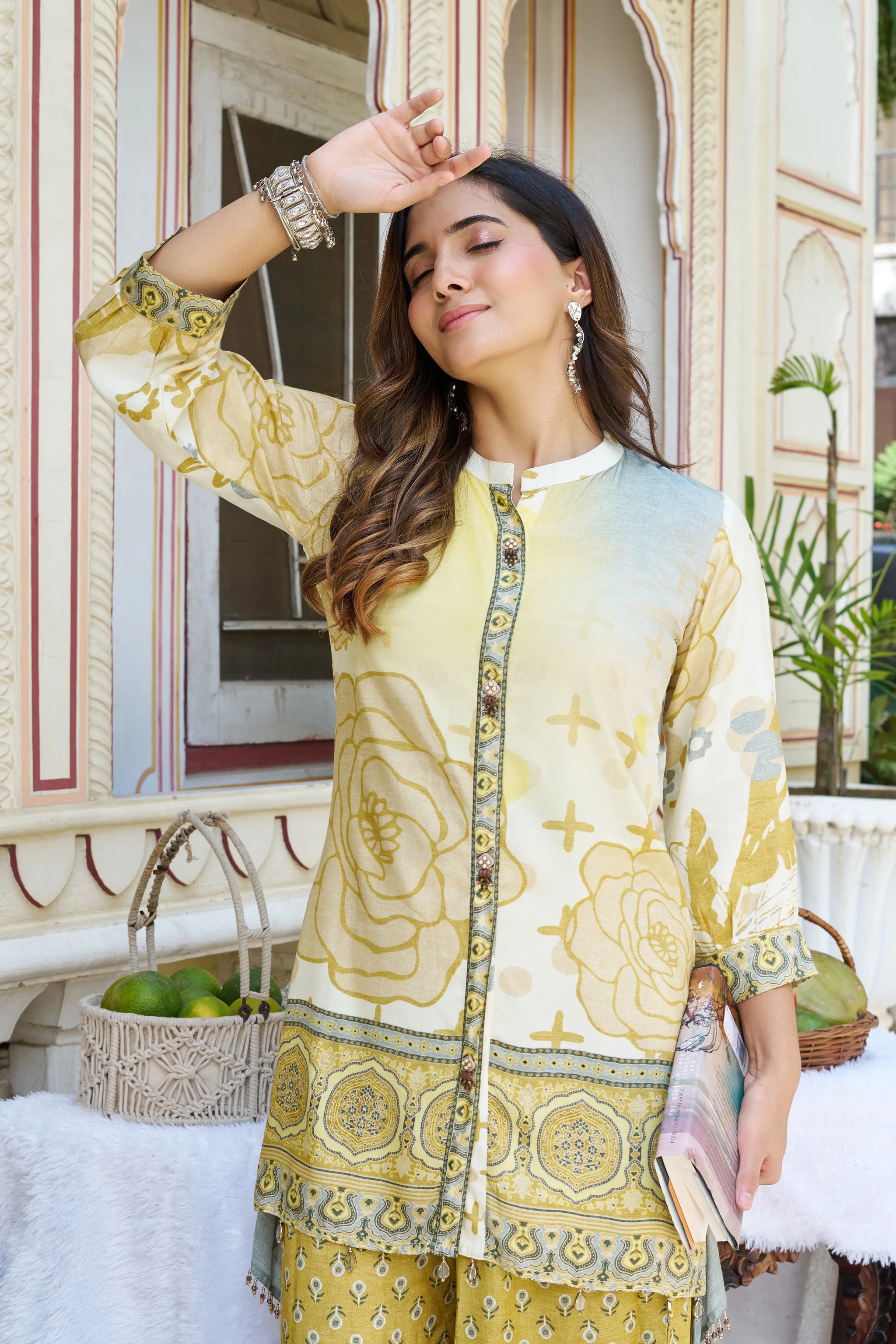 Bask in the glow of summer elegance with Sunlit Bloom, a radiant lemon yellow co-ord set in luxe viscose silk. The kurti features a round neck with closed placket, elevated by embellished buttons and 3/4th sleeves with delicate teardrop bead details on the hem. Bold floral and medallion border motifs add artistic richness to the design. Paired with all-over printed straight pants with an elasticated waist, this set is a seamless blend of comfort and sophistication.