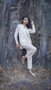 The shirt-style tunic features a mandarin collar and full sleeves with solid button cuffs for a sharp, clean look. The high-low hem adds a modern touch, while the matching mid-rise trousers complete the ensemble with a sleek, slip-on fit. Whether for a casual day out or a semi-formal gathering, this co-ord set is an ideal choice.