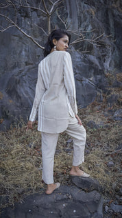 • Tunic: Mandarin Collar, Full Sleeves with Button Cuffs, High-Low Hem, Full Placket Closure