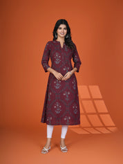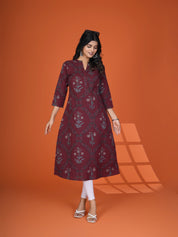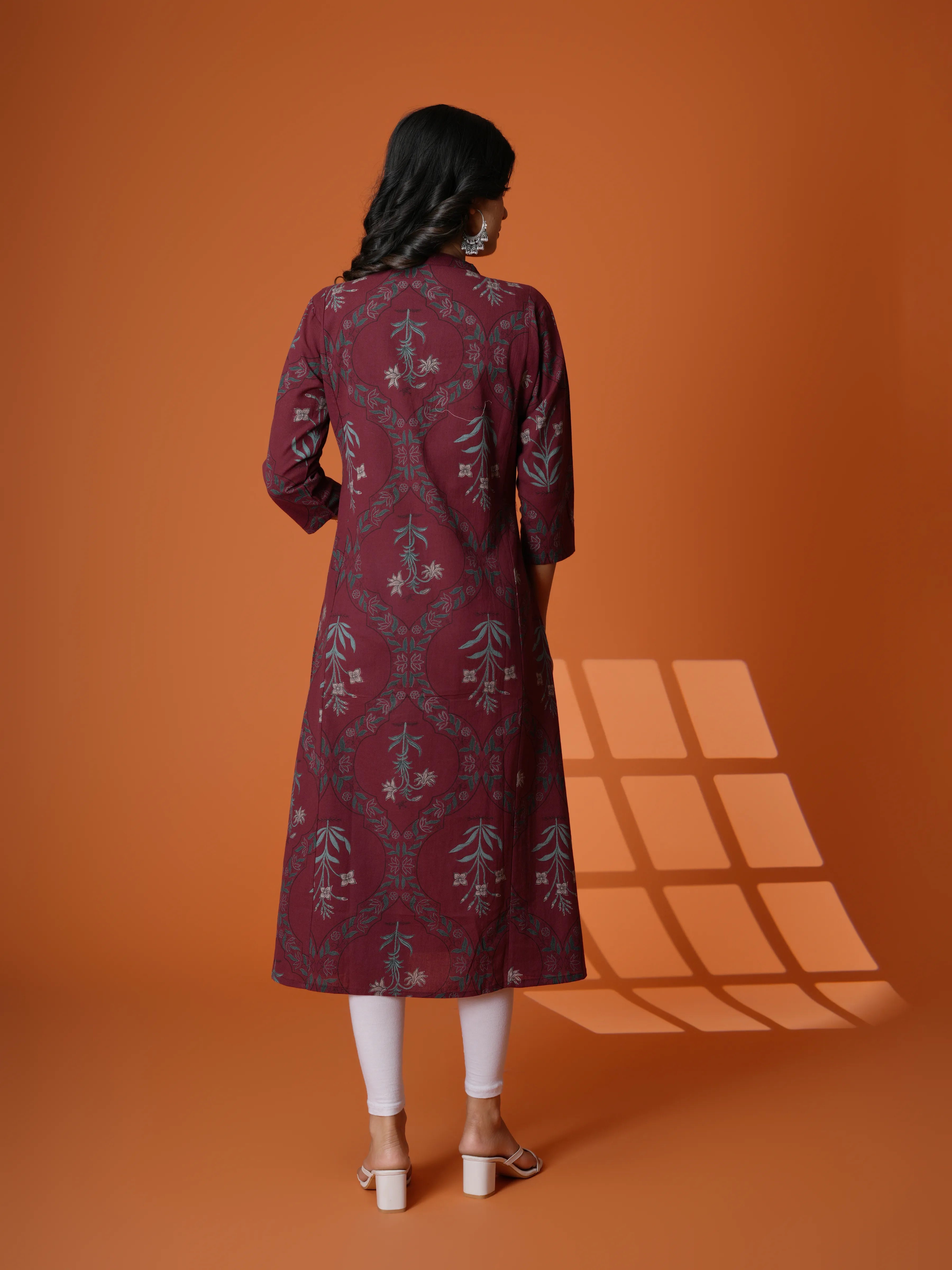 Maroon Floral Printed Fabric Button Long Kurti in Cotton Cambric