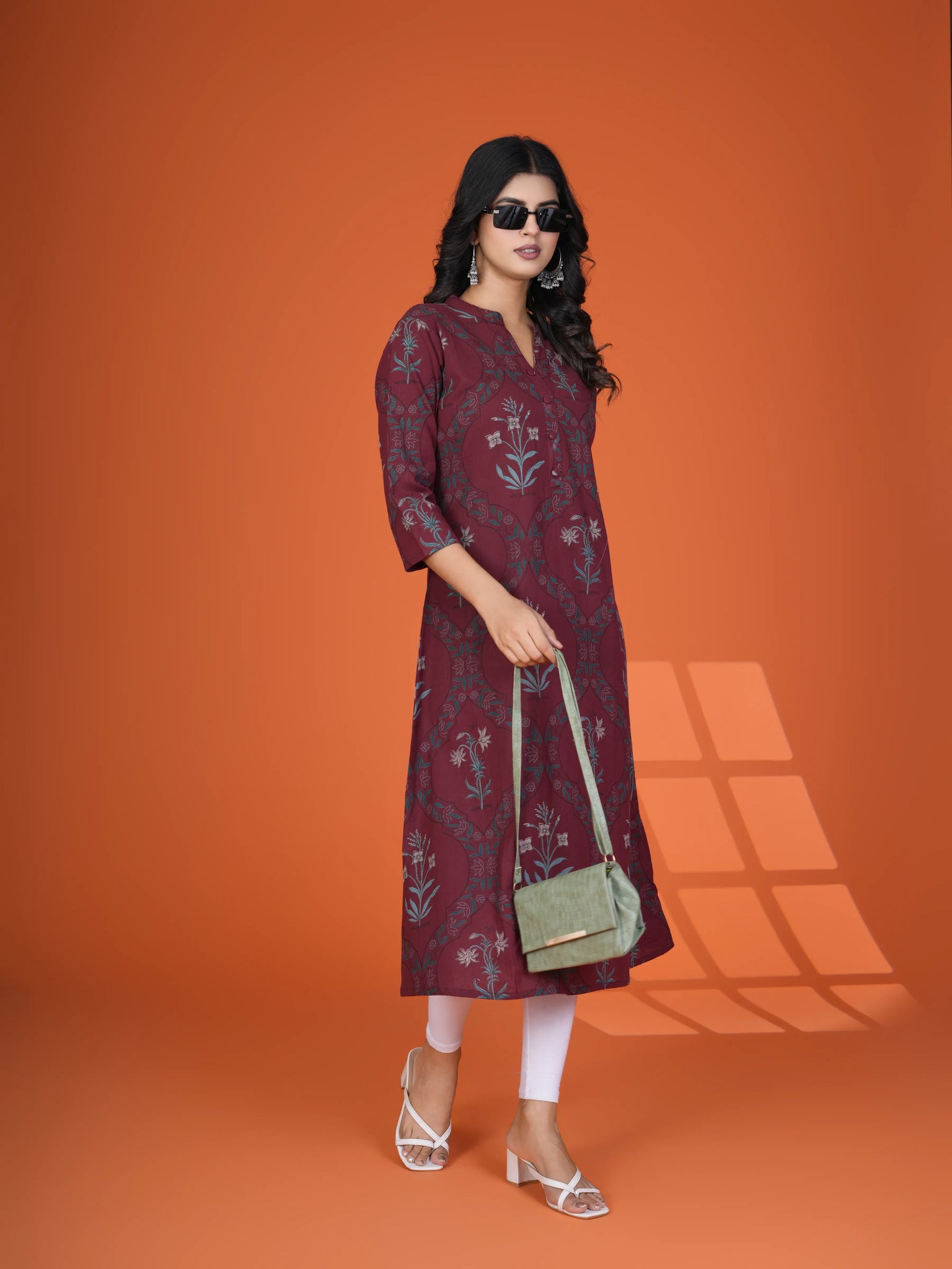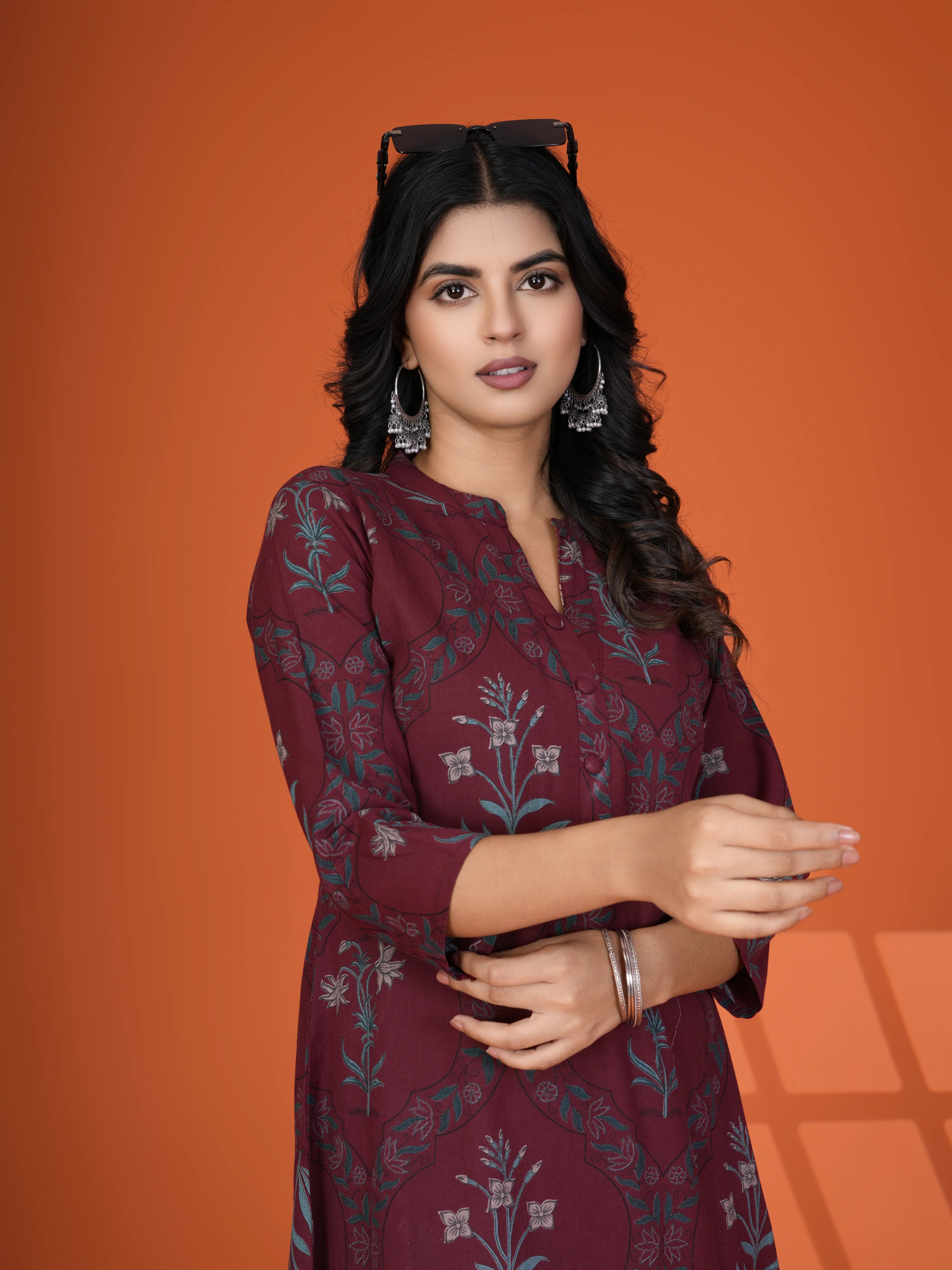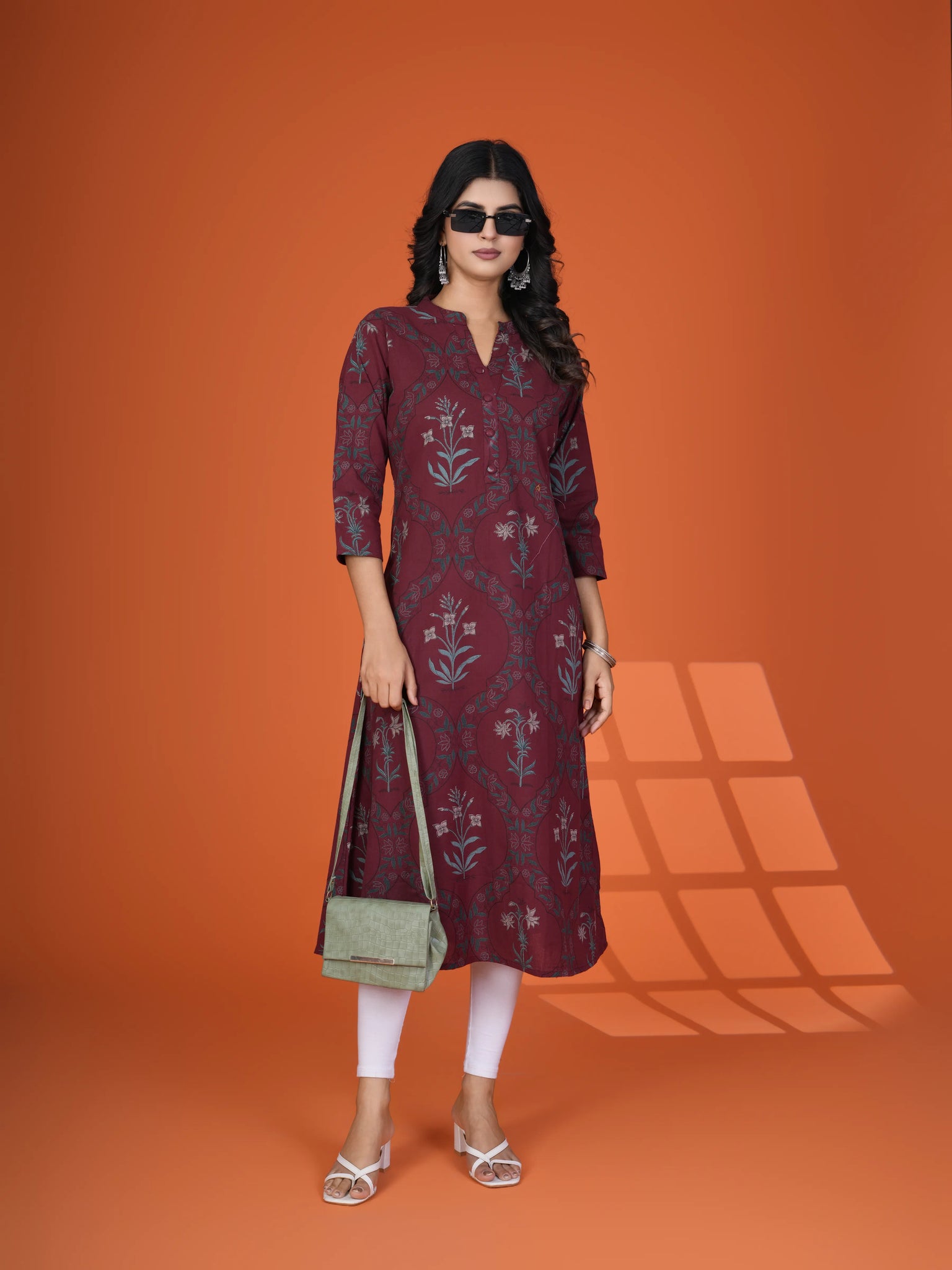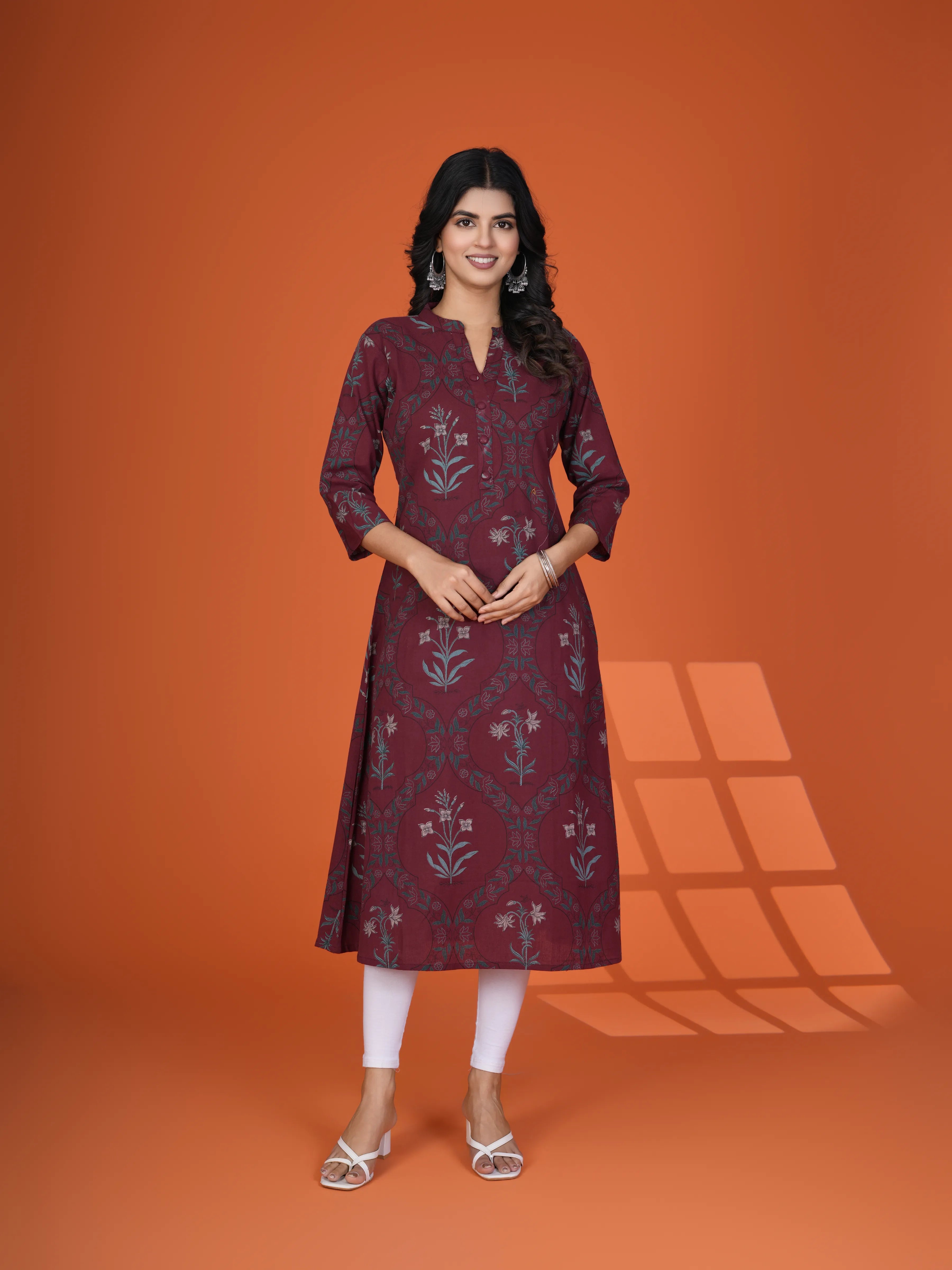 Deep, elegant, and rooted in classic charm — this maroon kurti is a tribute to timeless ethnic grace with a modern minimal twist. Crafted in breathable cotton cambric, it features intricate floral prints in subtle earthy tones, contrasted with fabric-covered buttons for a handcrafted finish.