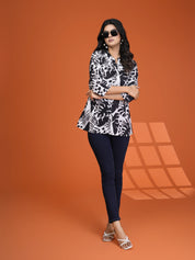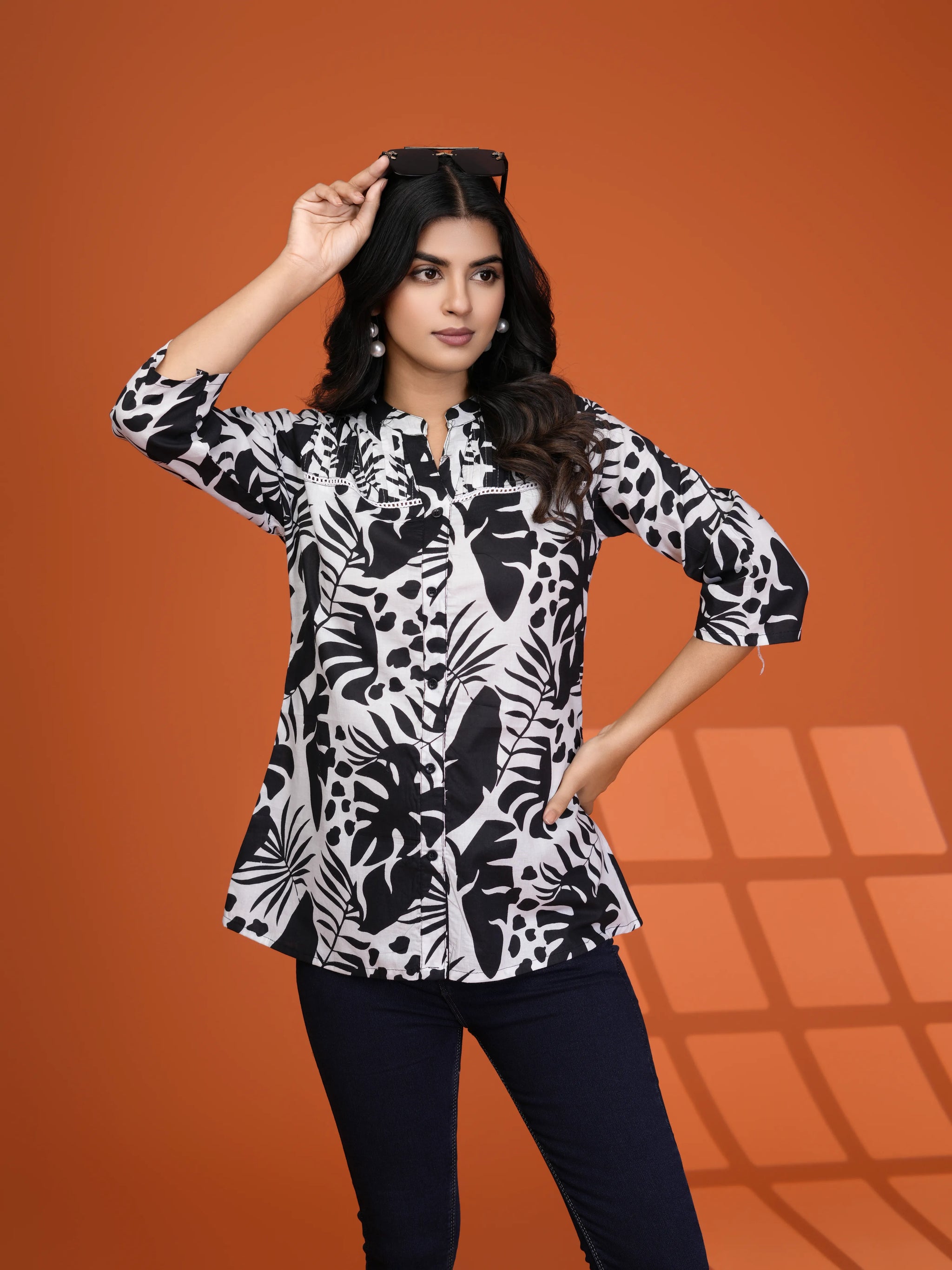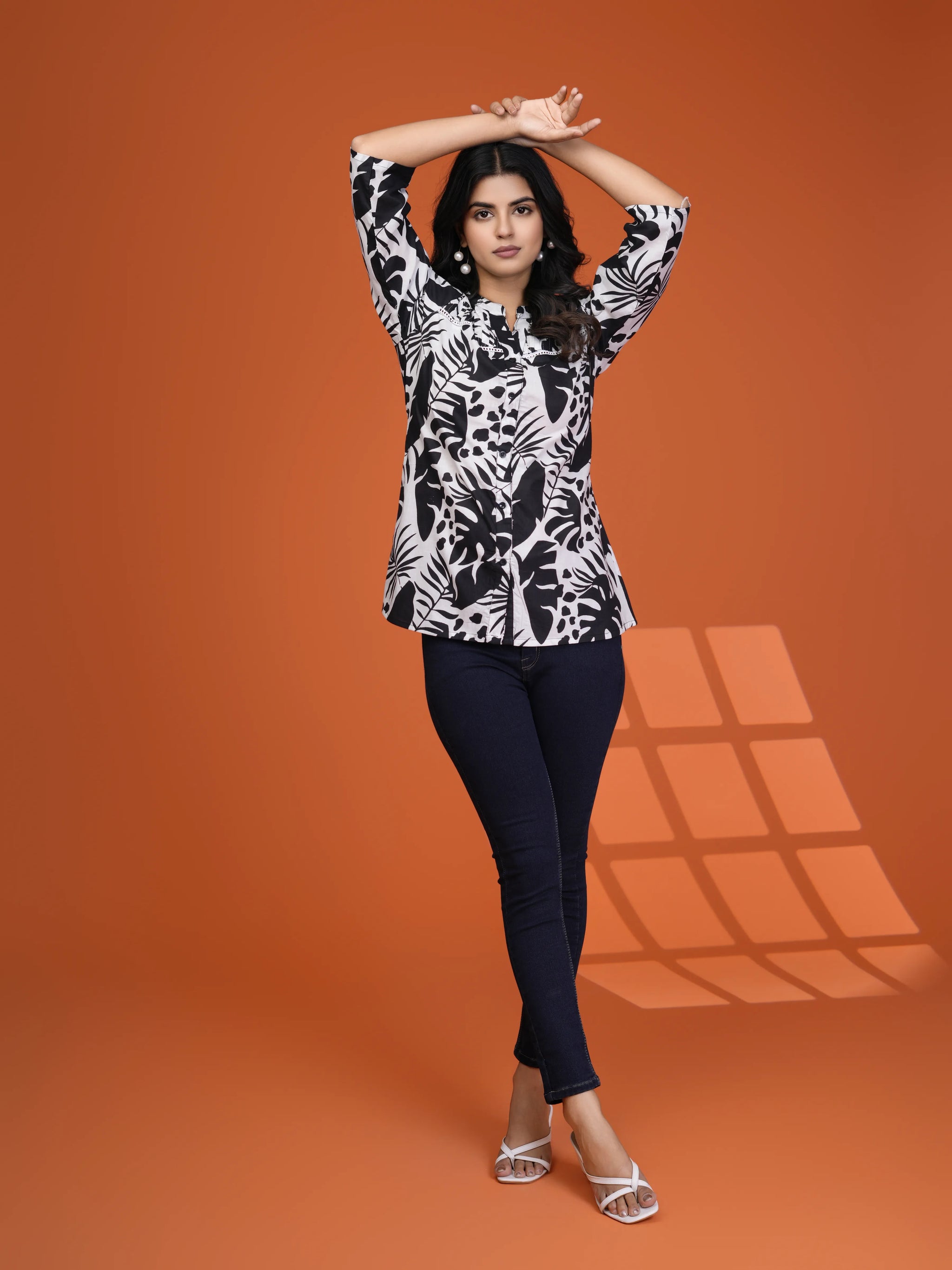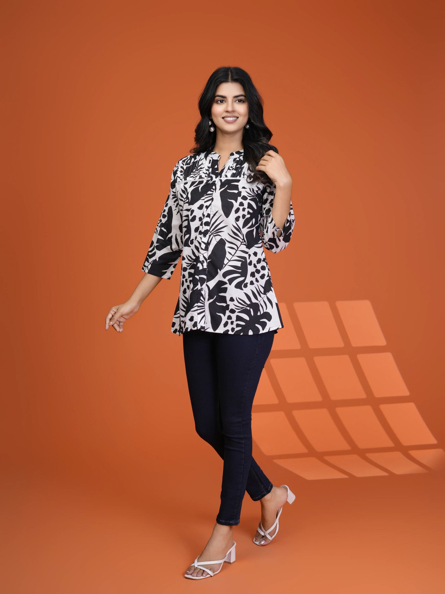 Step into the spotlight with our Urban Edge short kurti – a chic statement in timeless black and white. Designed with bold abstract leaf motifs, this stylish piece fuses modern aesthetics with easy-to-wear comfort.