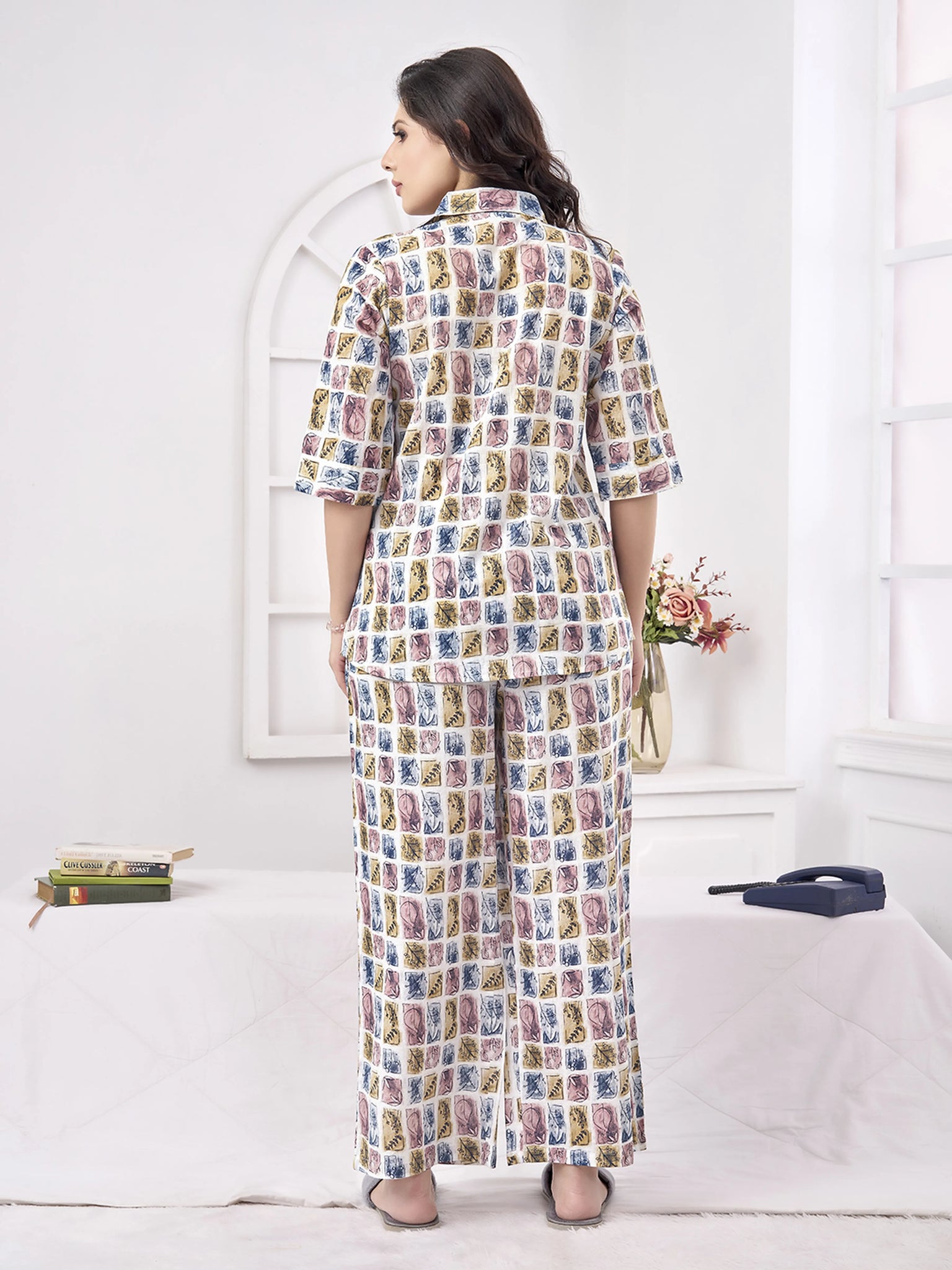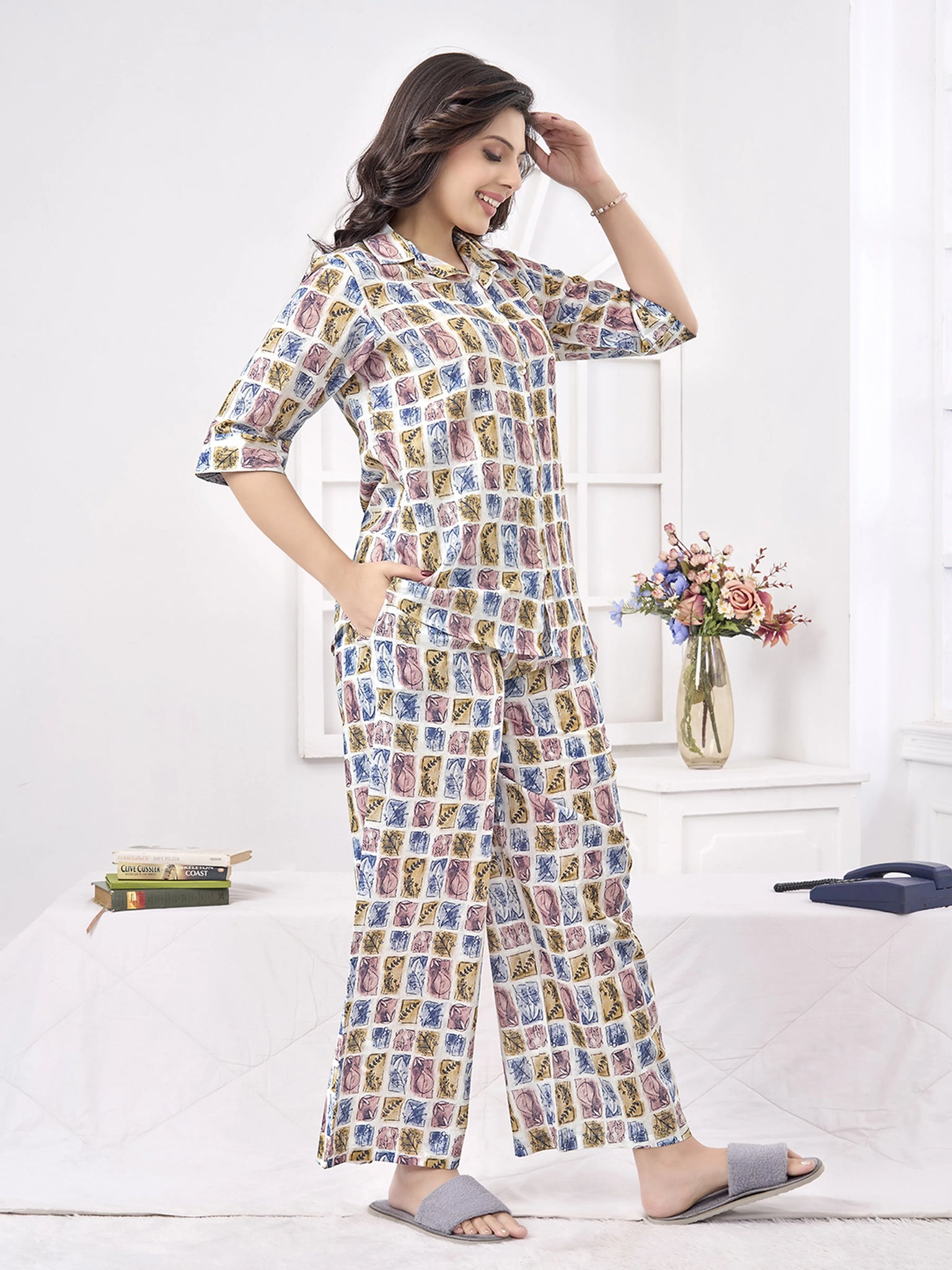 Heritage Mosaic: Multicolor Stamp Print Cotton Co-Ord Set with Shirt Collar Silhouette