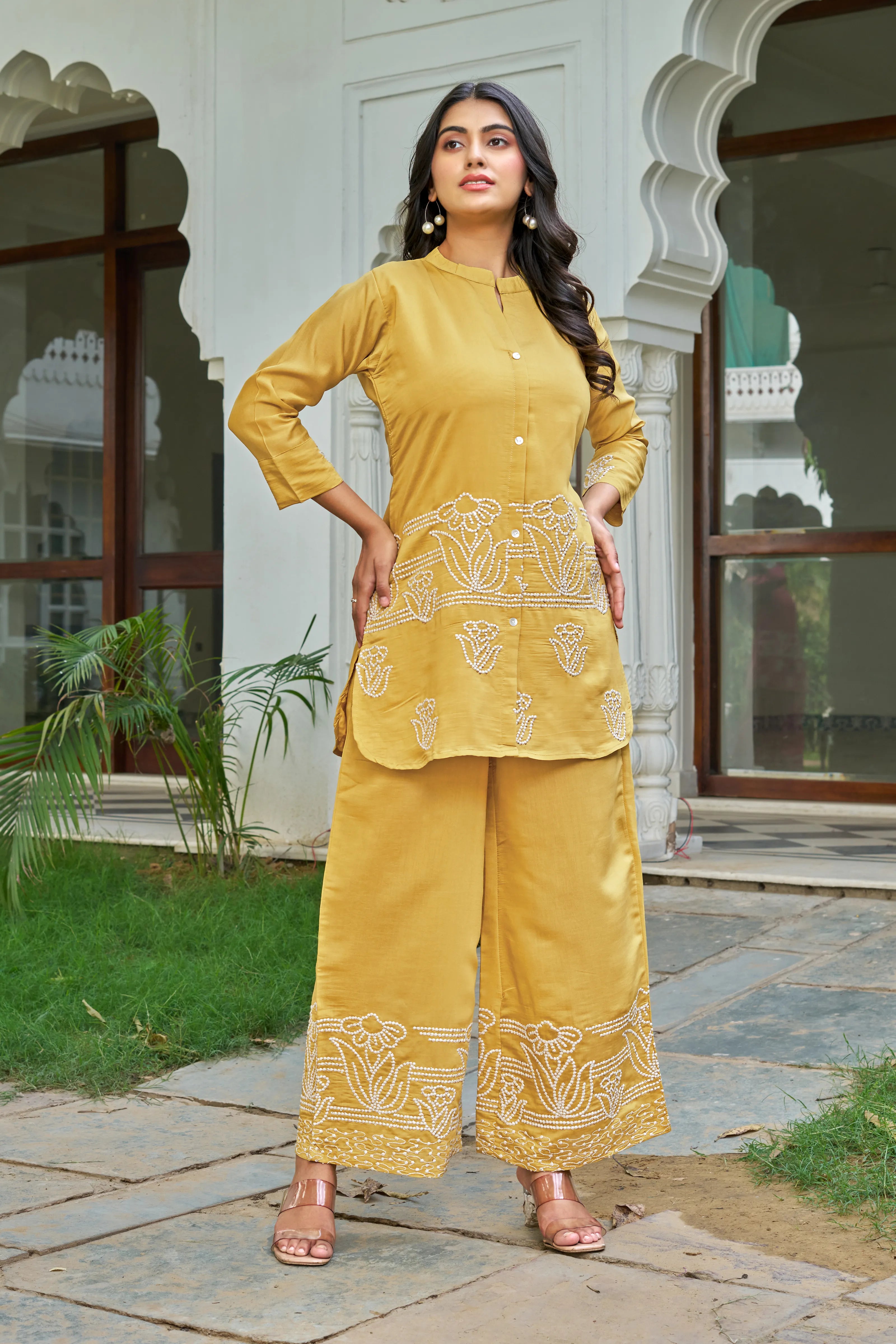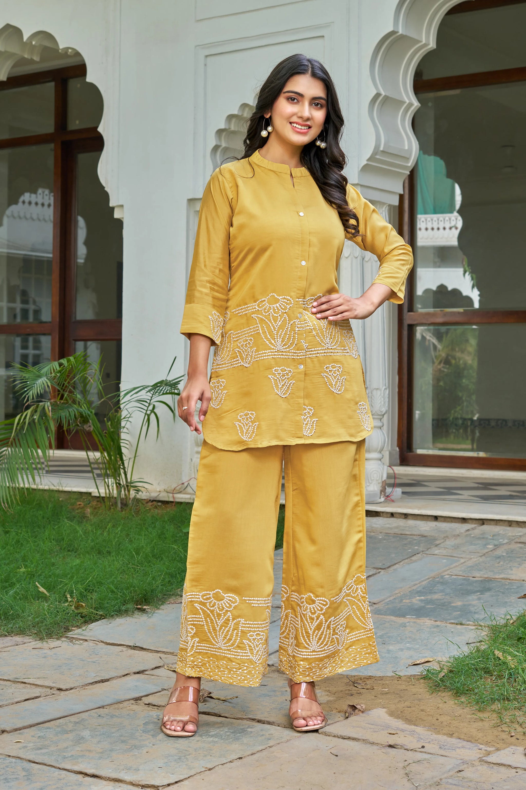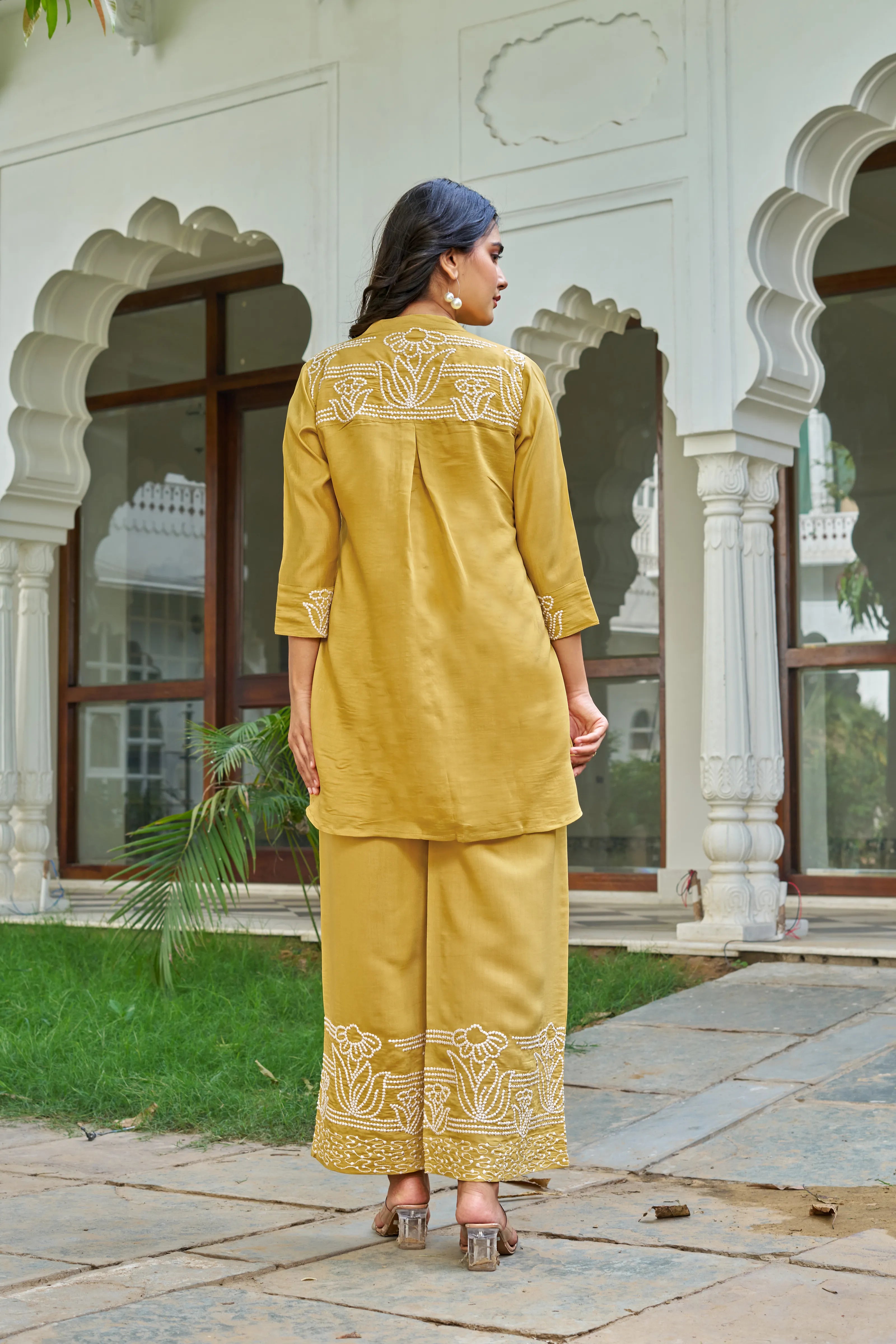 Golden Garden: Mustard Floral Embroidered Silk Co-ord Set
