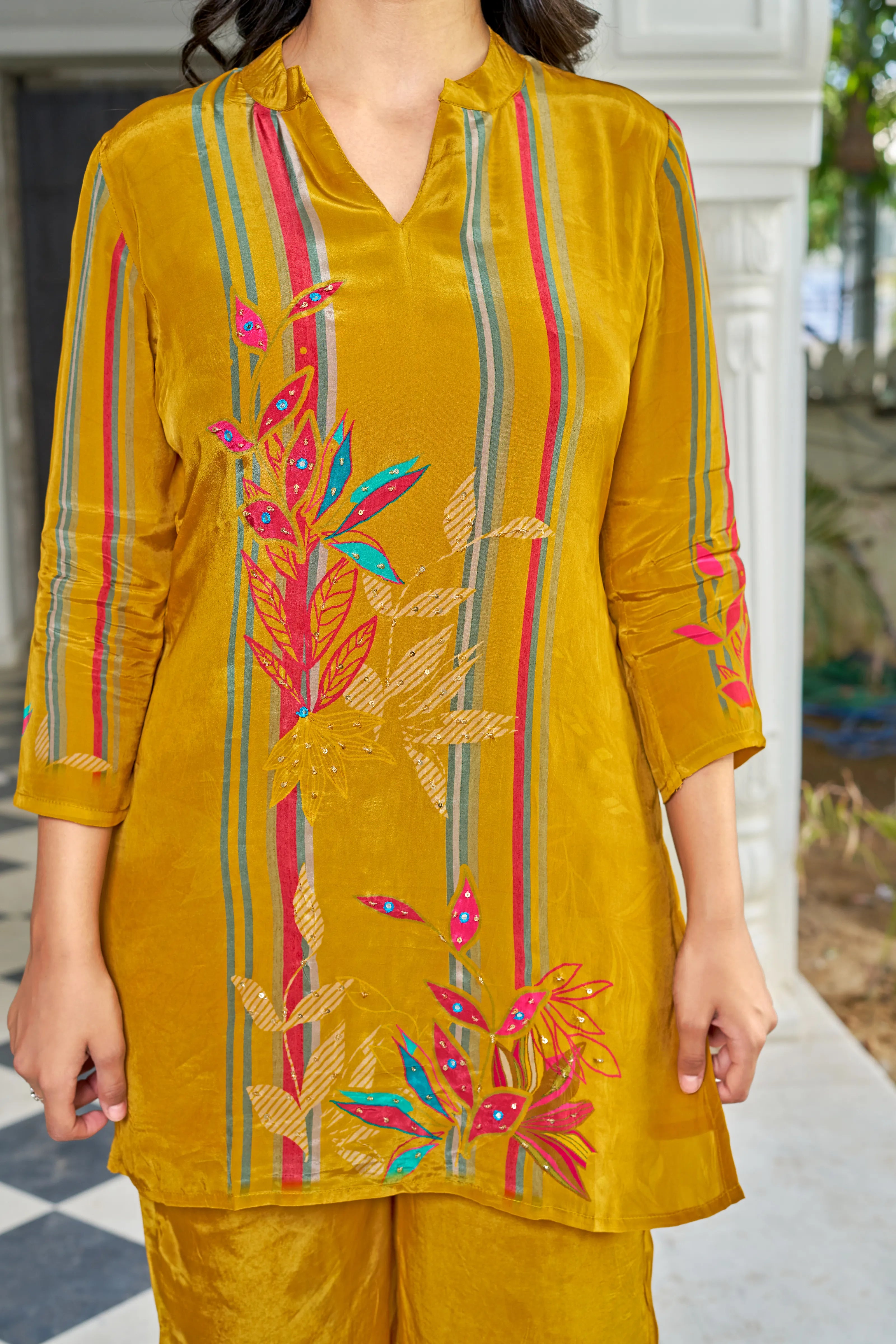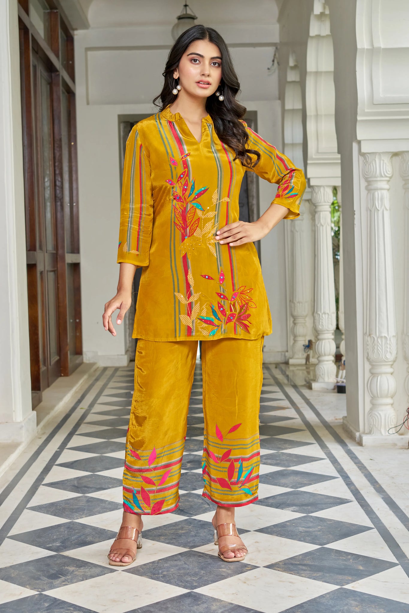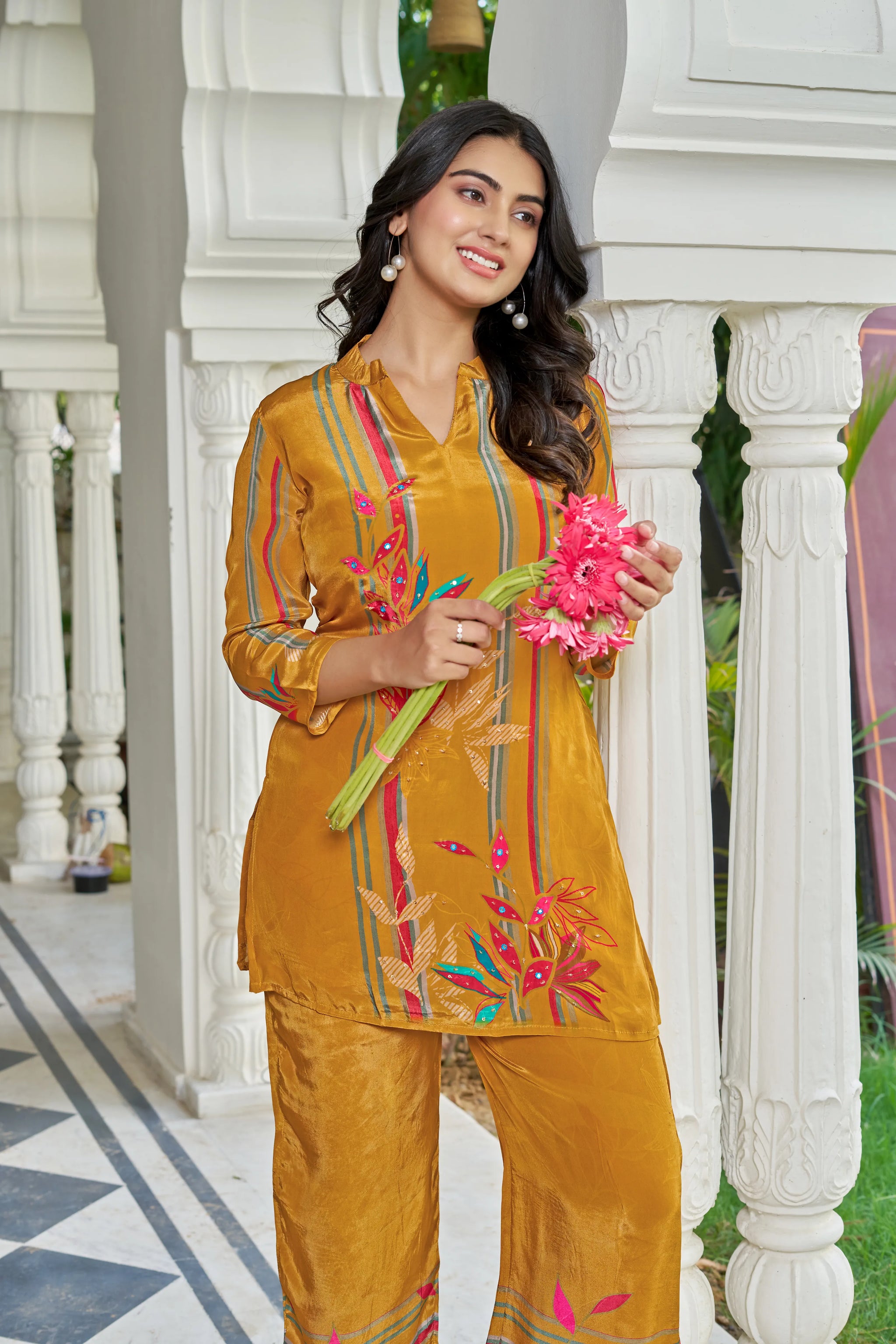 Celebrate sunshine and sophistication with our Golden Grove co-ord set—designed for women who love color with a contemporary edge. The rich mustard yellow base is highlighted with vibrant multicolor stripes and abstract floral placements, enhanced with delicate sequin work for that extra shimmer.