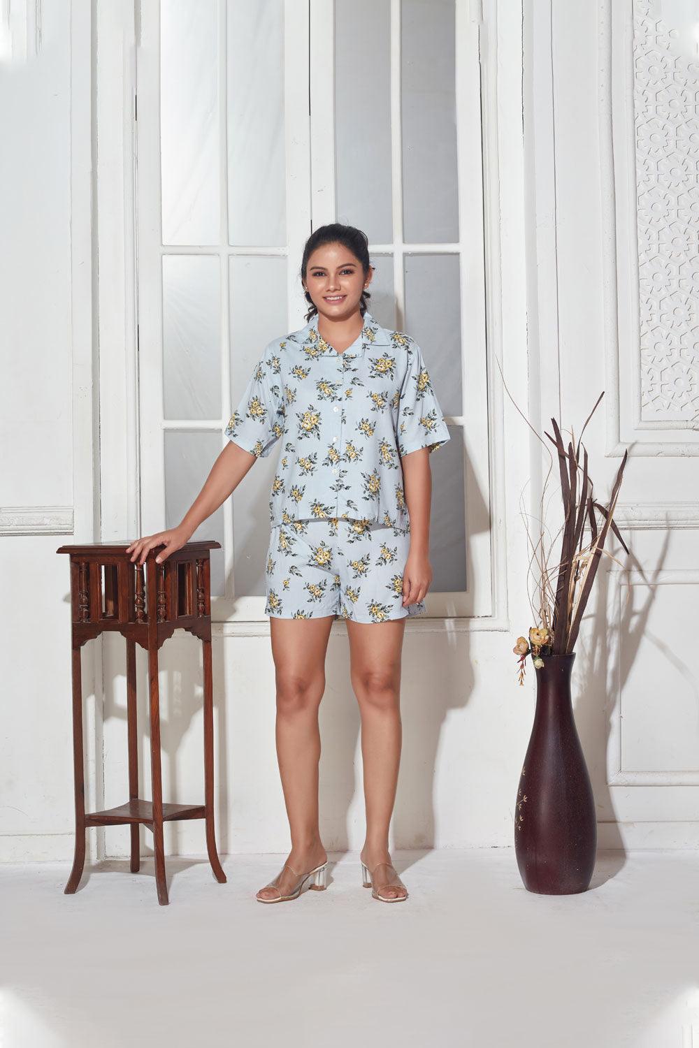 Add a refreshing touch to your wardrobe with this powder blue floral short set, where comfort and style meet effortlessly.