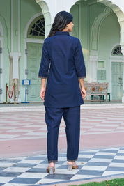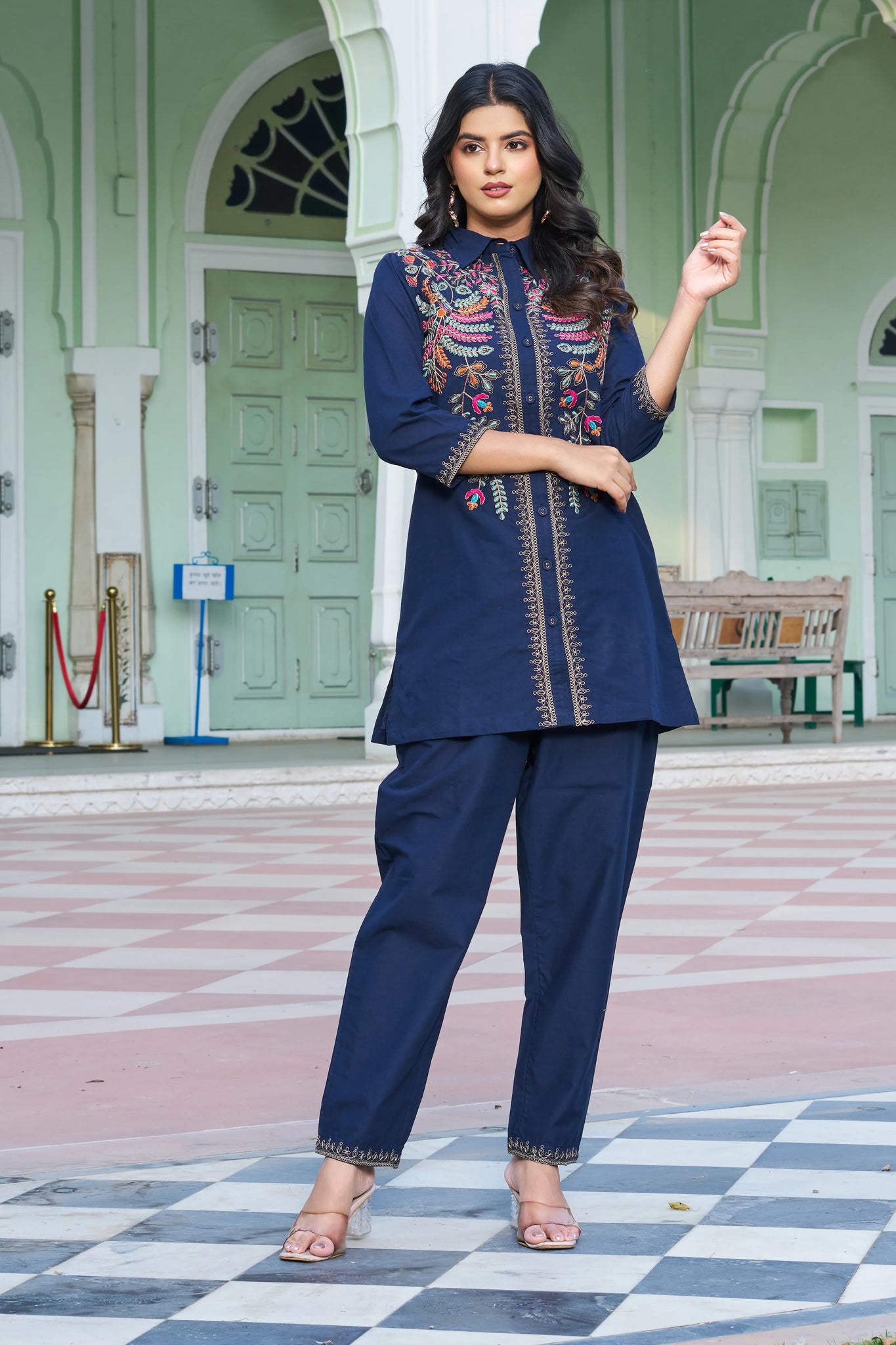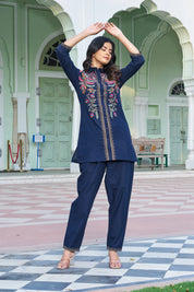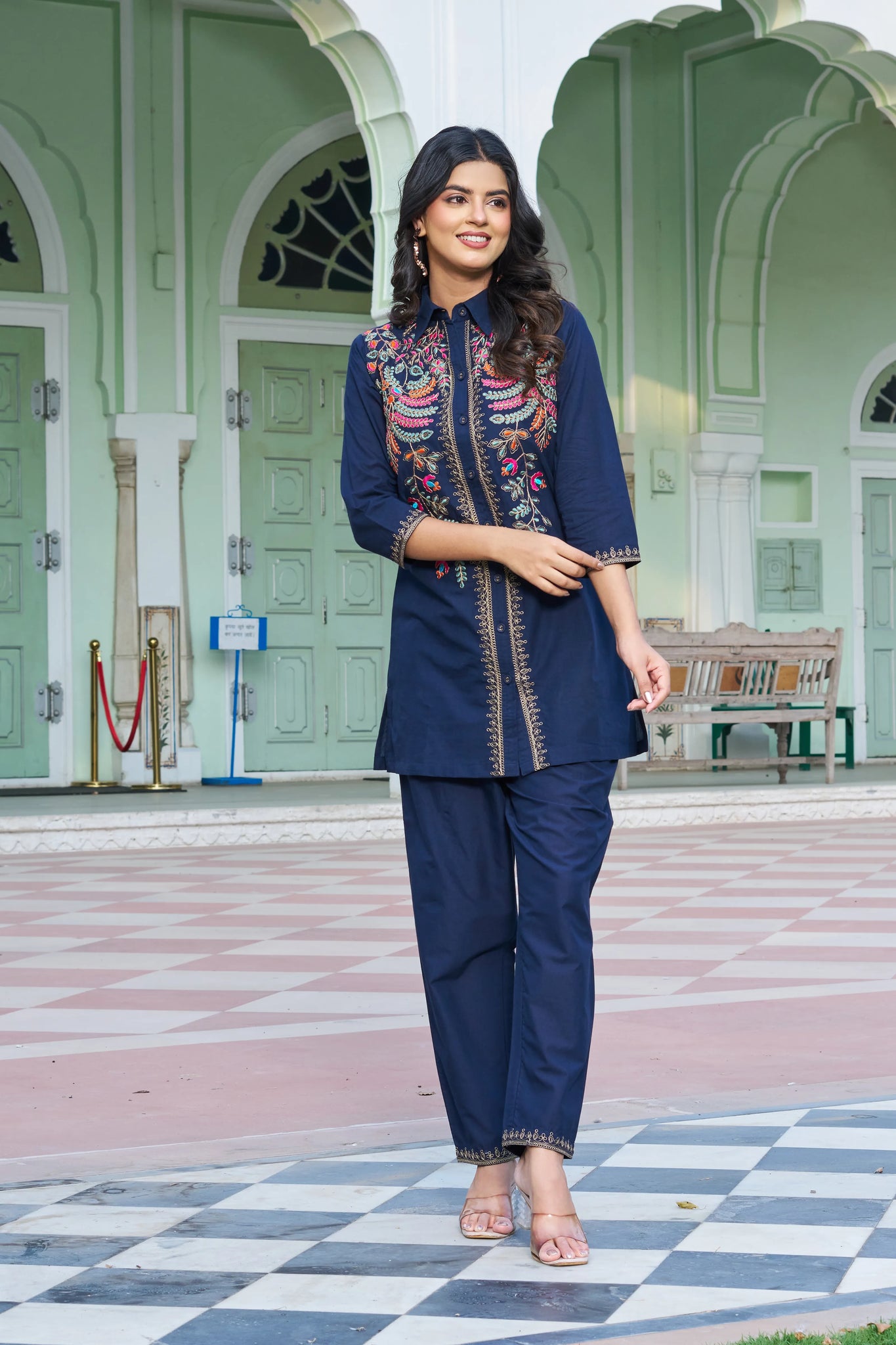 Midnight Garden: Navy Blue Embroidered Rayon Co-ord Set