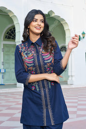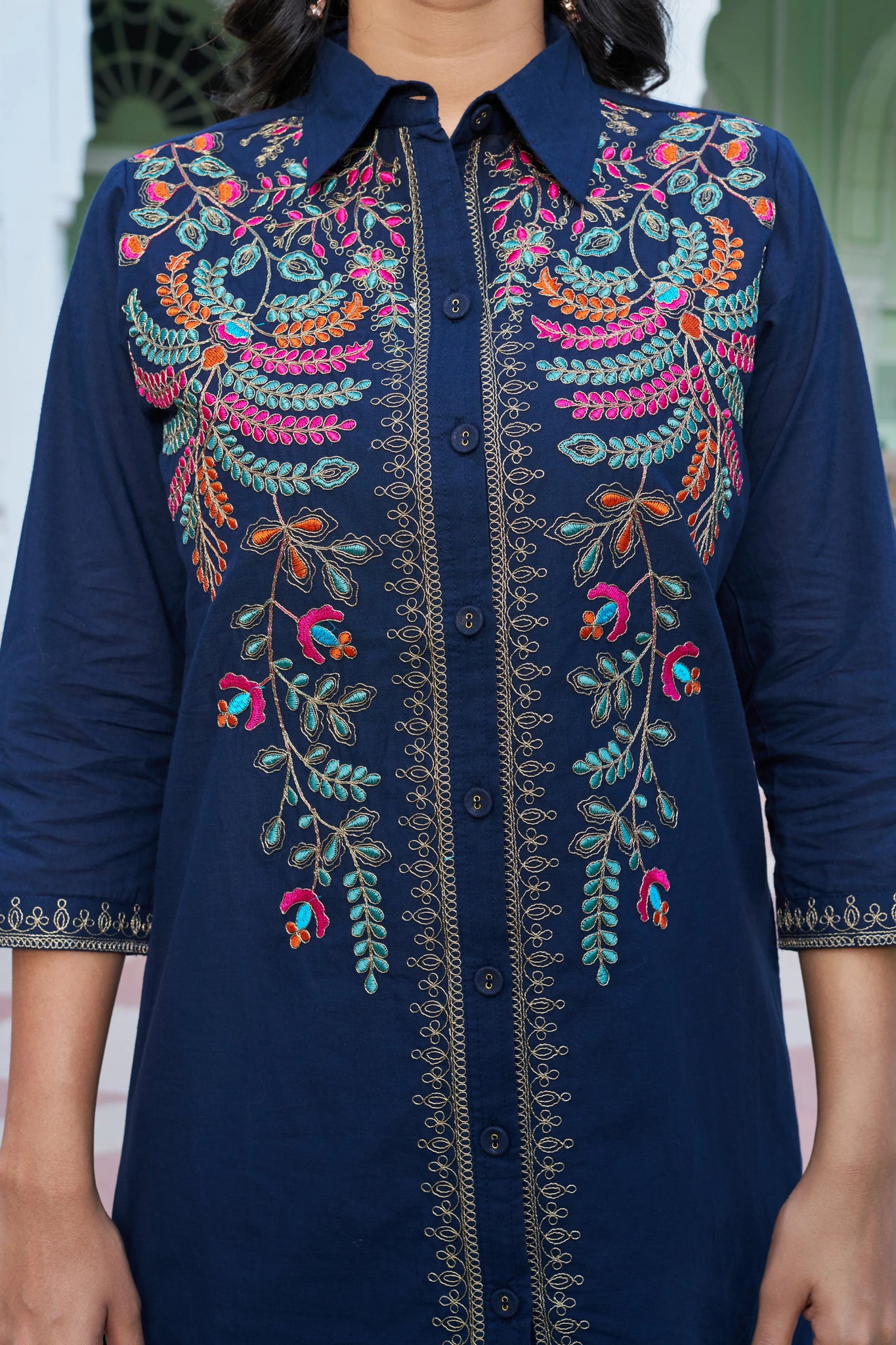 Color: Deep navy blue with vibrant leaf motif embroidery