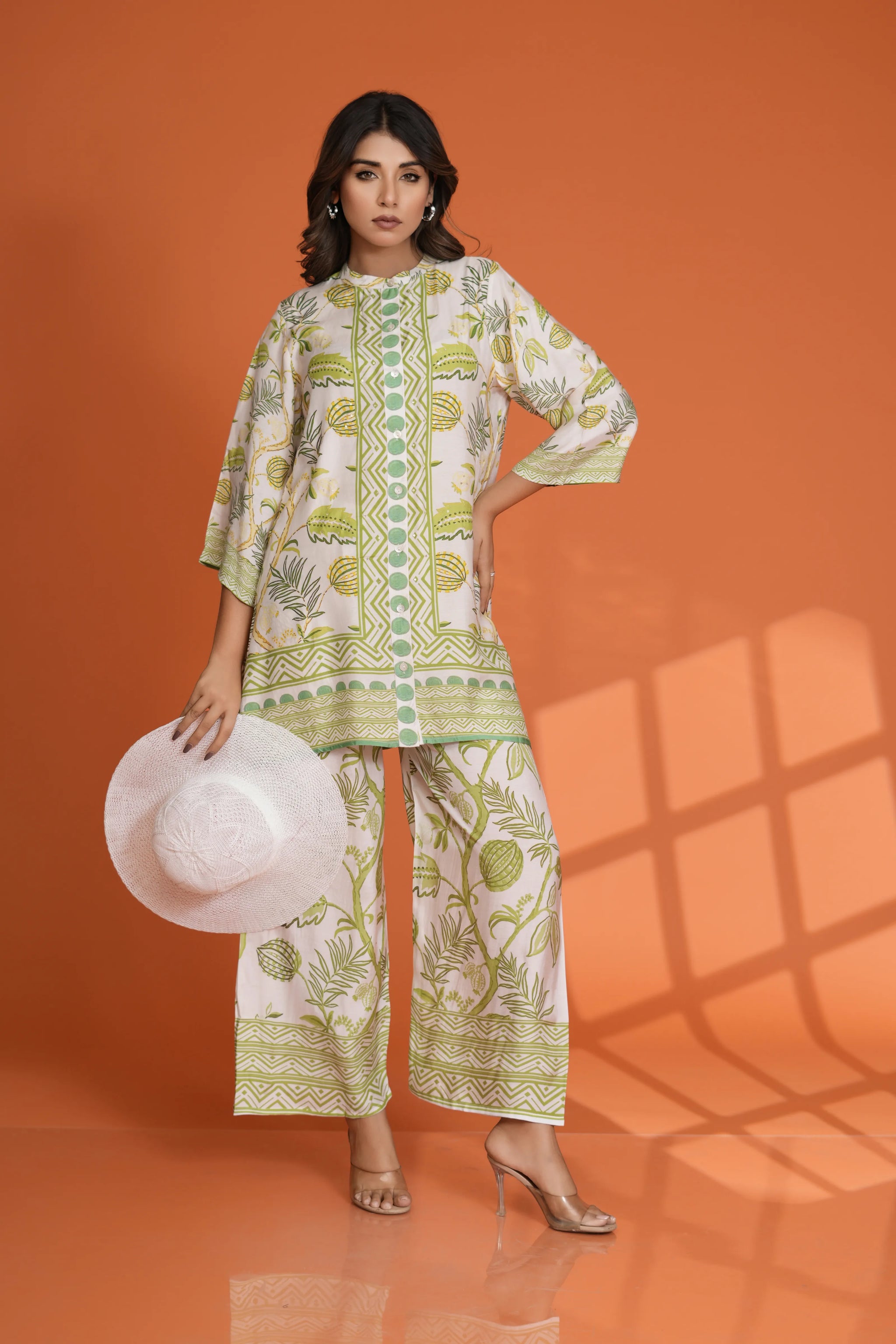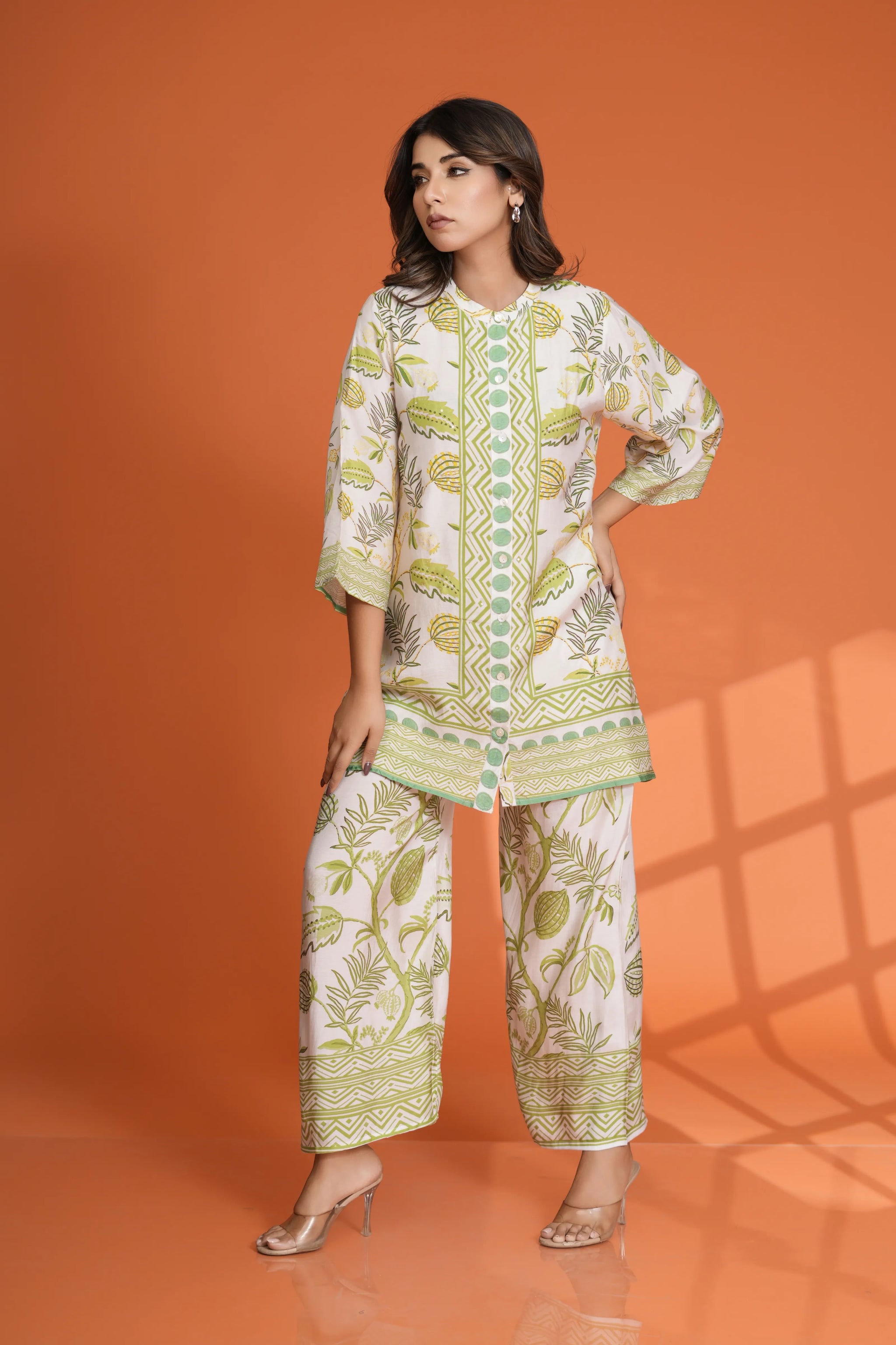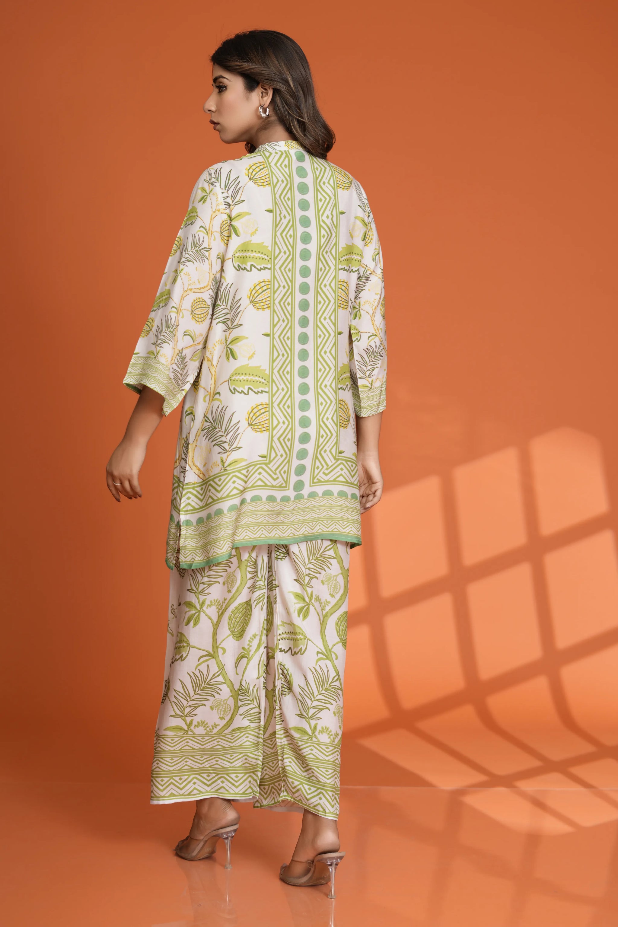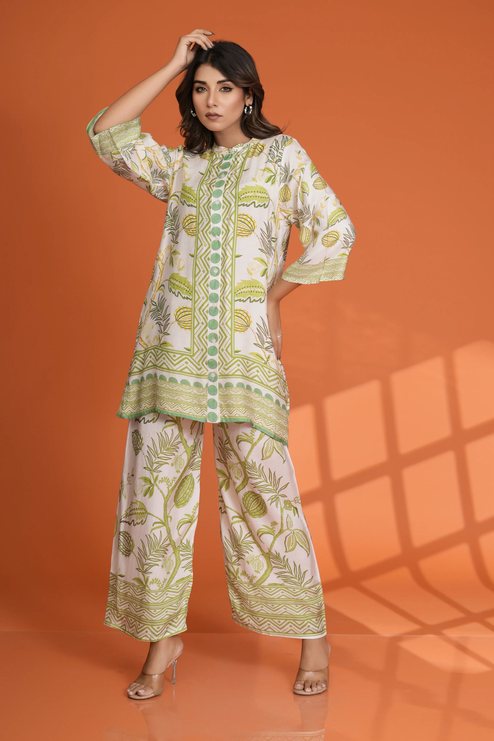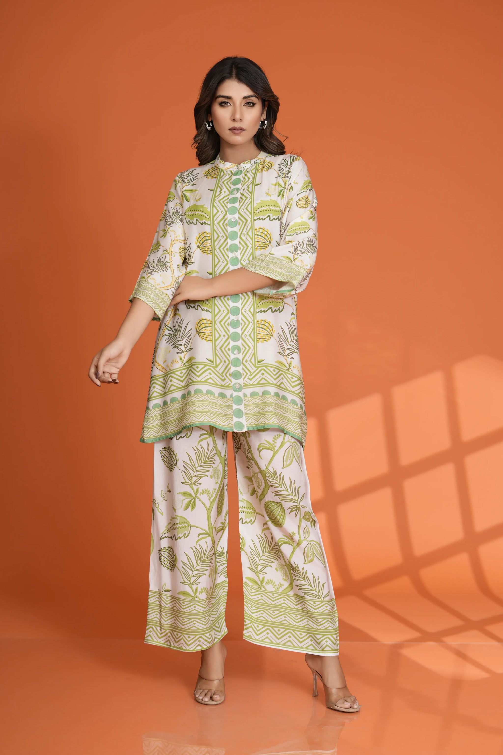 Brighten up your wardrobe with this Off-White Base Co-Ord Set, featuring green and yellow abstract floral prints that exude a refreshing yet elegant vibe. Made in soft, breathable viscose muslin, the set is designed with a Mandarin collar, button-down front, and shimmering sequin work detailing on the 3/4th sleeves, adding a hint of festive sparkle.