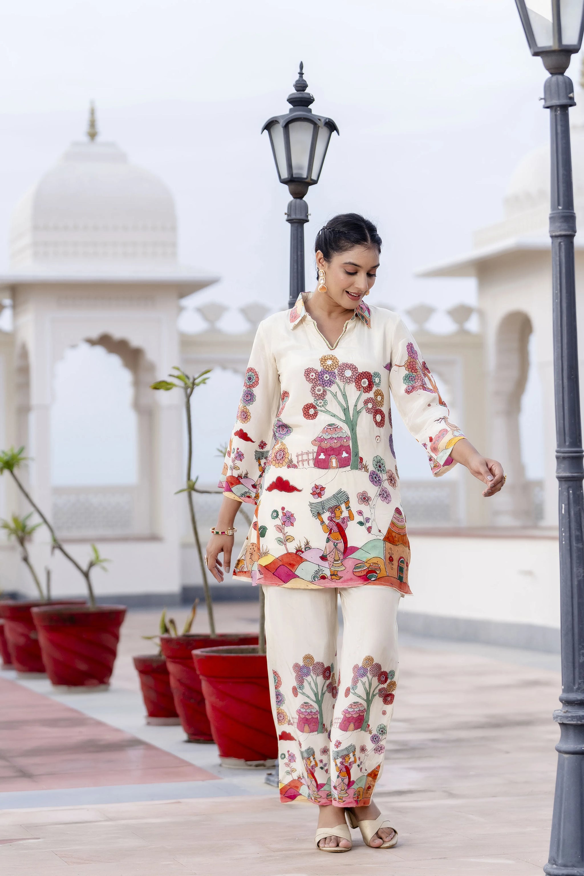 Rooted in nostalgia and bursting with folk art charm, this kurti set brings storytelling to style. The cream-hued short kurti is adorned with a vibrant village life print that speaks of simplicity and tradition. A shirt-style collar and 3/4th sleeves keep it crisp, while delicate bead and mirror embroidery around the neckline adds just the right touch of festive sparkle. The coordinating printed straight pants mirror the scenic motif, creating a look that's both playful and culturally rich.