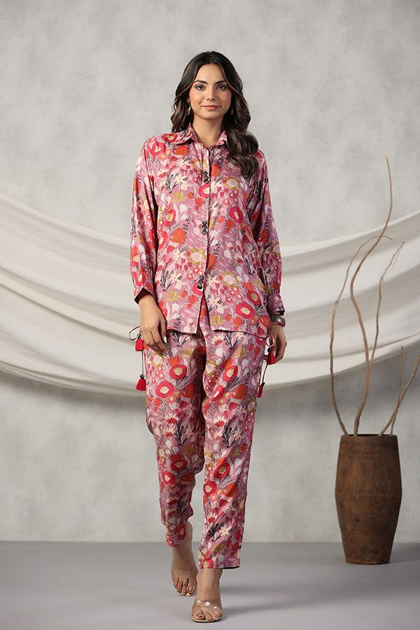 Add a burst of color and style to your wardrobe with the Ojal Floral Multicolor Co-Ord Set. This lively set features a lapel collar with playful tassel detailing and full relaxed sleeves adorned with matching tassels, adding a touch of boho charm to your look. The abstract floral print, paired with the woven muslin fabric, ensures both comfort and a vibrant, eye-catching appeal—perfect for any relaxed daywear occasion.