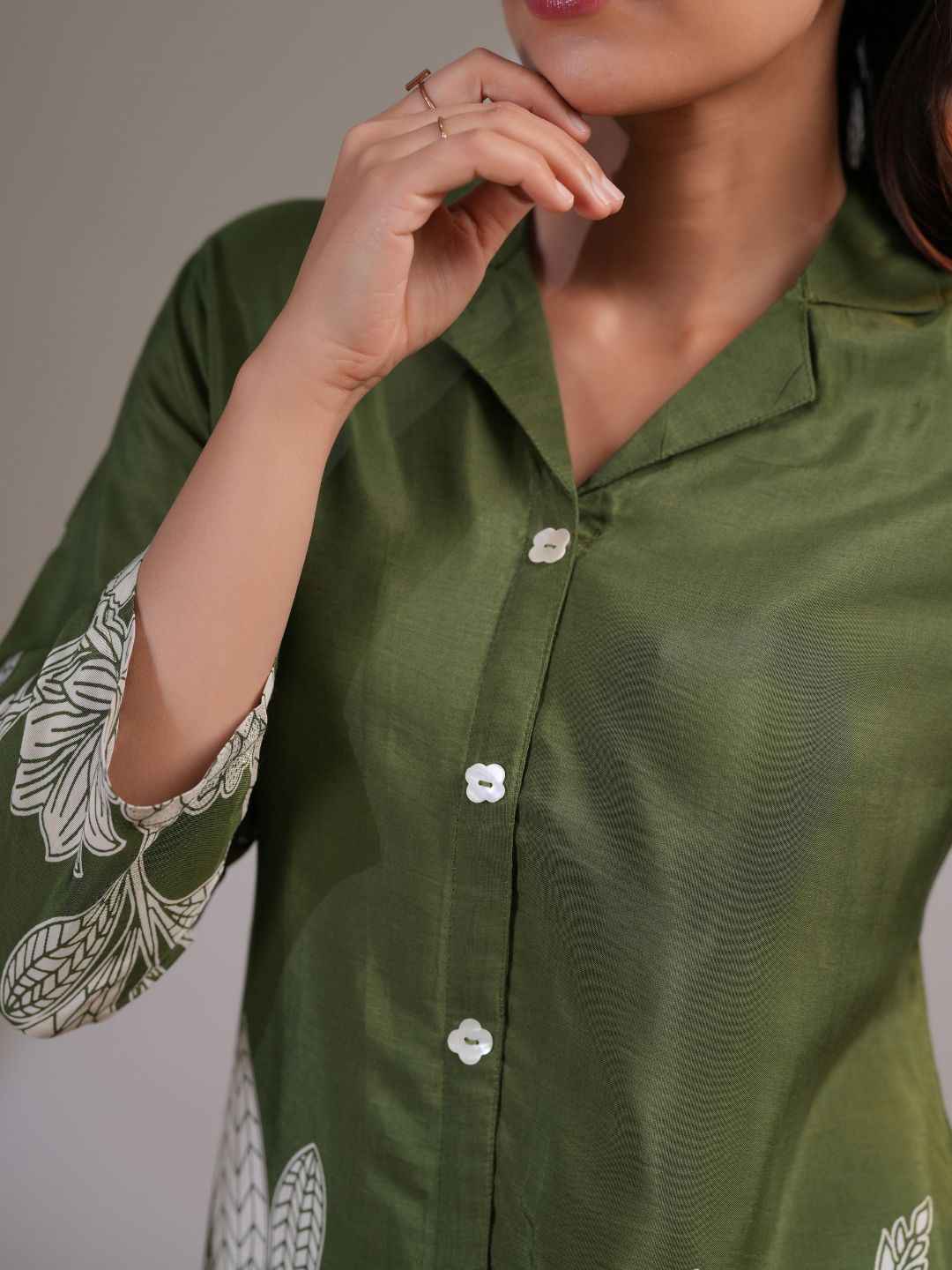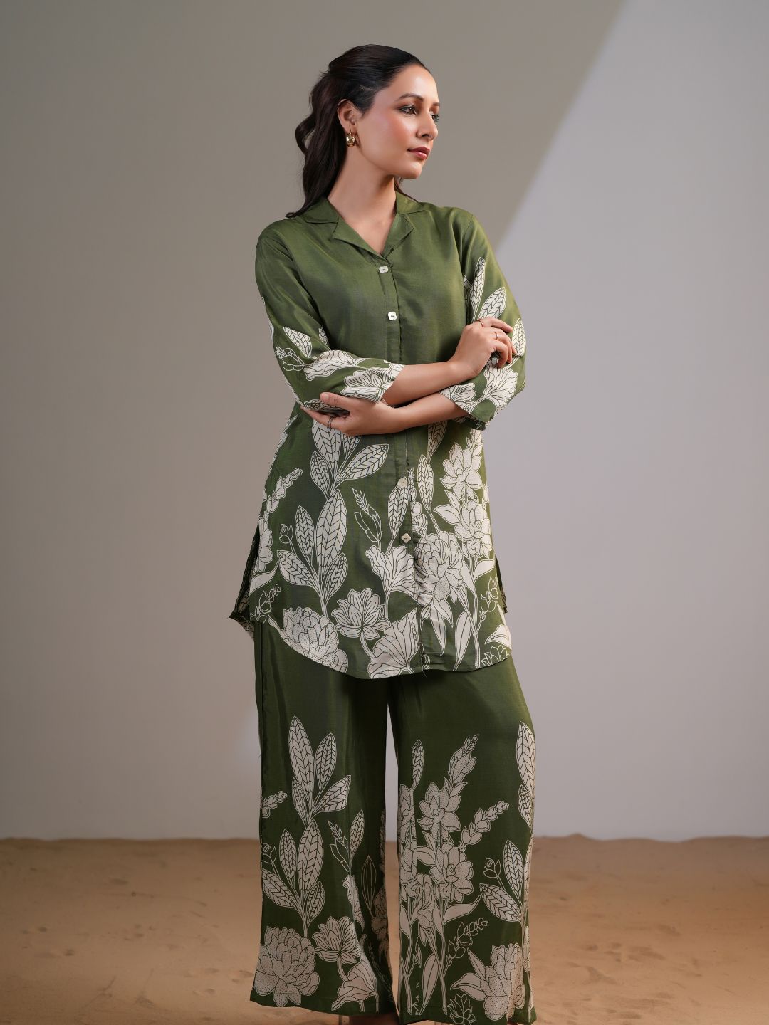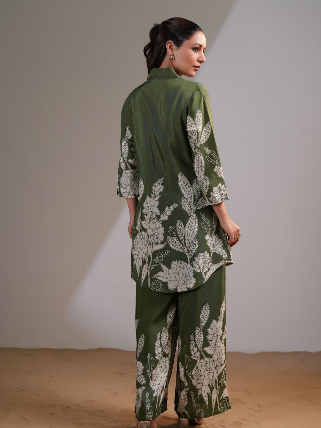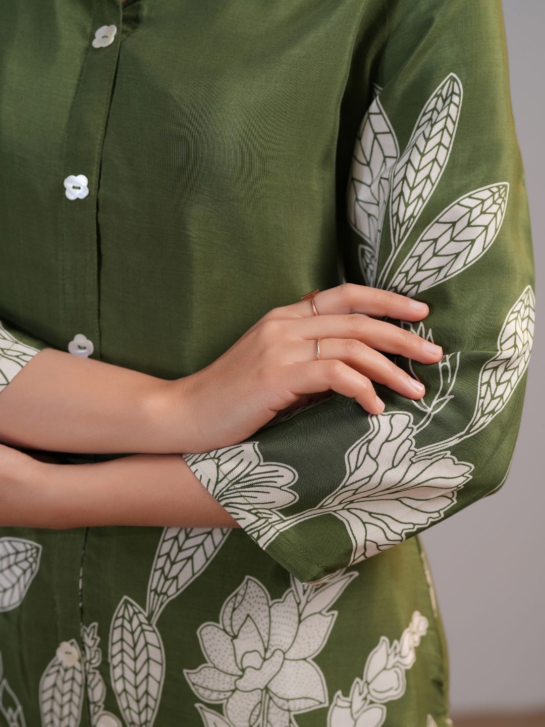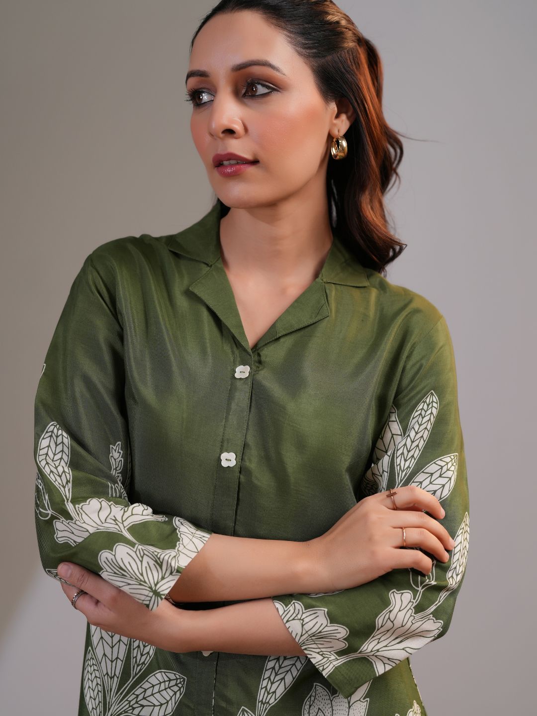 Olive Green Floral Printed Russian Silk Co-Ord Set with Shell Button Embellishments