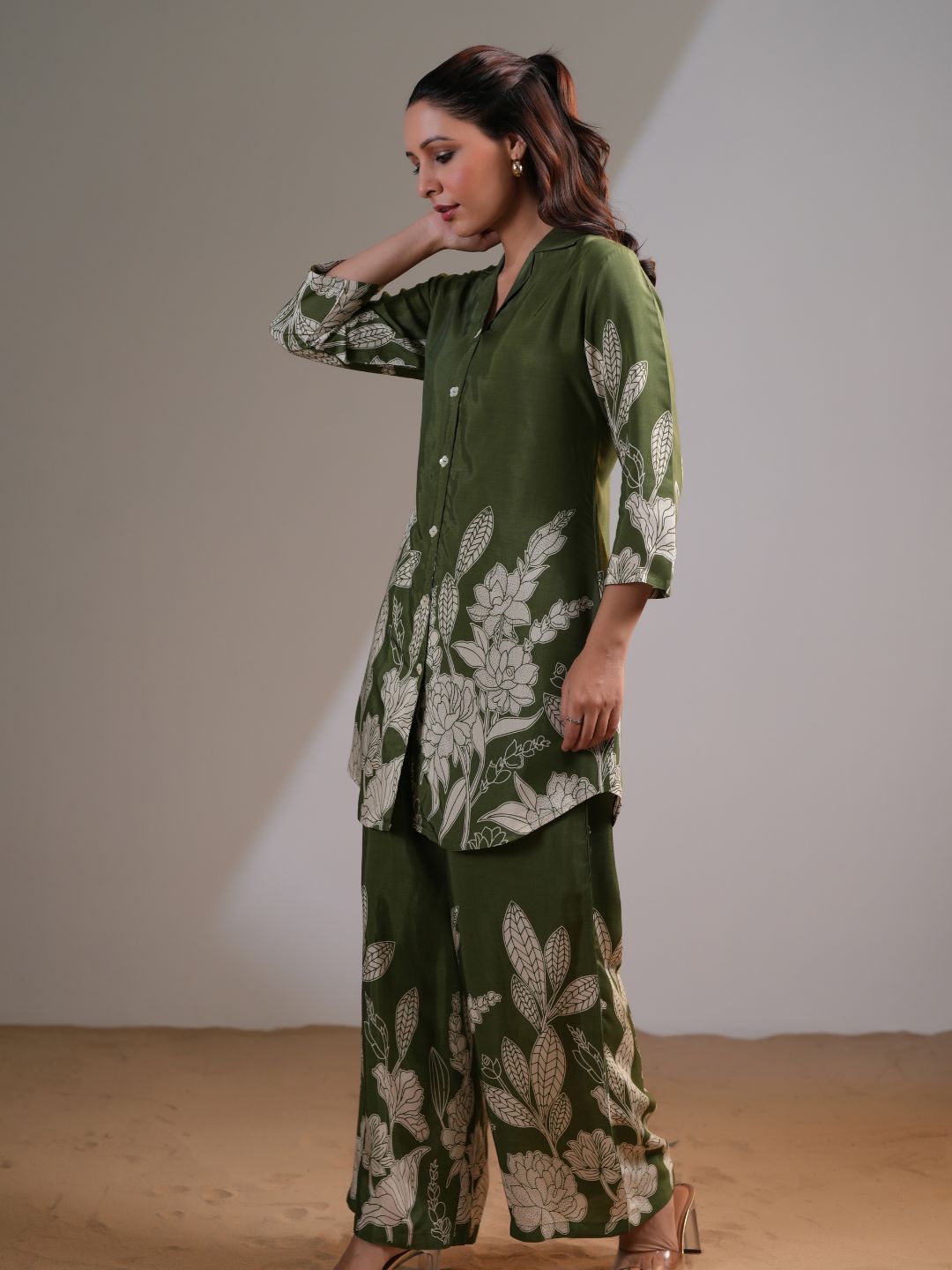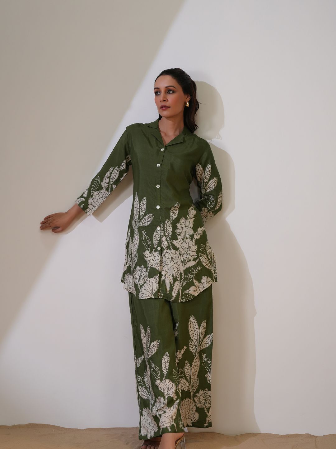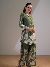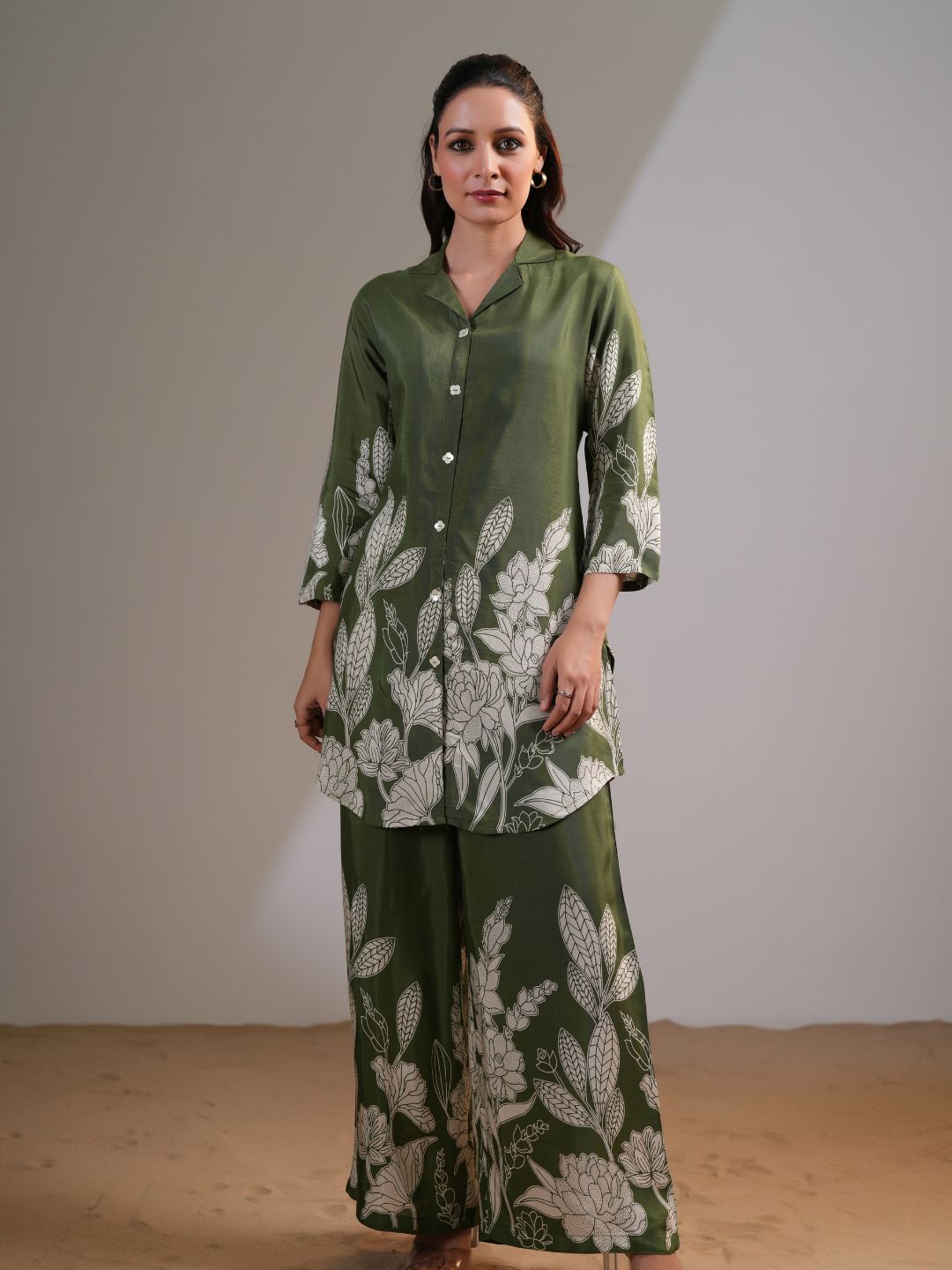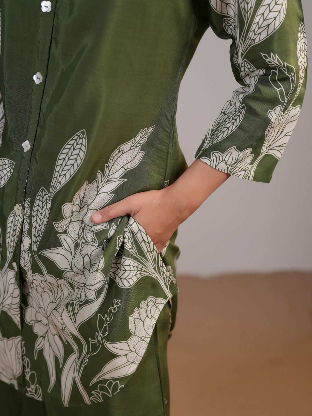 Olive Green Floral Printed Russian Silk Co-Ord Set with Shell Button Embellishments