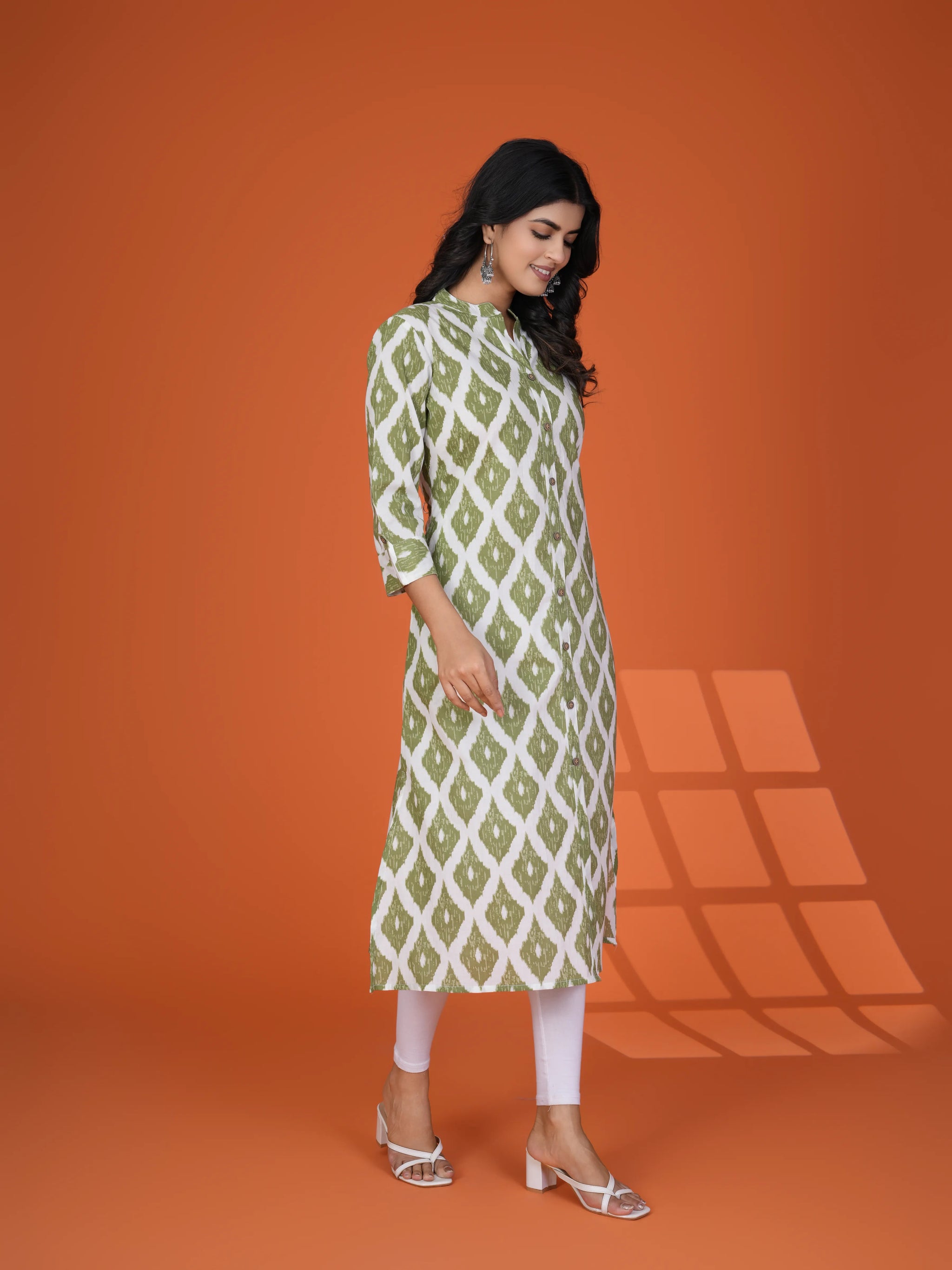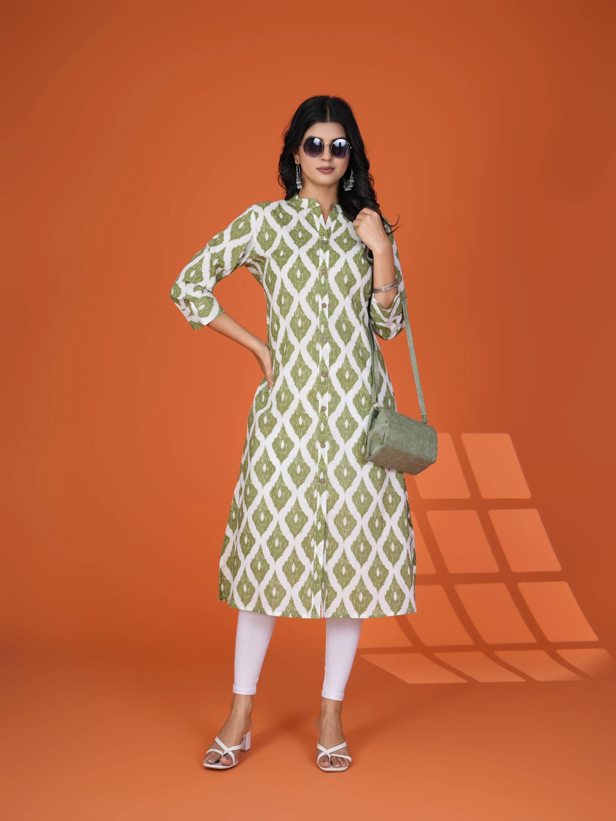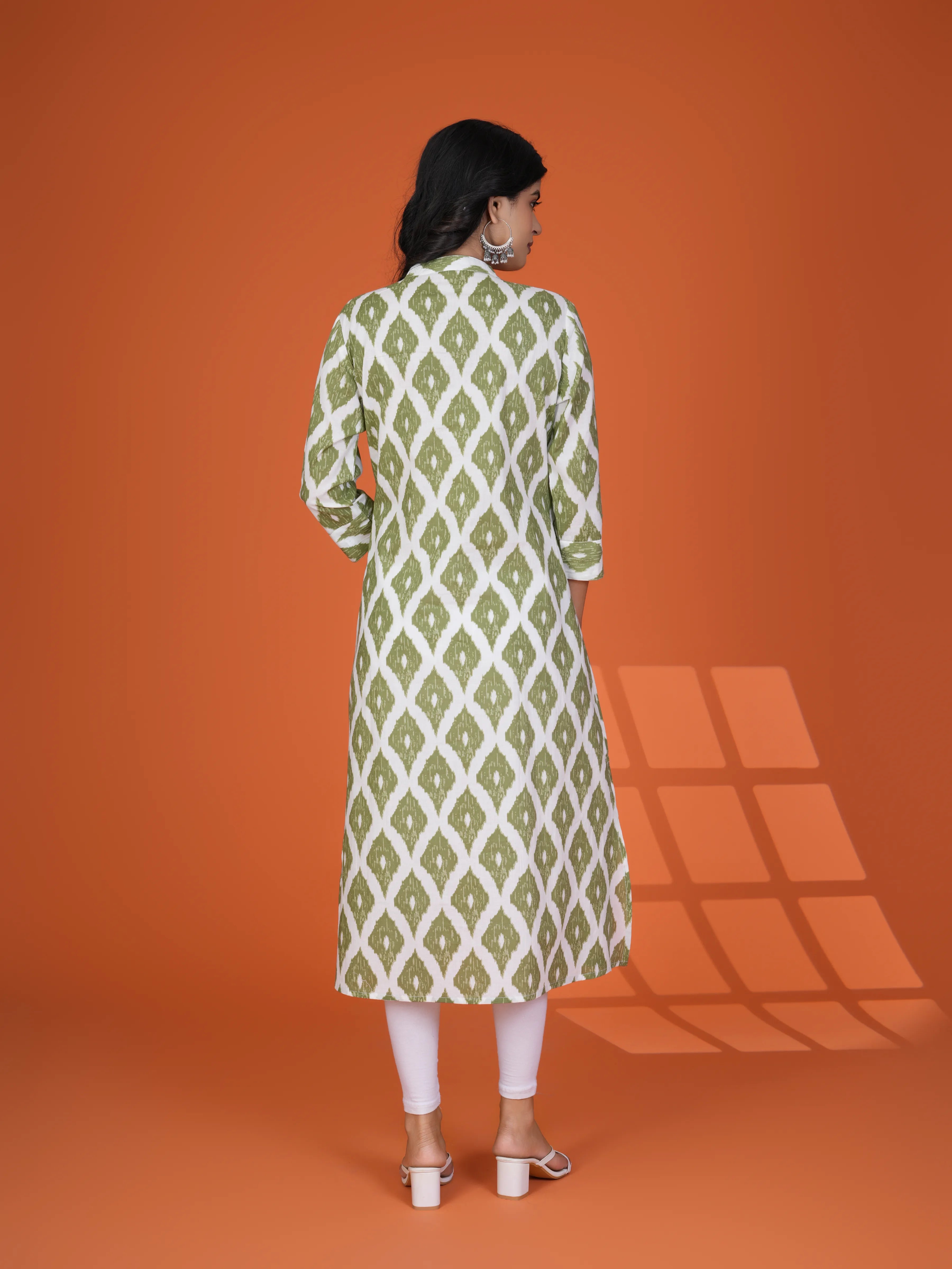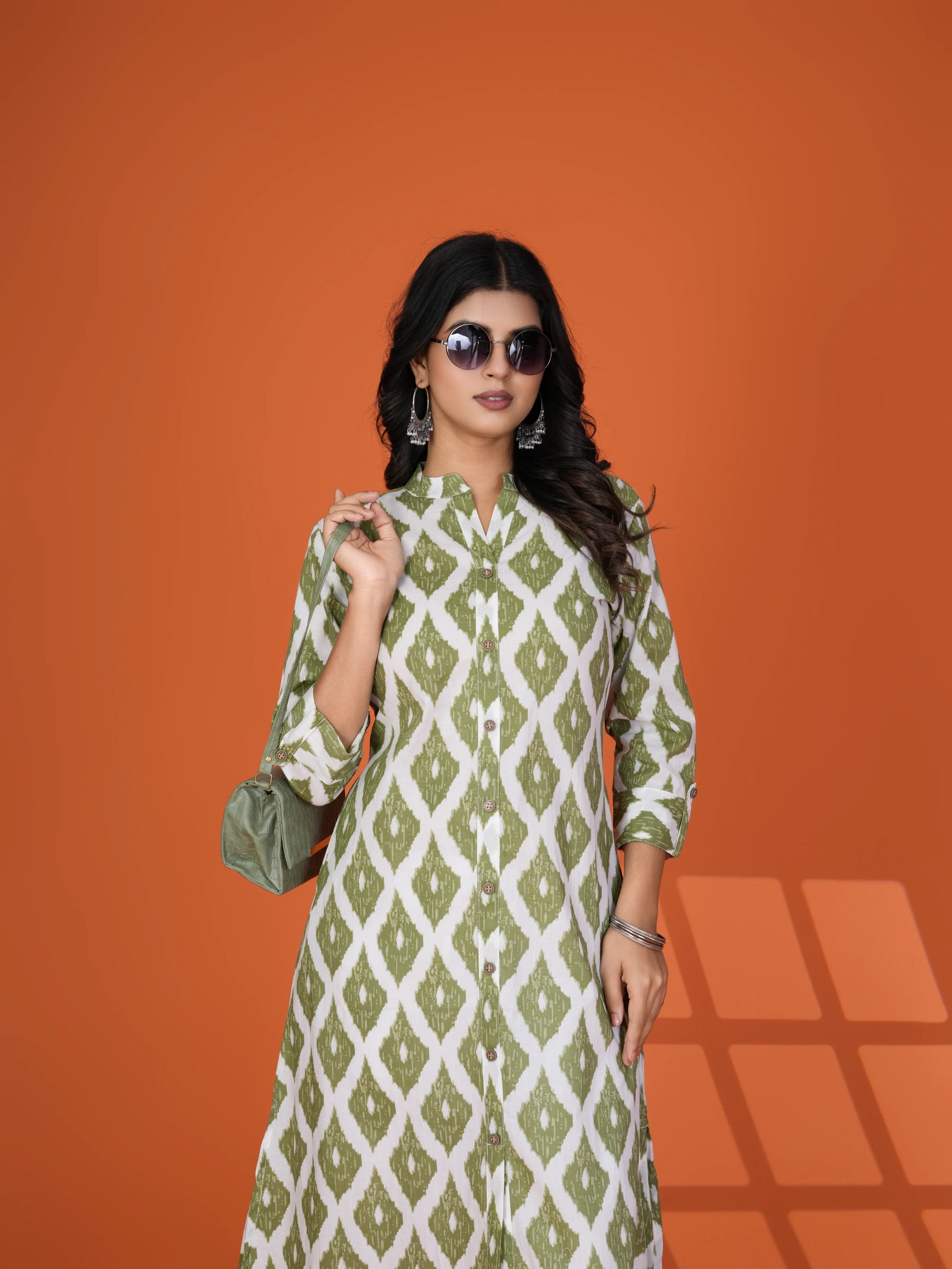 Redefine contemporary tradition with this elegant long kurti in a white base with olive green ikkat-inspired prints. Crafted from breathable cotton cambric, this button-down silhouette exudes ease and structure—offering a beautiful fusion of ethnic design and modern-day wearability.