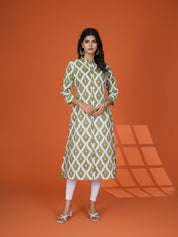 Olive Ikkat Print Long Kurti in Cotton Cambric