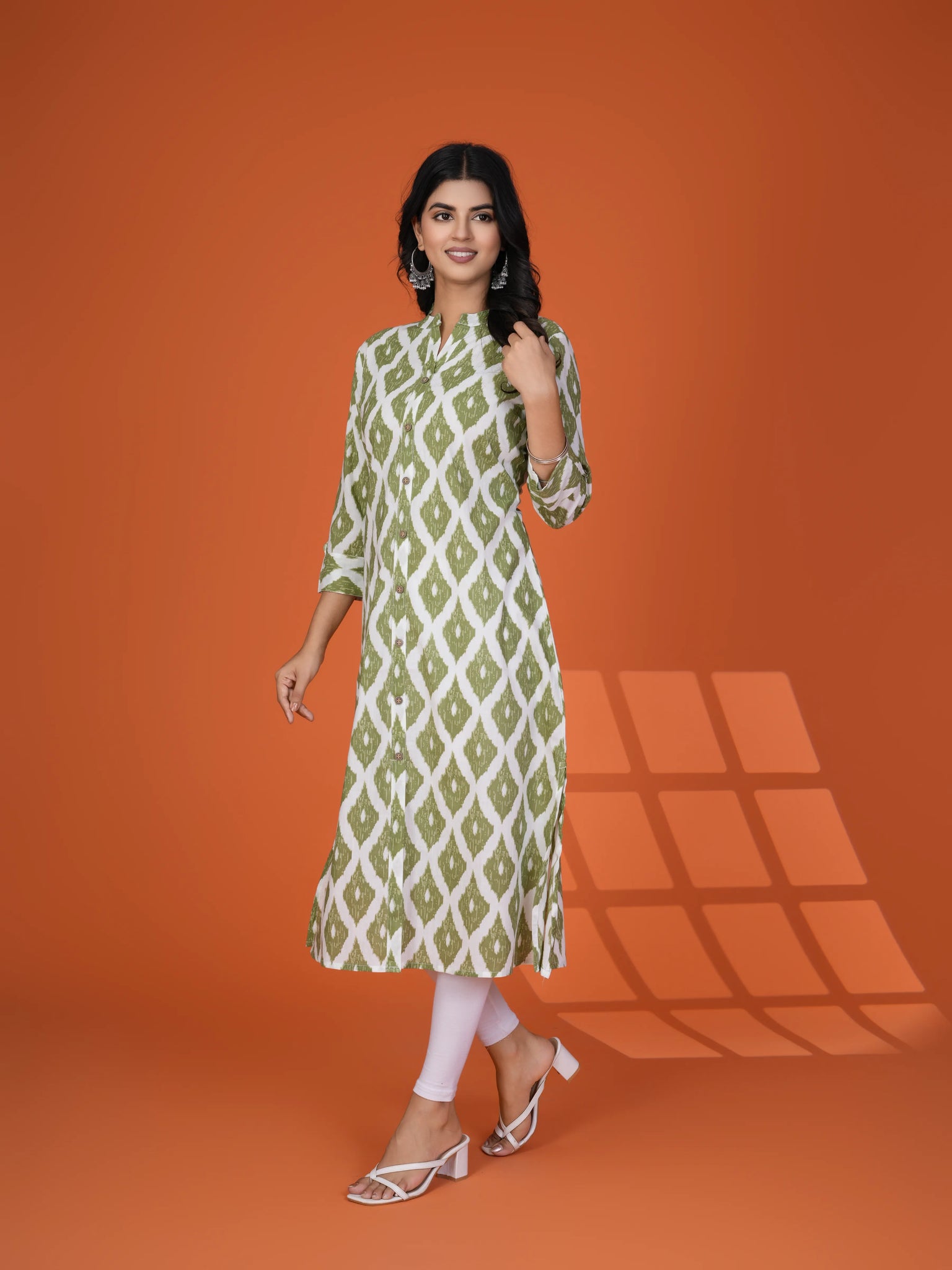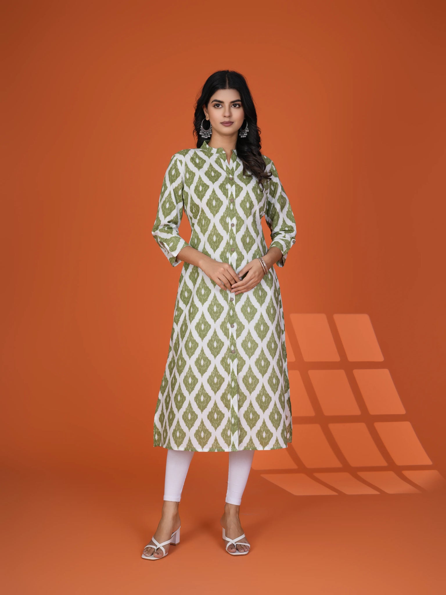 Verdant Rhythm: Olive Ikkat Print Long Kurti in Cotton Cambric