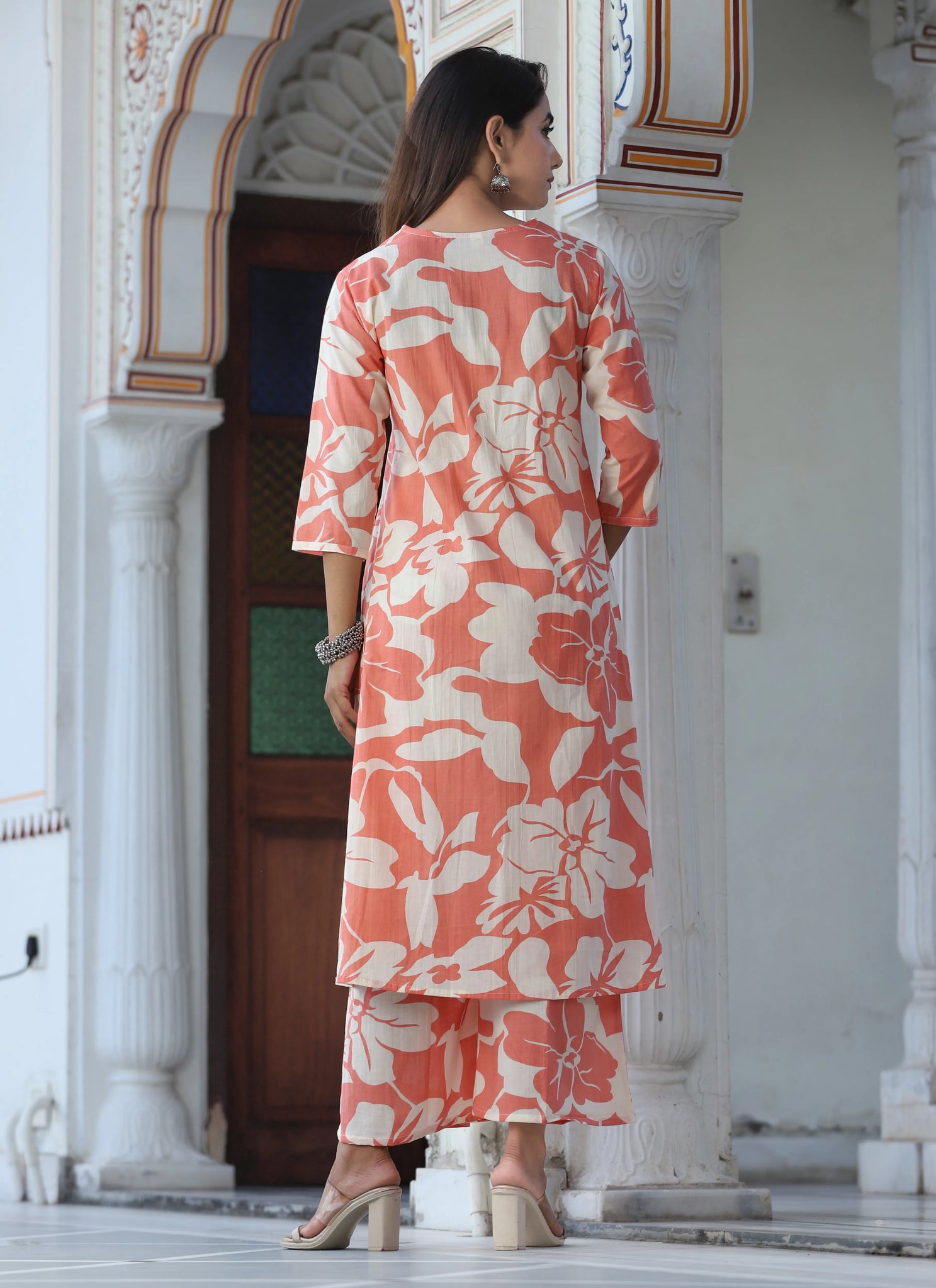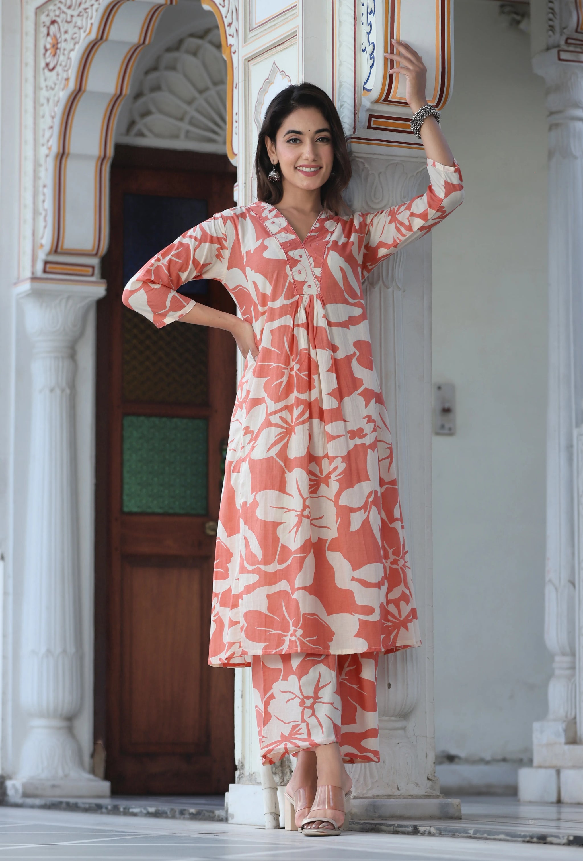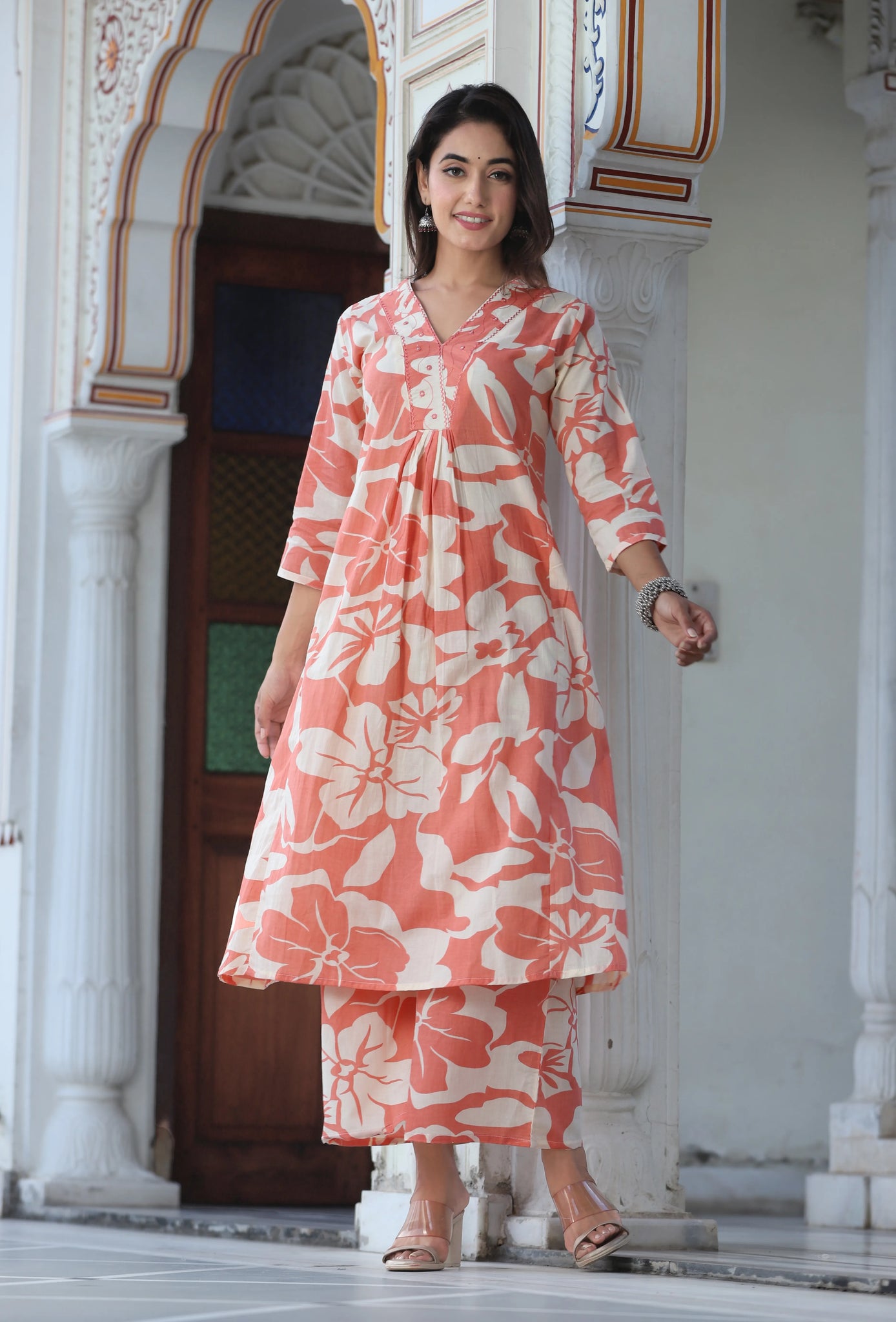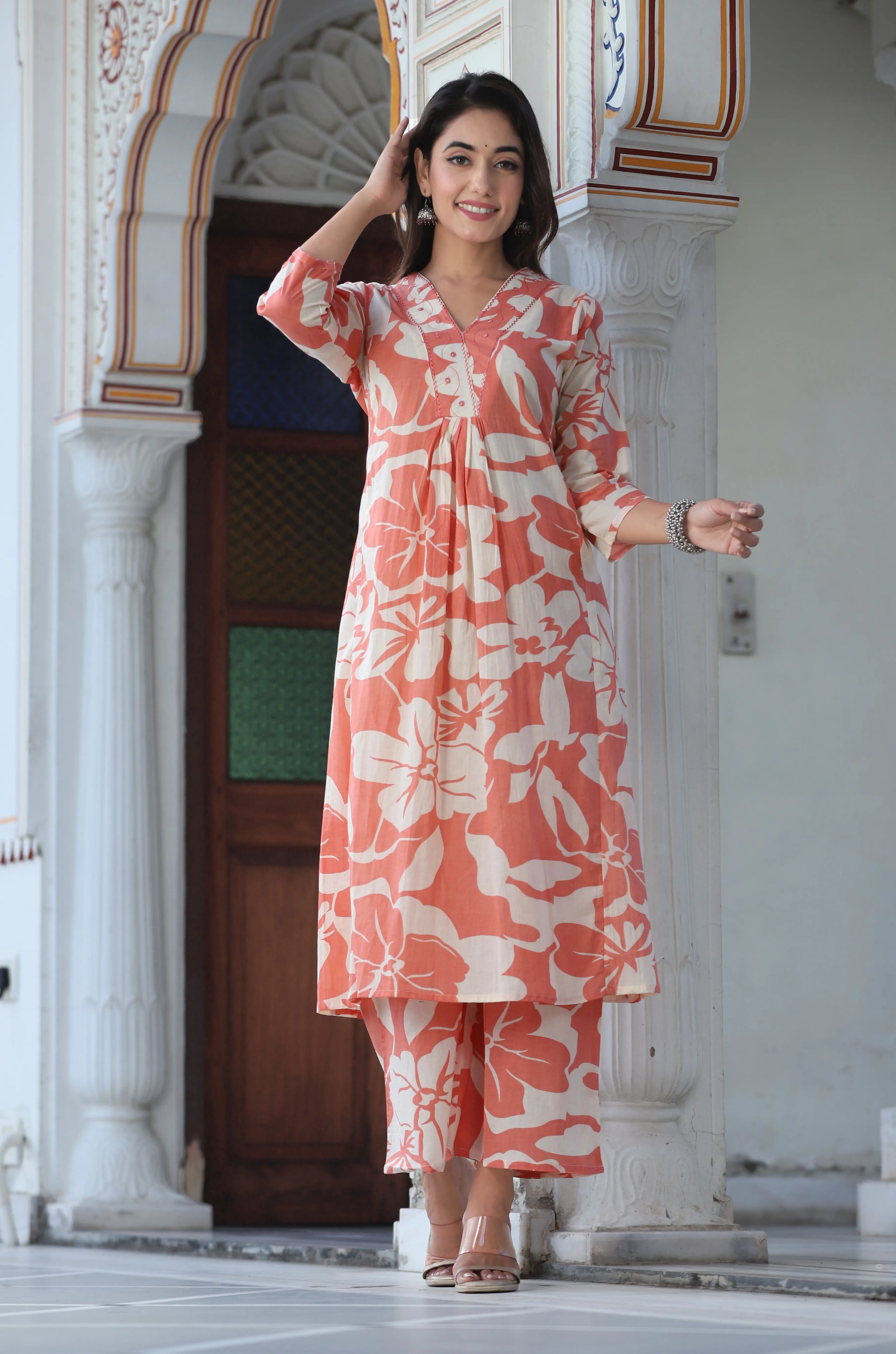 This peach floral printed co-ord set is a perfect blend of comfort and style, ideal for a casual or semi-formal outing. The kurta features a bold floral print and a flattering V-neck, designed with a long straight hem for a sleek look. Paired with printed trousers that offer a comfortable slip-on closure, partially waistband with a drawstring, and made from soft cotton fabric, this set promises a relaxed yet polished look.